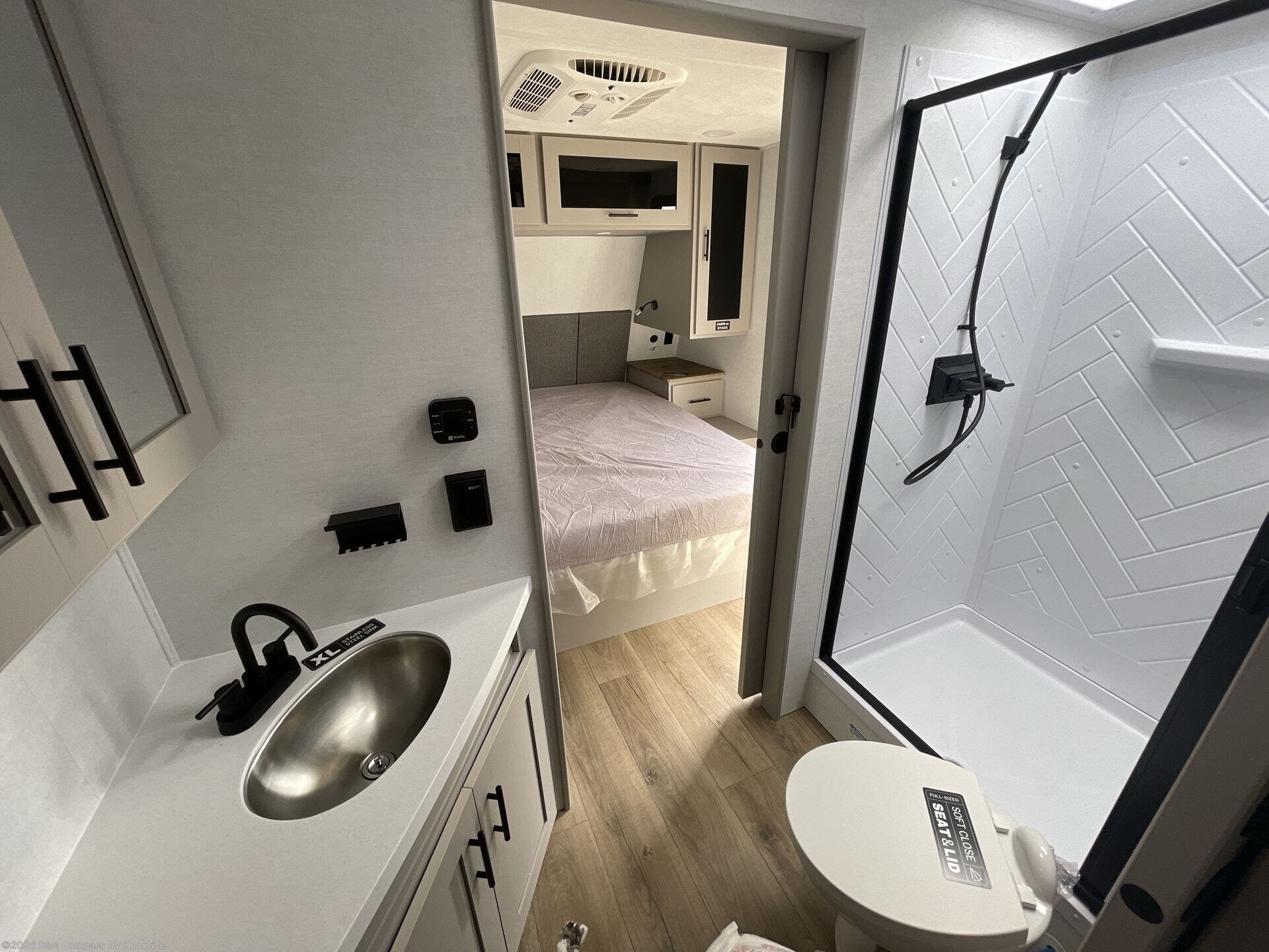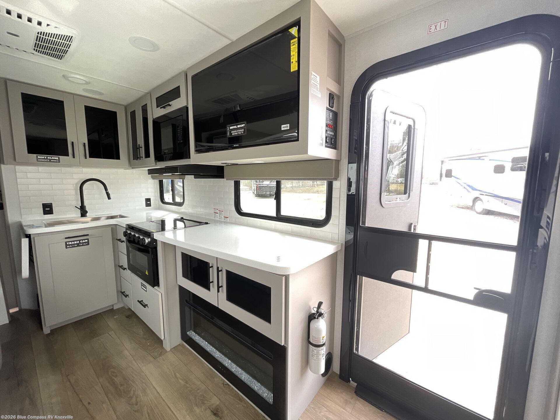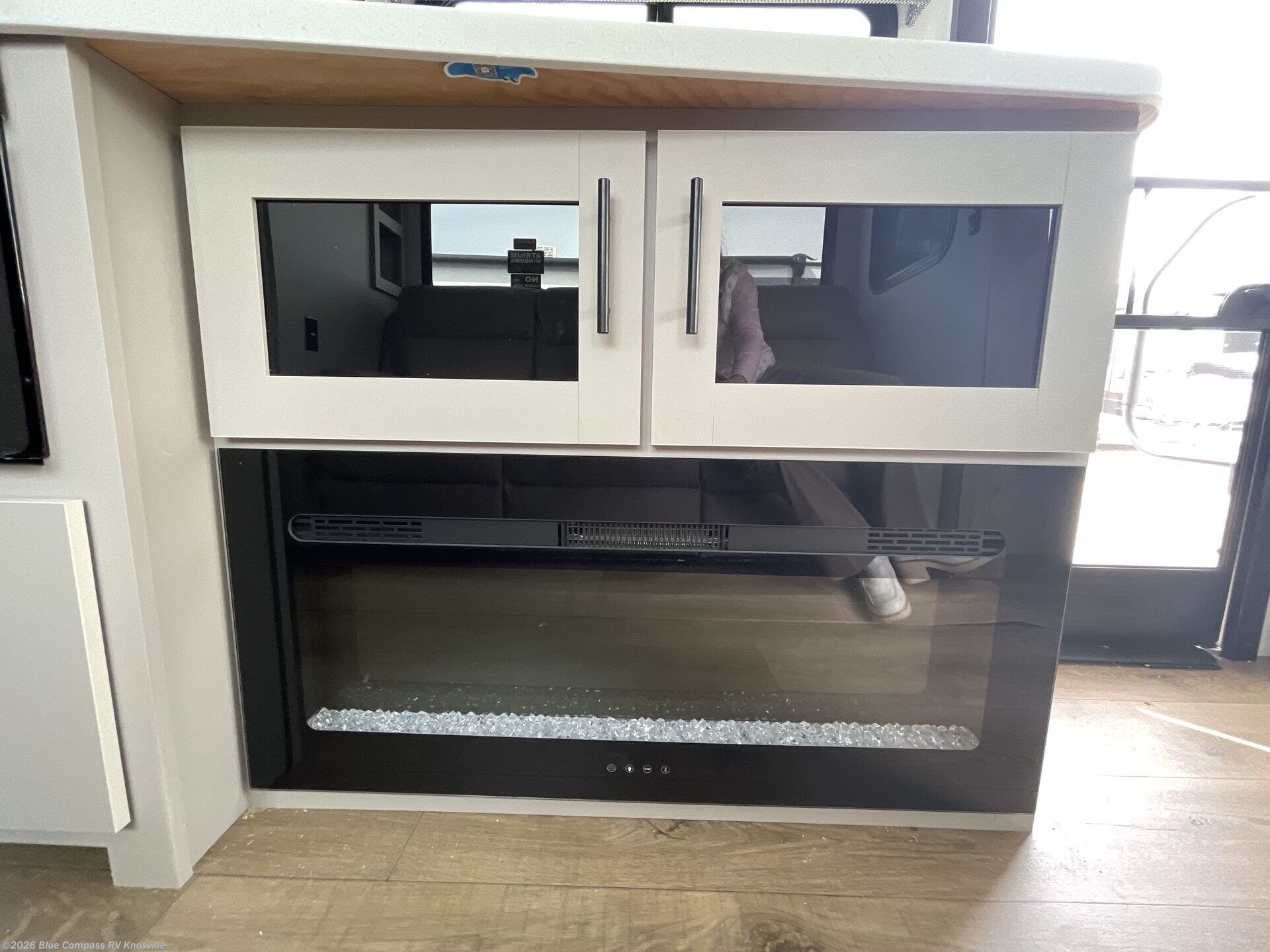 Grab your hiking boots and your sense of adventure for fun camping trips in this single slide out travel trailer. The rear booth dinette includes overhead storage for your things and the sofa slide out is in great view of the 40" HDTV. There is also a fireplace here that will make your space feel more like home plus more storage space, including a pantry with pull out trays and storage above the 10 cu. ft. 12V refrigerator. A walk-through bath will take you to the front master bedroom with a queen bed, wardrobe nightstands, plus its own exterior entry door!