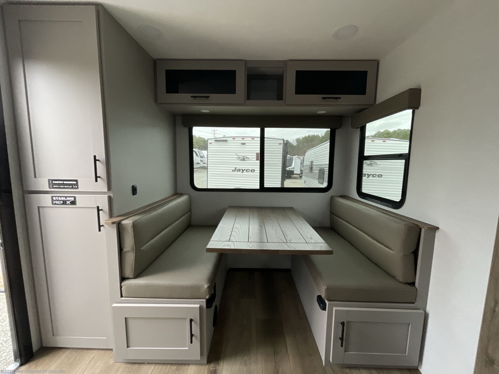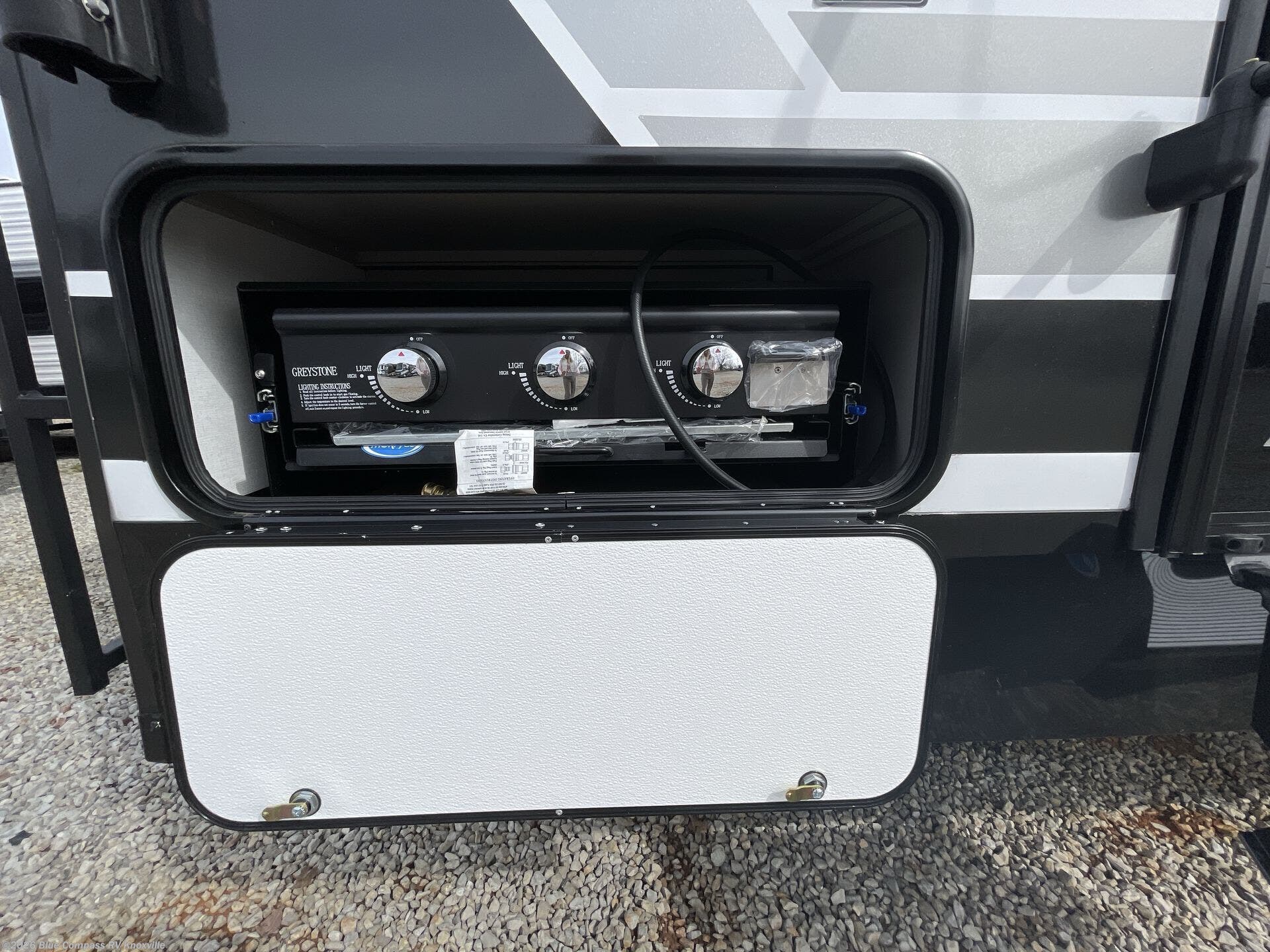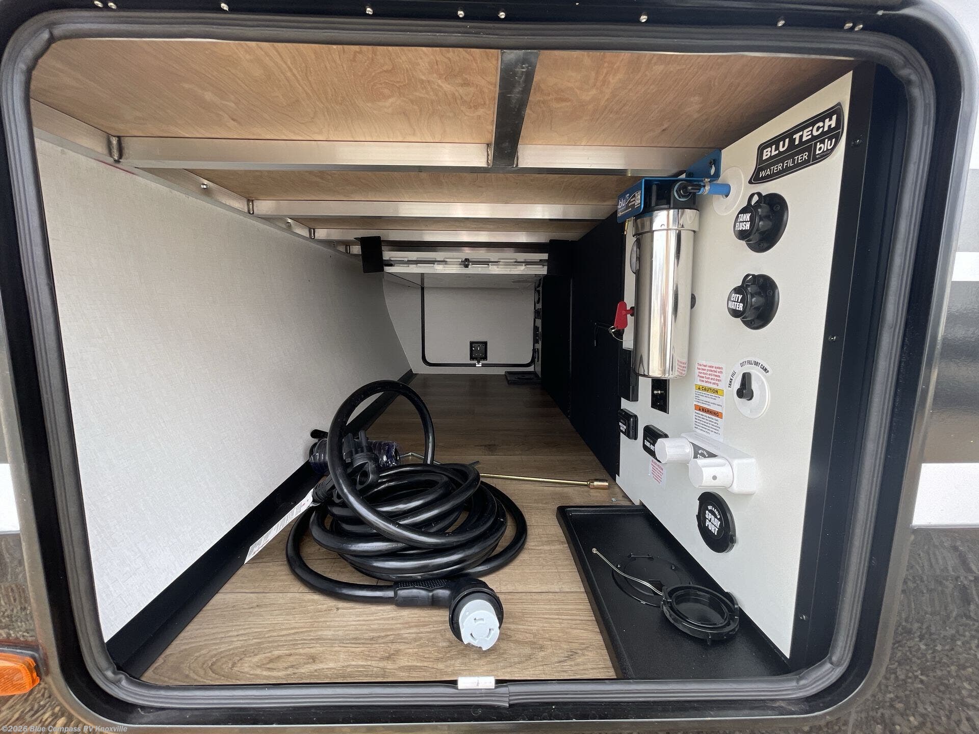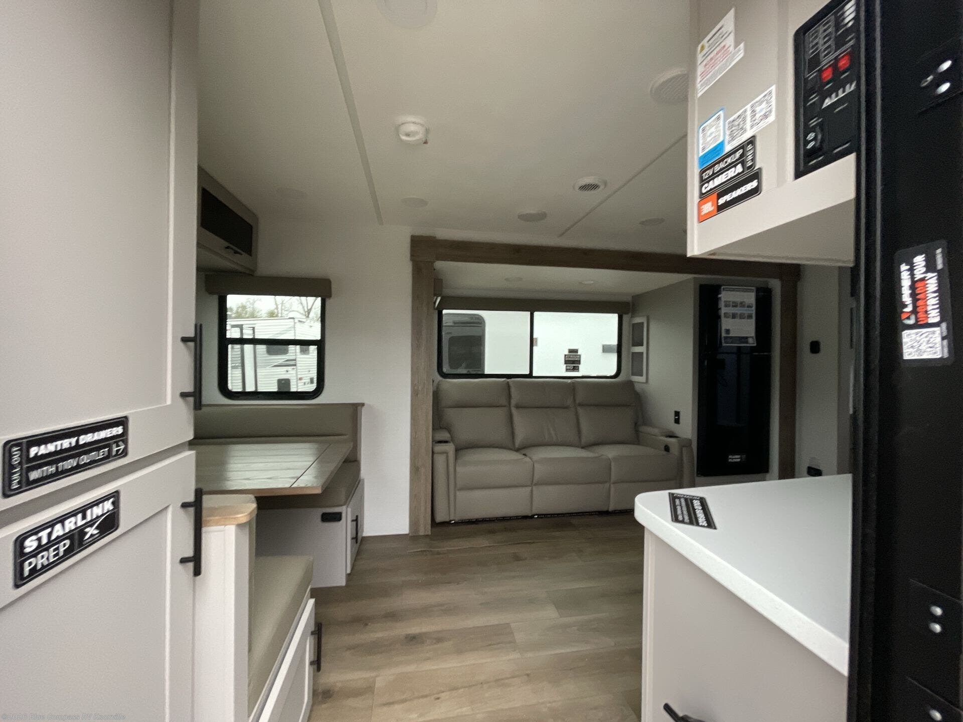 Grab your hiking boots and your sense of adventure for fun camping trips in this single slide out travel trailer. The rear booth dinette includes overhead storage for your things and the sofa slide out is in great view of the 40" HDTV. There is also a fireplace here that will make your space feel more like home plus more storage space, including a pantry with pull out trays and storage above the 10 cu. ft. 12V refrigerator. A walk-through bath will take you to the front master bedroom with a queen bed, wardrobe nightstands, plus its own exterior entry door!