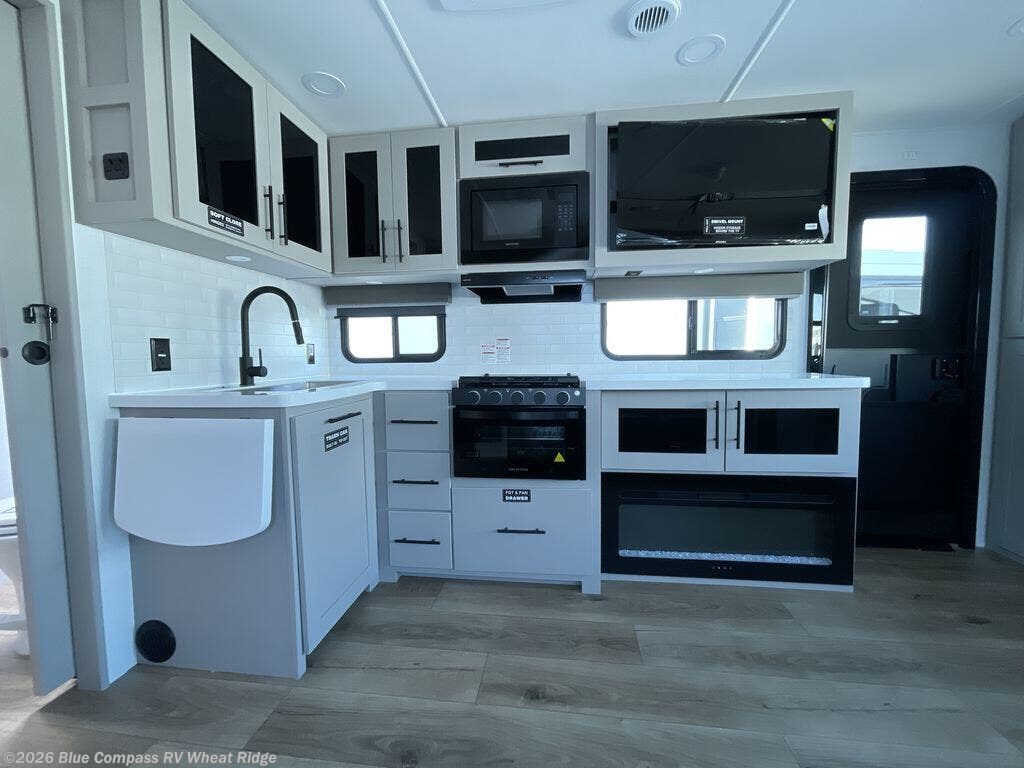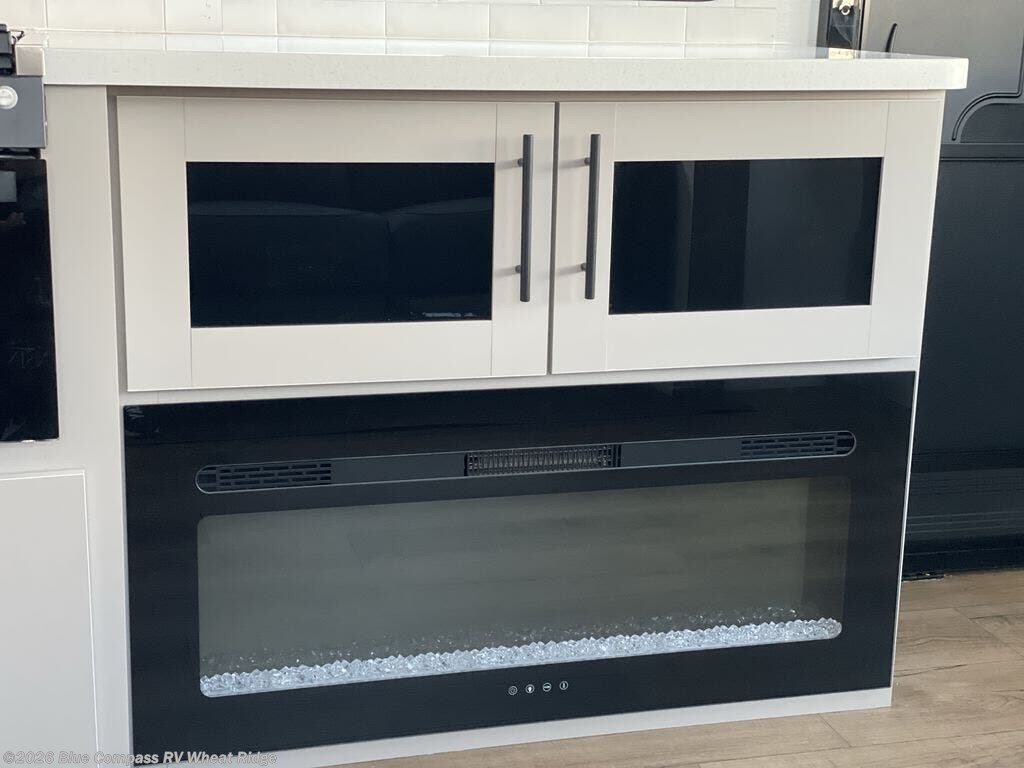 Grab your hiking boots and your sense of adventure for fun camping trips in this single slide out travel trailer. The rear booth dinette includes overhead storage for your things and the sofa slide out is in great view of the 40" HDTV. There is also a fireplace here that will make your space feel more like home plus more storage space, including an entryway pantry and storage above the 10 cu. ft. 12V refrigerator. A walk-through bath will take you to the front master bedroom with a queen bed, wardrobe nightstands, plus its own exterior entry door!