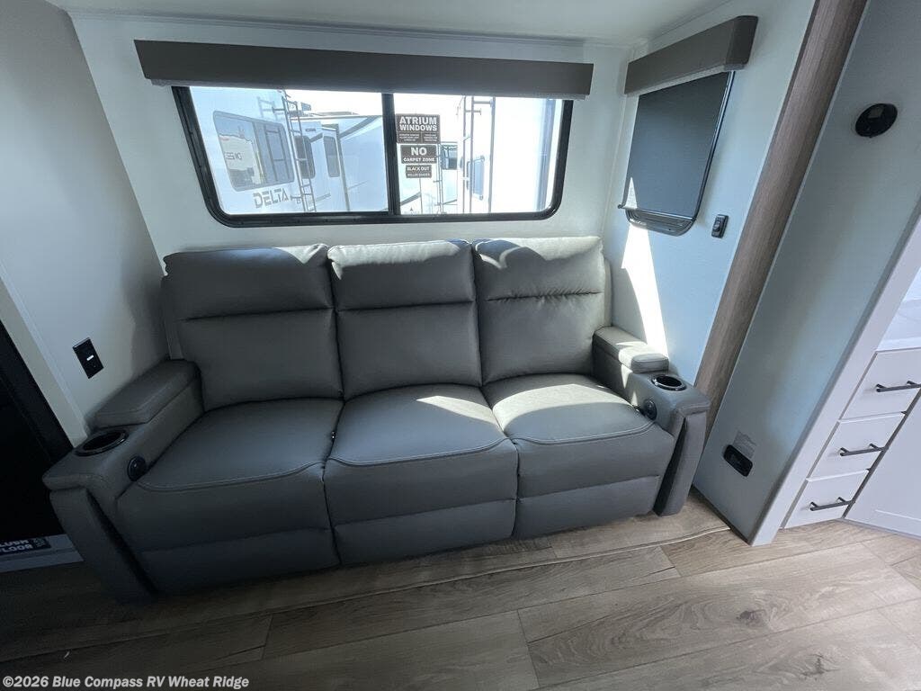 Form and function works together with every one of these Alliance RV Delta travel trailers! They are built with a walk-on roof with a seamless PVC roof covering, Mylar reinforced exterior seals, and a heated and enclosed underbelly to protect your unit in all seasons. The commercial grade vinyl flooring will be easy to clean and the oversized atrium windows throughout let in plenty of natural sunlight. With 62 cu. ft. of drop frame pass-through storage, you can bring along all of your essential camping gear plus it has USB charging for more convenience. There are many at home interior conveniences including a Bluetooth speaker, USB charging throughout, and even a pull-out kitchen trash can. Come find your favorite model today!