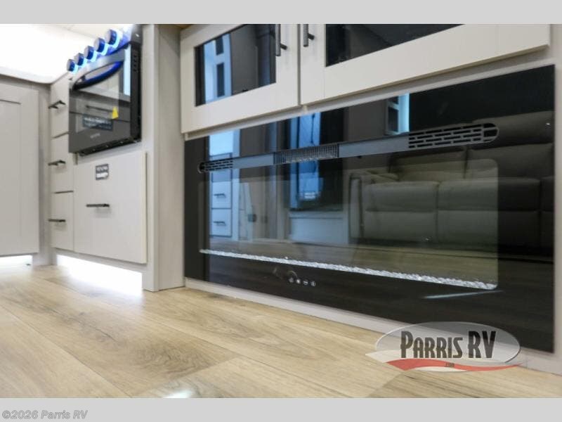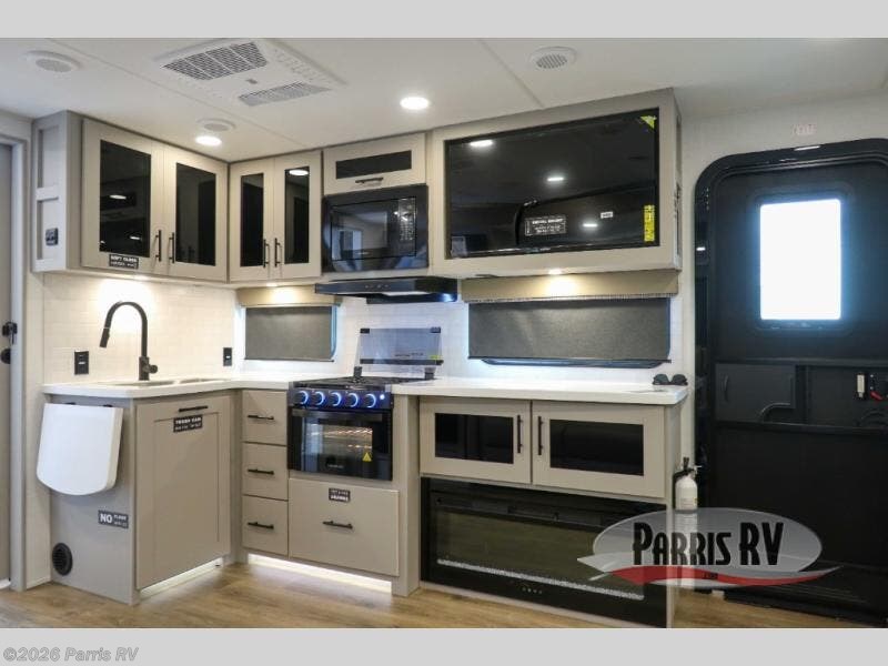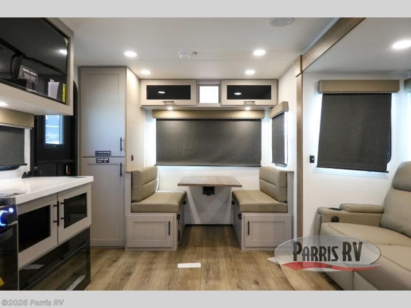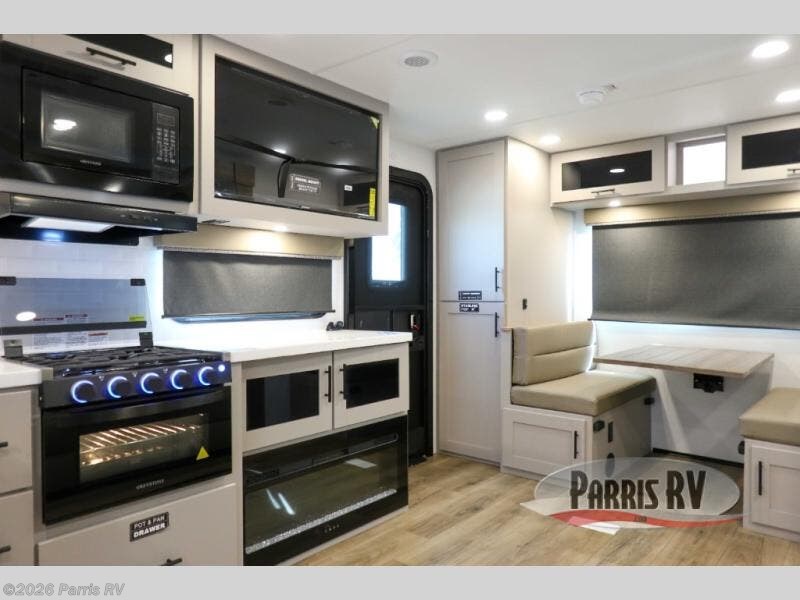 Grab your hiking boots and your sense of adventure for fun camping trips in this single slide out travel trailer. The rear booth dinette includes overhead storage for your things and the sofa slide out is in great view of the 40" HDTV. There is also a fireplace here that will make your space feel more like home plus more storage space, including a pantry with pull out trays and storage above the 10 cu. ft. 12V refrigerator. A walk-through bath will take you to the front master bedroom with a queen bed, wardrobe nightstands, plus its own exterior entry door!