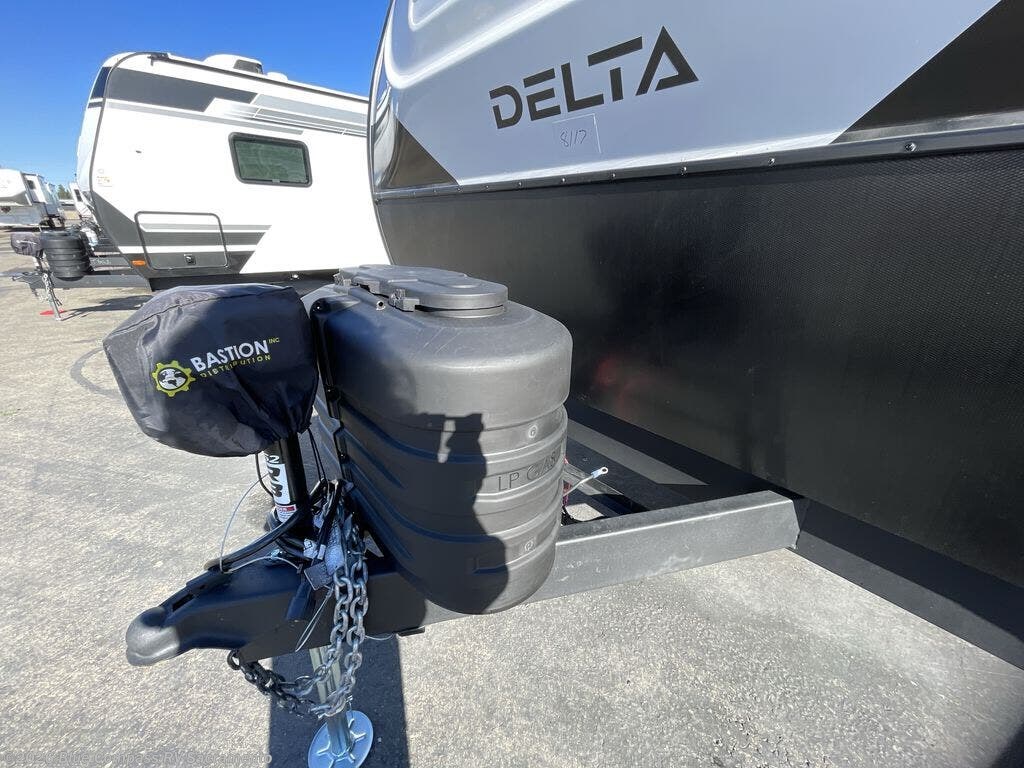 You will love all of your adventures with this Delta travel trailer in tow! This unit is perfect for a couple or even a family of four with a queen bed in the front private bedroom and also using the U-shaped dinette once converted for more sleeping space. The U-shaped dinette is great for gathering for meals, a board game or game of cards, and the sofa is directly opposite a 40" HDTV which makes viewing enjoyable. You can easily prepare all of your favorite meals and snacks with the kitchen amenities provided inside. A three burner range allows you to easily cook indoors, or you can cook outside using the outdoor griddle/grill if you like. There is a 10 cu. ft. 12V refrigerator to keep all of your perishables and drinks nice and cold, plus a large sink for dishes and cleaning up, and a convenient pull-out trash can and flip-up counter extension as well. You will also appreciate the full rear bath featuring a 30" x 36" shower, toilet, vanity with sink, and linen cabinet for your towels and toiletries.