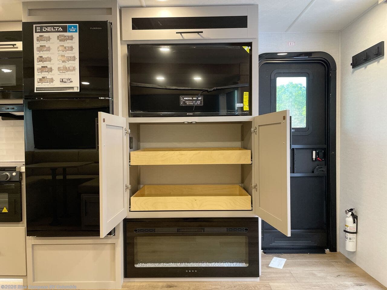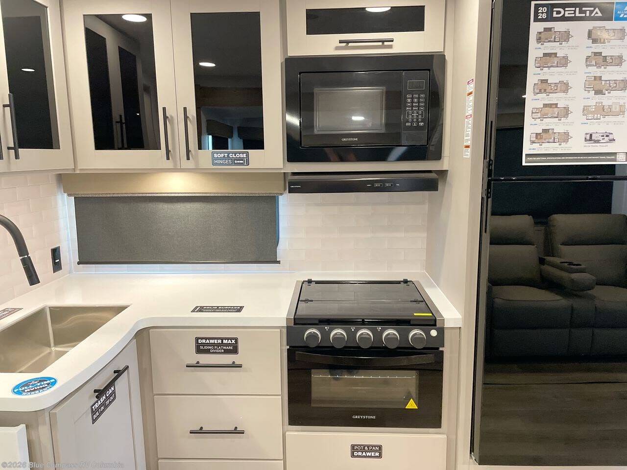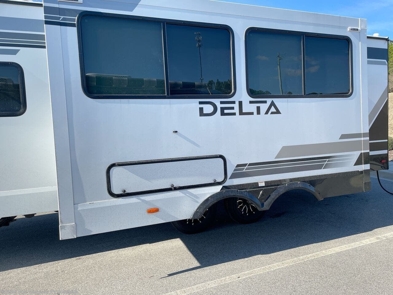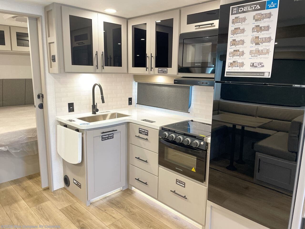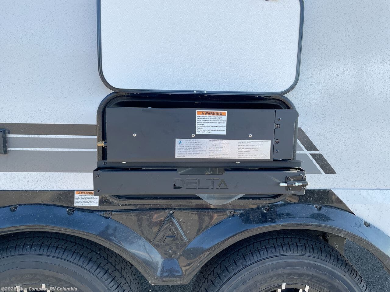 You will love all of your adventures with this Delta travel trailer in tow! This unit is perfect for a couple or even a family of four with a queen bed in the front private bedroom and also using the U-shaped dinette once converted for more sleeping space. The U-shaped dinette is great for gathering for meals, a board game or game of cards, and the sofa is directly opposite a 40" HDTV which makes viewing enjoyable. You can easily prepare all of your favorite meals and snacks with the kitchen amenities provided inside. A three burner range allows you to easily cook indoors, or you can cook outside using the outdoor griddle/grill if you like. There is a 10 cu. ft. 12V refrigerator to keep all of your perishables and drinks nice and cold, plus a large sink for dishes and cleaning up, and a convenient pull-out trash can and flip-up counter extension as well. You will also appreciate the full rear bath featuring a 30" x 36" shower, toilet, vanity with sink, and linen cabinet for your towels and toiletries.