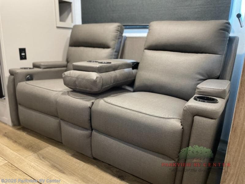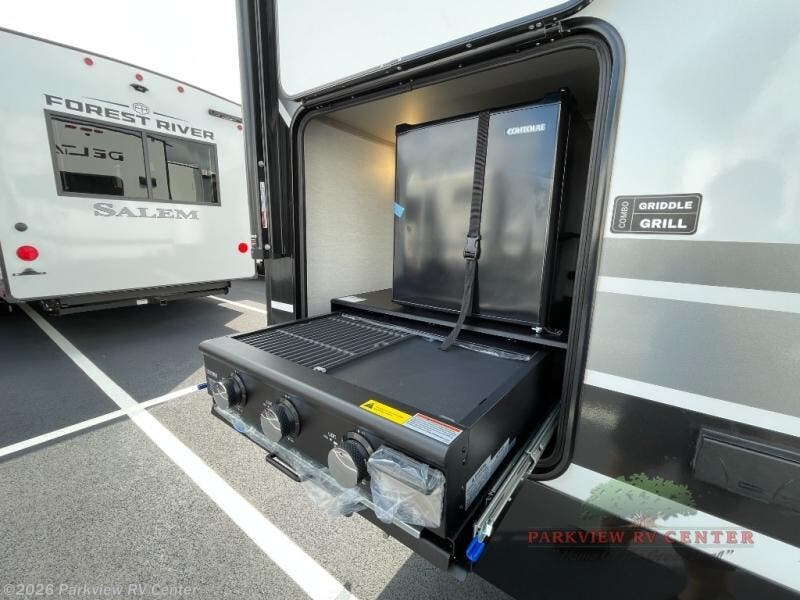 Head to your favorite camping spot in this double slide out travel trailer! You can set up the 19' awning when you arrive, then start lunch on the exterior griddle. There is also an exterior refrigerator for cold drinks! If the weather isn't cooperating, the rear kitchen includes generous counter space to prep meals and all the appliances needed. A booth dinette inside provides a place to dine together, or you can choose the optional table and chairs if you prefer that seating arrangement. You're sure to enjoy the theater seat in direct view of the 40" TV for movie nights, and when you're ready to call it a night, the queen bed in the front bedroom will provide a great night's rest.