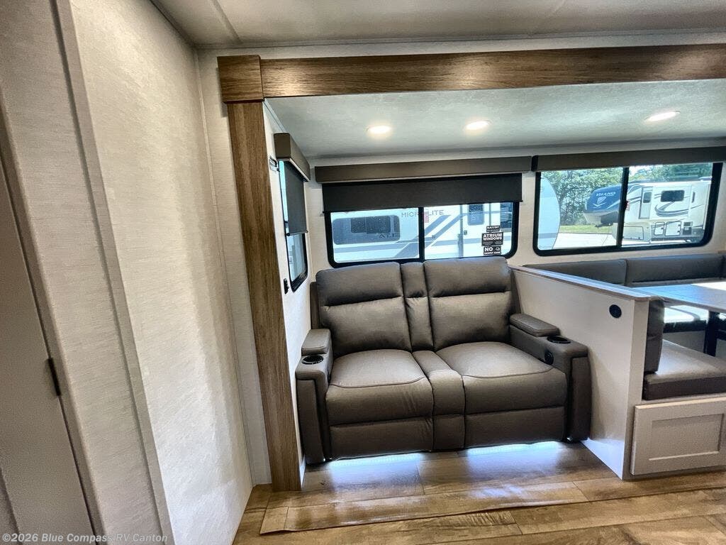 The perfect travel trailer for a larger family or one that enjoys traveling with friends! One large slide opens up the interior living space nice and features a U-shaped dinette and theater seating to provide plenty of seating for everyone. Enjoy the 40" HDTV opposite the seating for a movie indoors, and game night will be easy with everyone at the dinette which can also be converted for added sleeping if needed. The double entry doors will make loading and unloading simple and allows you to easily slip in and out of the private bedroom for a morning walk. You can easily prepare all of your favorite meals and snacks with the kitchen amenities provided inside. A three-burner range allows you to easily cook indoors, or you can enjoy cooking outside using the outdoor griddle/grill if you like. There is a 10-cu. ft. 12V refrigerator to keep all of your perishables and drinks nice and cold, plus a large sink for dishes and cleaning up, and there is also a flip-up counter extension for more prep space. You will also appreciate the rear corner bath featuring a 30" x 36" shower, vanity with sink, soft close porcelain toilet with foot flush, and linen cabinet for your towels.