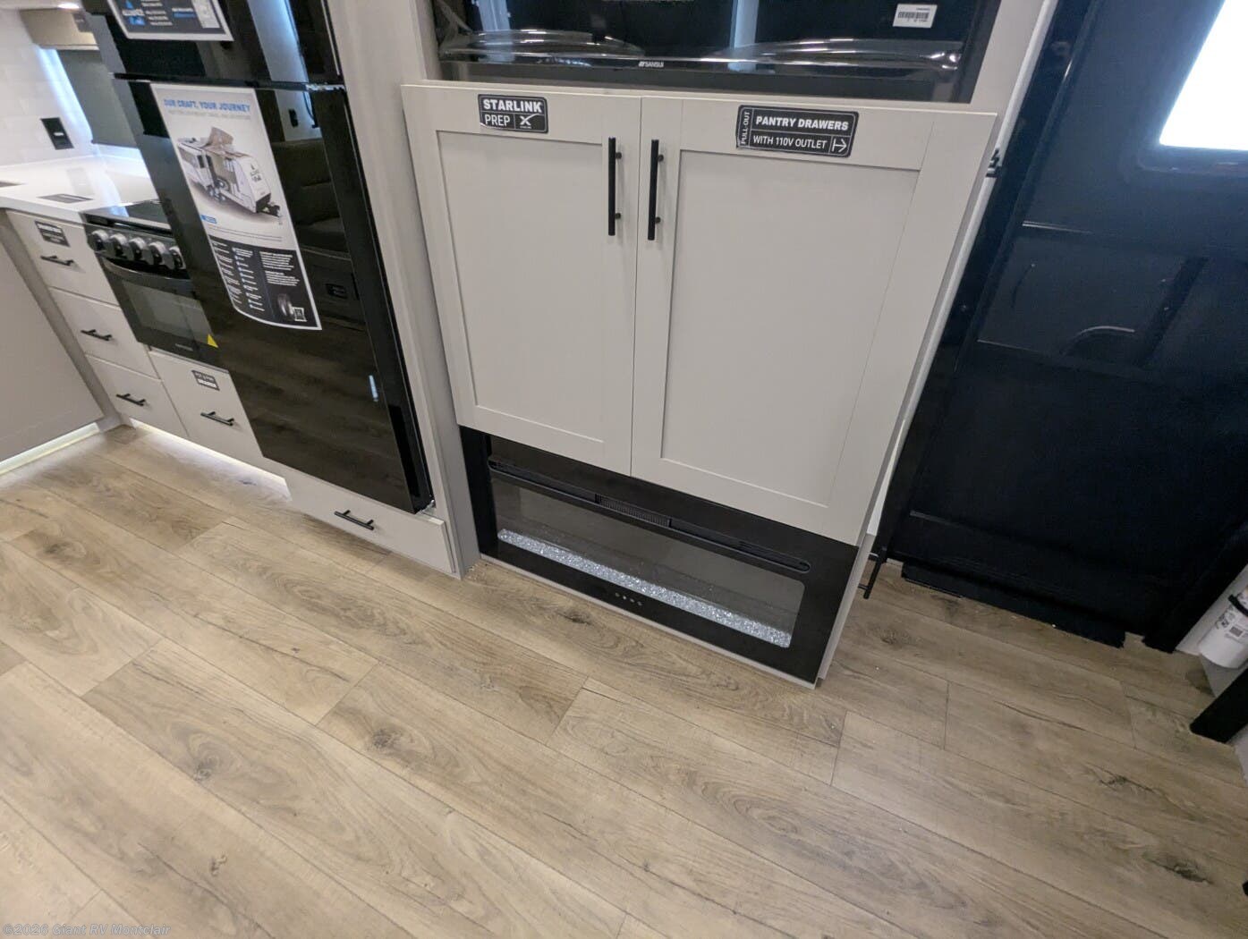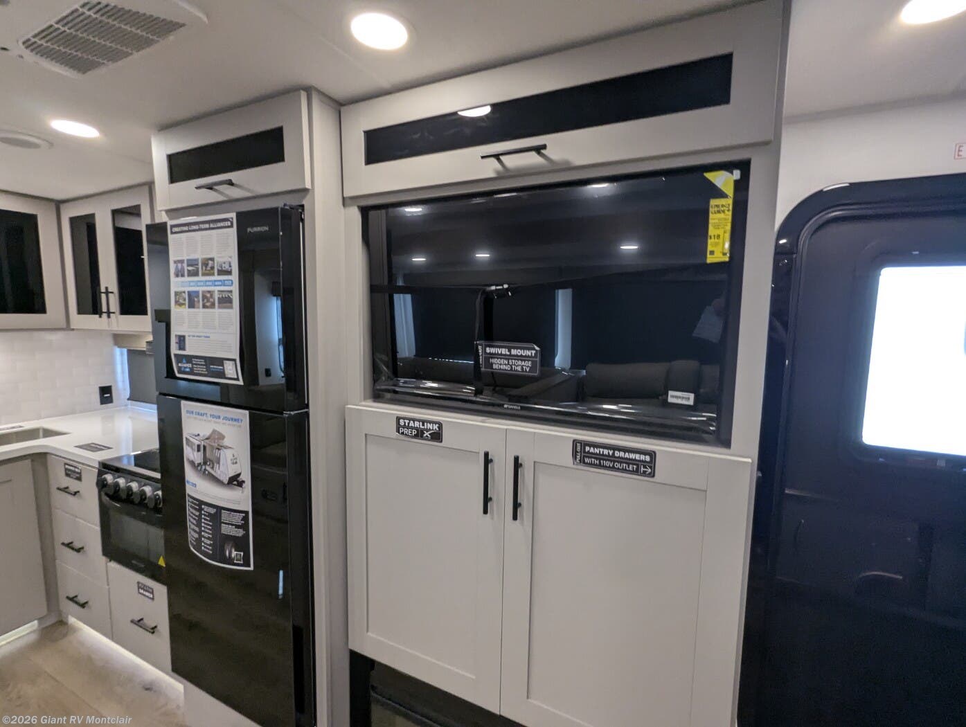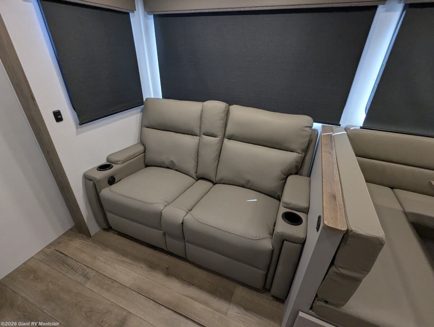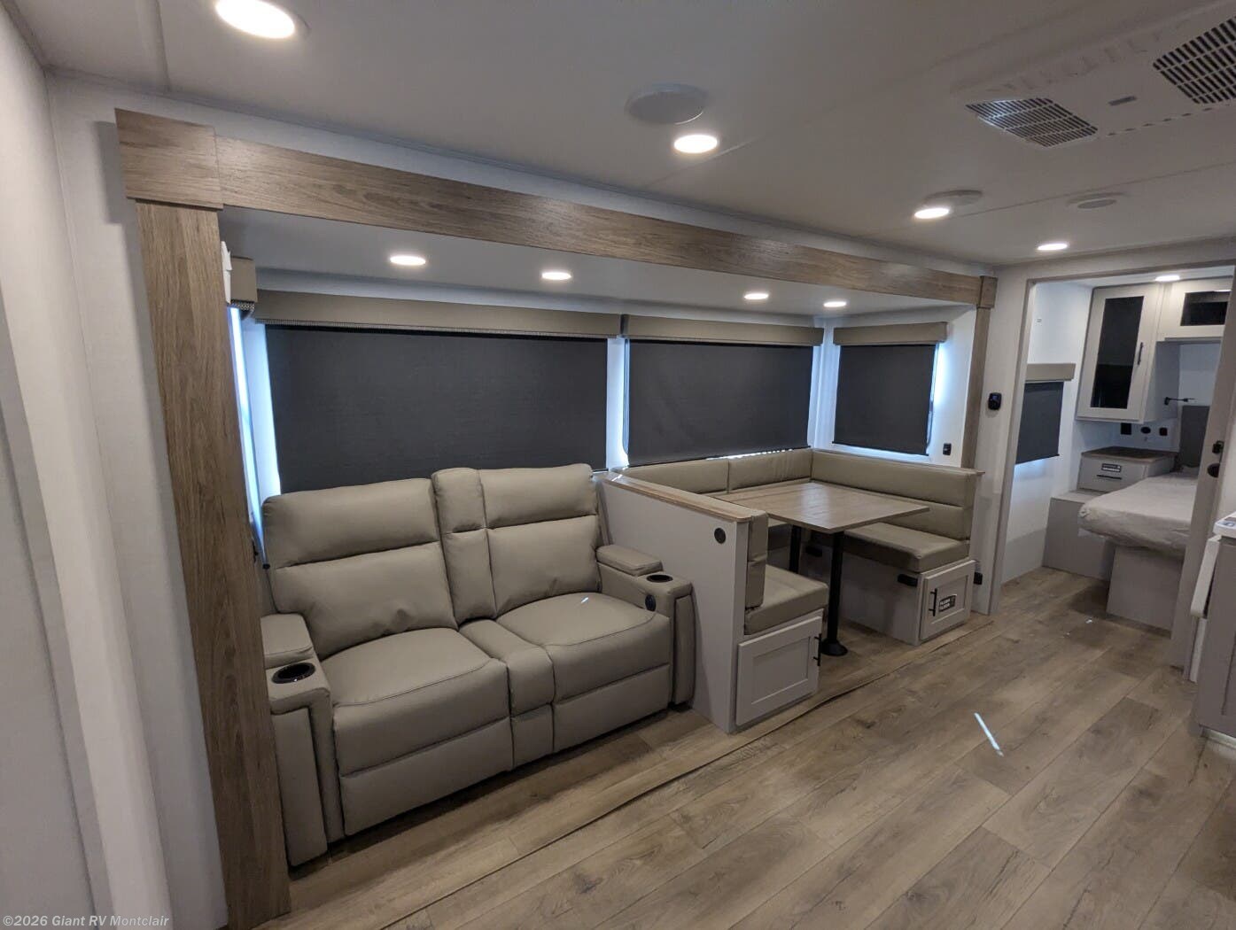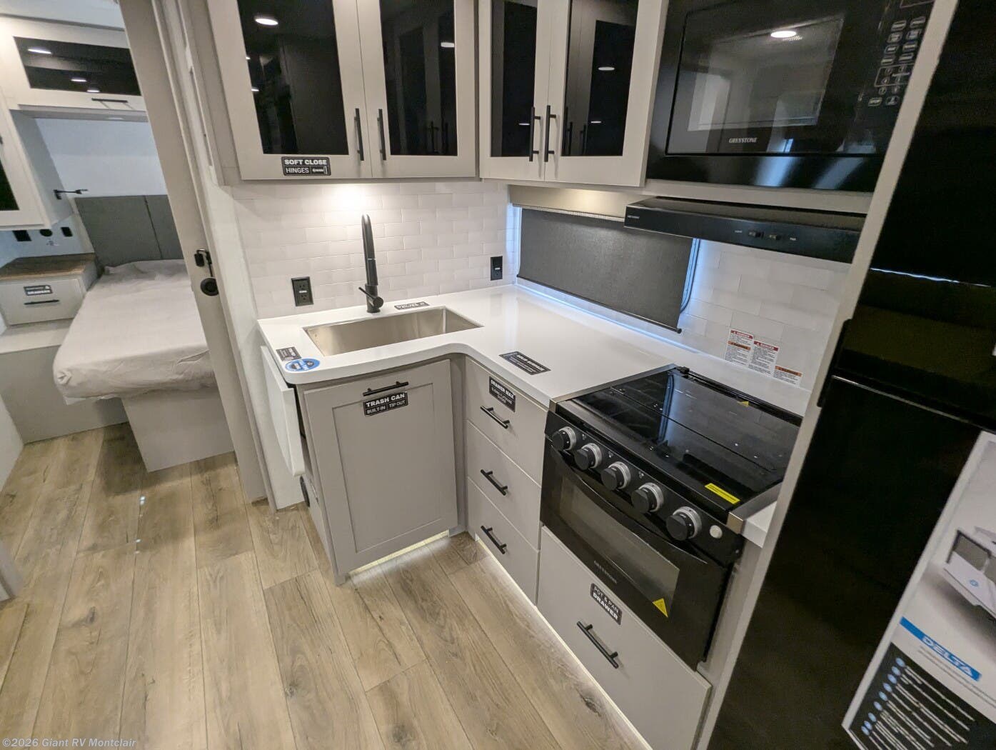 • Spacious Slide-Out Living & Kitchen Area featuring theater seating, a 40" HDTV, 10 cu. ft. refrigerator, 3-burner cooktop, large sink, and smart storage for everyday convenience.