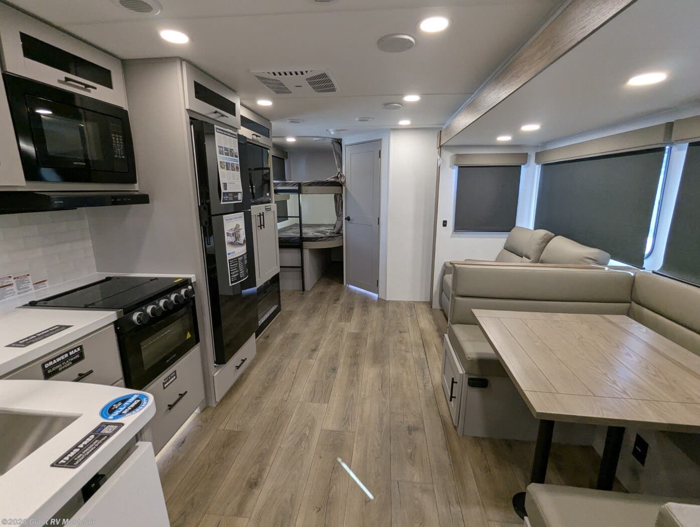 • Family Bunkhouse Layout with oversized rear bunks, a front queen bed, and convertible U-shaped dinette — providing flexible sleeping for kids, guests, or the whole family.