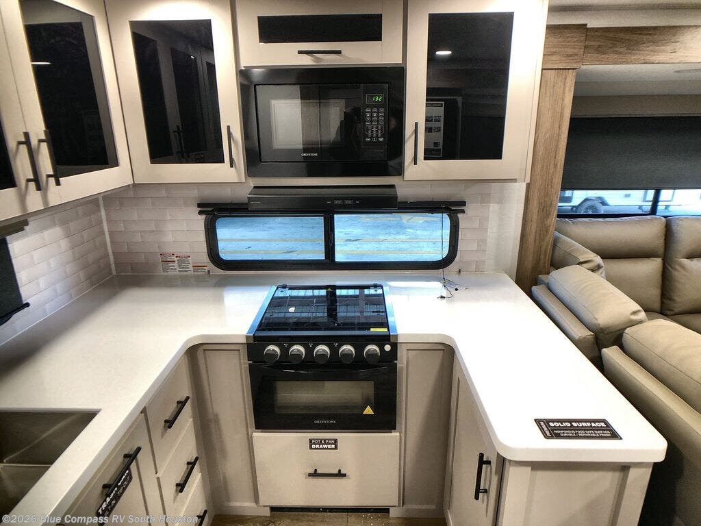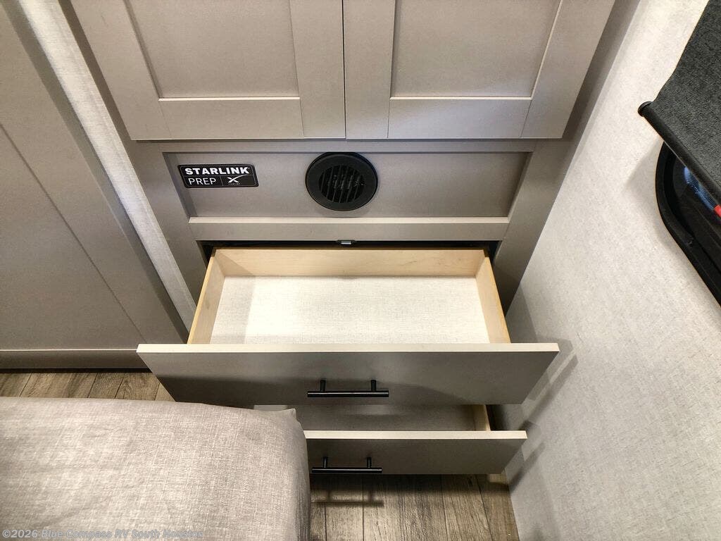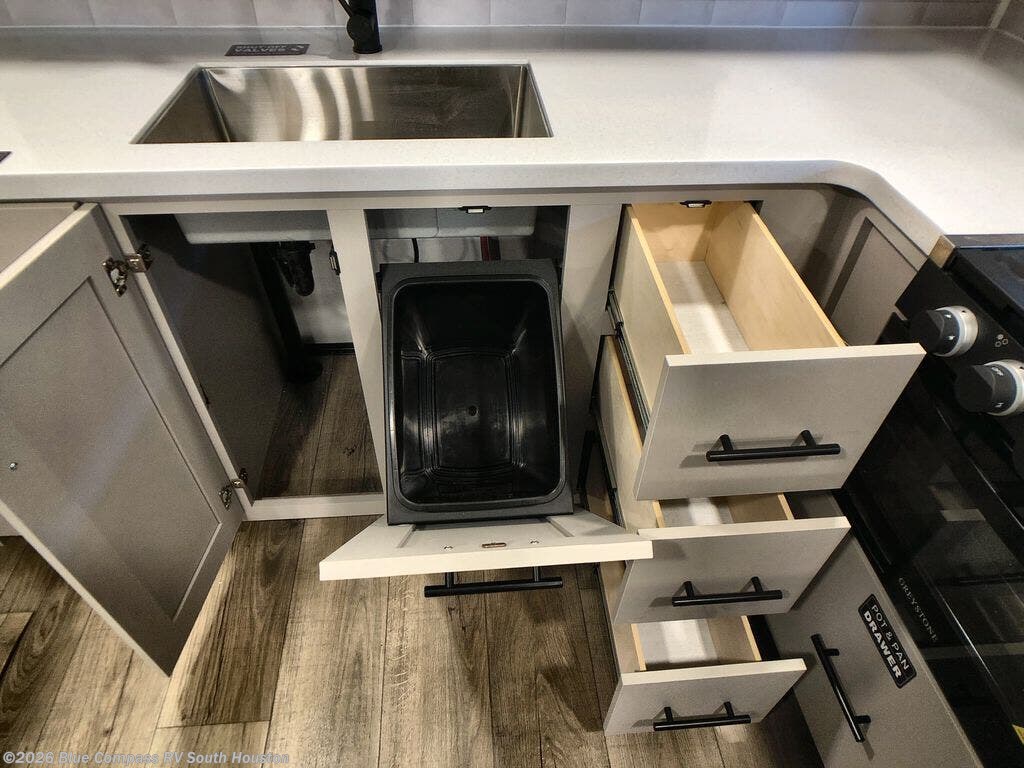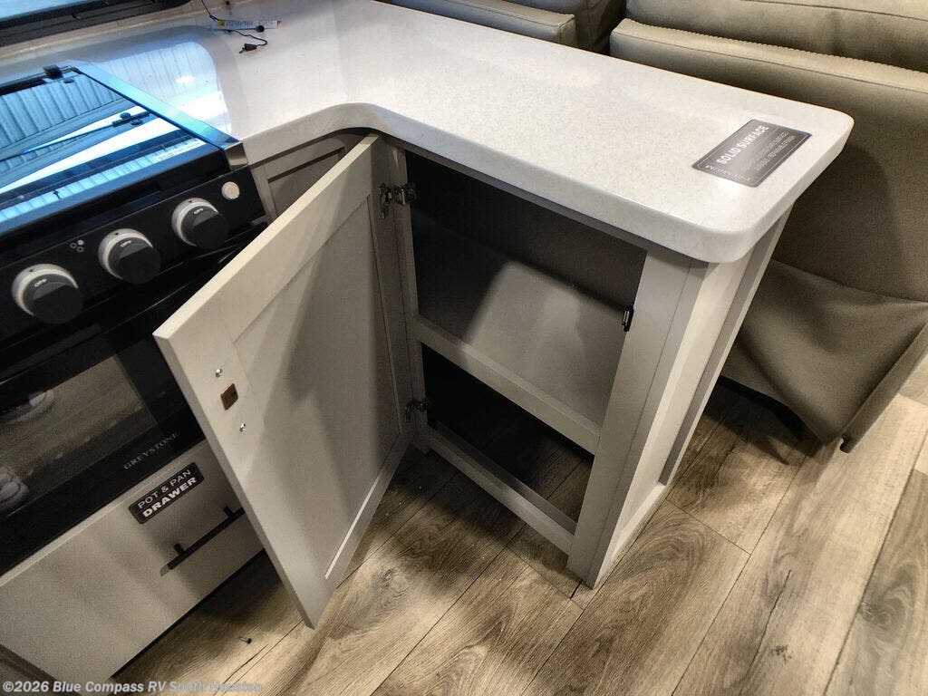 At the front, you’ll find a private bedroom featuring a spacious 60" x 80" bed, perfect for a restful night’s sleep after a day of adventure. Wardrobe nightstands on each side provide handy storage for your essentials and clothing, with an additional wardrobe nearby for even more space. Just down the hall, the full bathroom means no more relying on campsite facilities, complete with a 30" x 36" shower, linen cabinets for towels and toiletries, and a soft-close porcelain toilet with foot flush for added comfort. In the center living area, relax in the L-shaped sofa within the slide-out while enjoying your favorite movie on the 55" TV positioned to the side. An opposing slide houses the dinette table, creating the perfect spot for meals or family board game nights. Nearby, you’ll find a 10 cu. ft. refrigerator and a pantry with a convenient pull-out tray to store groceries and dry goods. At the rear, the wrap-around kitchen provides generous counter space for meal prep, along with abundant overhead cabinetry and a three-burner range, ensuring the chef of the trip can cook comfortably and efficiently.