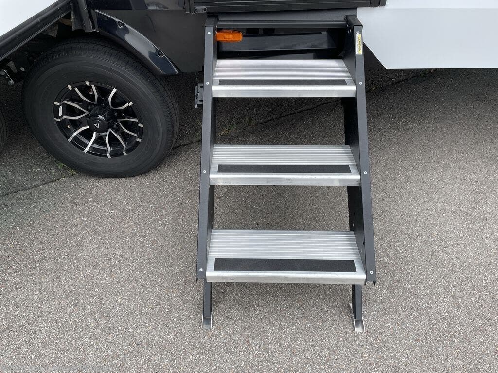 At the front, you’ll find a private bedroom featuring a spacious 60" x 80" bed, perfect for a restful night’s sleep after a day of adventure. Wardrobe nightstands on each side provide handy storage for your essentials and clothing, with an additional wardrobe nearby for even more space. Just down the hall, the full bathroom means no more relying on campsite facilities, complete with a 30" x 36" shower, linen cabinets for towels and toiletries, and a soft-close porcelain toilet with foot flush for added comfort. In the center living area, relax in the L-shaped sofa within the slide-out while enjoying your favorite movie on the 55" TV positioned to the side. An opposing slide houses the dinette table, creating the perfect spot for meals or family board game nights. Nearby, you’ll find a 10 cu. ft. refrigerator and a pantry with a convenient pull-out tray to store groceries and dry goods. At the rear, the wrap-around kitchen provides generous counter space for meal prep, along with abundant overhead cabinetry and a three-burner range, ensuring the chef of the trip can cook comfortably and efficiently.