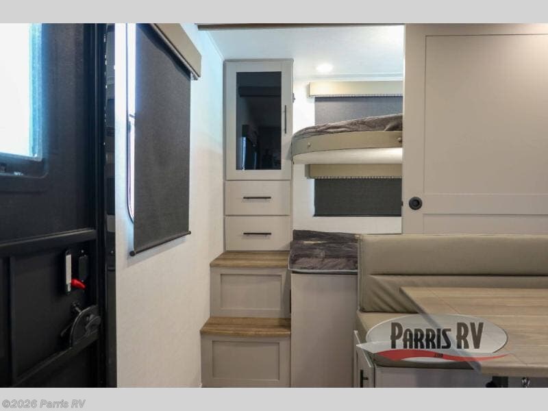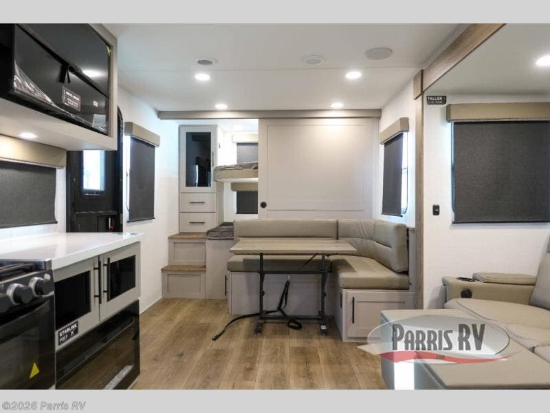 This Delta 291BH model offers a thoughtfully designed layout perfect for comfort and convenience on the road. At the front, you'll find a private bedroom featuring two nightstand wardrobes, and additional overhead storage for all your essentials. Moving through the walk-through bathroom, enjoy a 30" x 36" shower and a soft-close porcelain toilet with foot flush. The central living area is ideal for relaxing or entertaining, with a 68" theater seat that has the option to be a tri-fold sleeper sofa for added sleeping space if needed. Along with a L-shaped dinette, and a 36" ottoman, all centered around a 40" TV. At the rear we have, two 46" x 74" bunks with steps that provide extra-sleeping space and easy accessibility along with a wardrobe for added storage, making this RV perfect for families or group travel.
