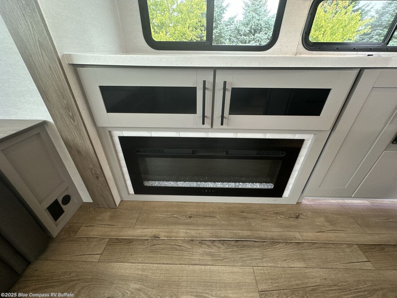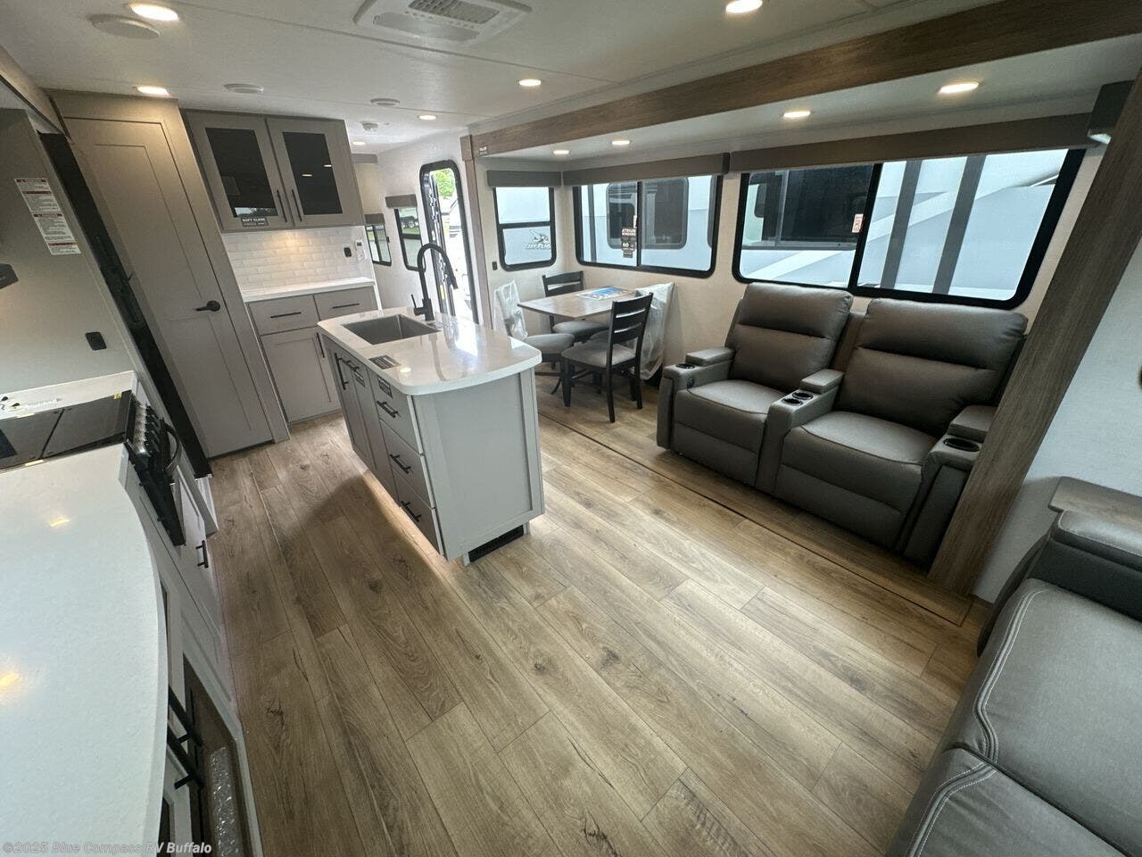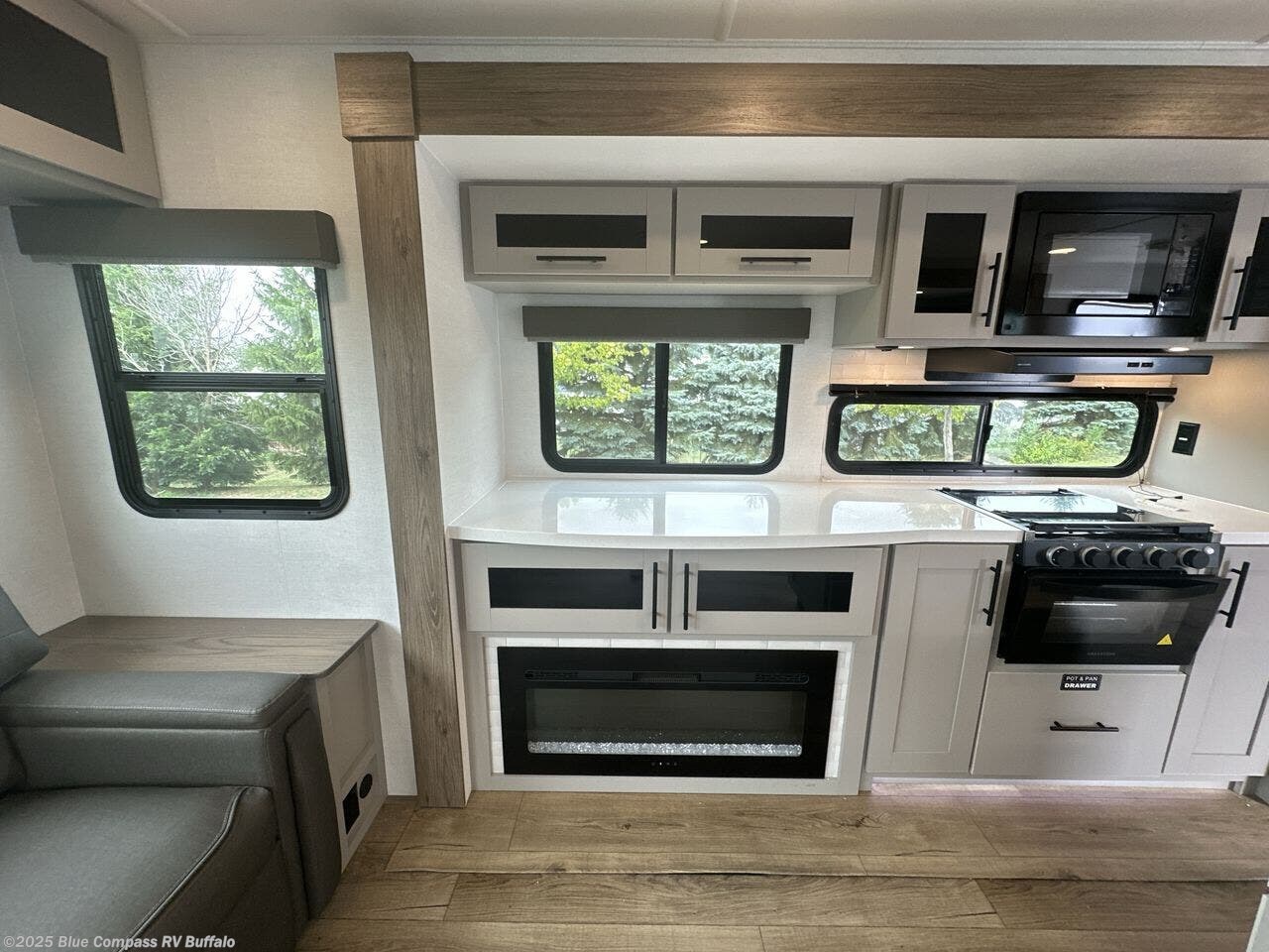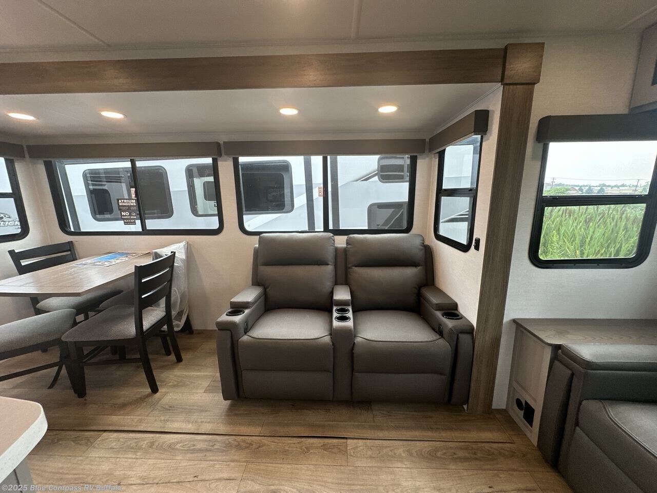 You will feel right at home camping in this travel trailer! The rear living area has a rear sofa and a set of theater seating conveniently across from the entertainment center with a 50" class HDTV above a pull-out fireplace storage for a cozy evening indoors. Prepare your best home cooked meals with the three burner cooktop, kitchen island which even has a tip-out trash can, and 10 cu. ft. 12V refrigerator. Enjoy your meals at the free standing dinette then either freshen up in the full bathroom with the 30" x 36" shower or head outside to relax under one of the two awnings. The front private bedroom has a queen bed for you to lay your head on at night and has wardrobe nightstands for your items!