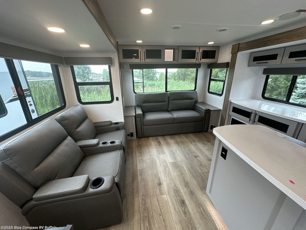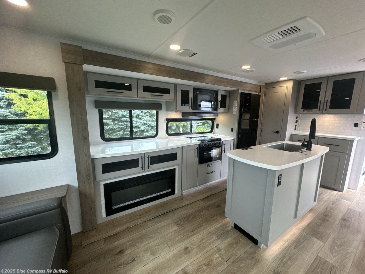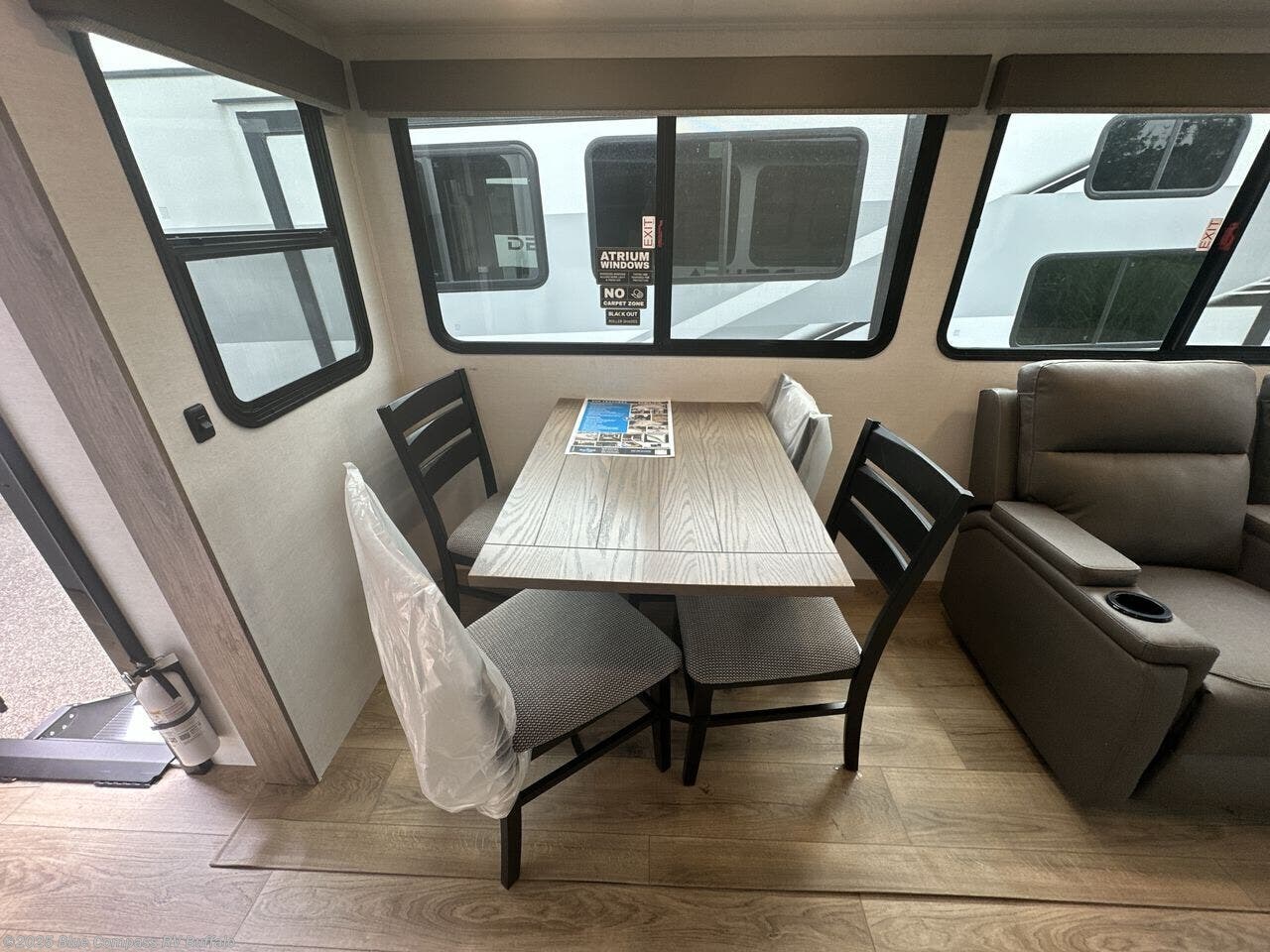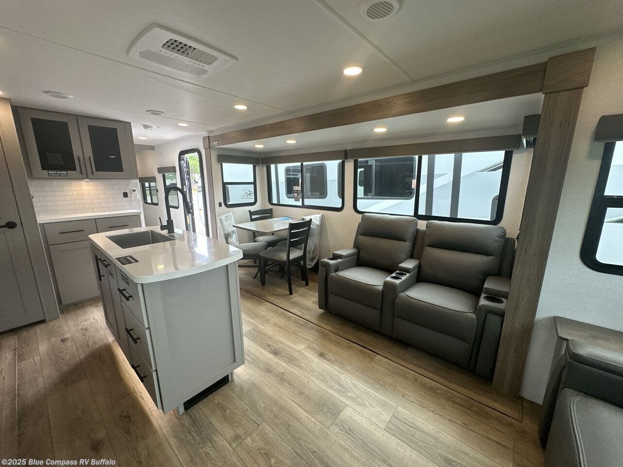 You will feel right at home camping in this travel trailer! The rear living area has a rear sofa and a set of theater seating conveniently across from the entertainment center with a 50" class HDTV above a pull-out fireplace storage for a cozy evening indoors. Prepare your best home cooked meals with the three burner cooktop, kitchen island which even has a tip-out trash can, and 10 cu. ft. 12V refrigerator. Enjoy your meals at the free standing dinette then either freshen up in the full bathroom with the 30" x 36" shower or head outside to relax under one of the two awnings. The front private bedroom has a queen bed for you to lay your head on at night and has wardrobe nightstands for your items!