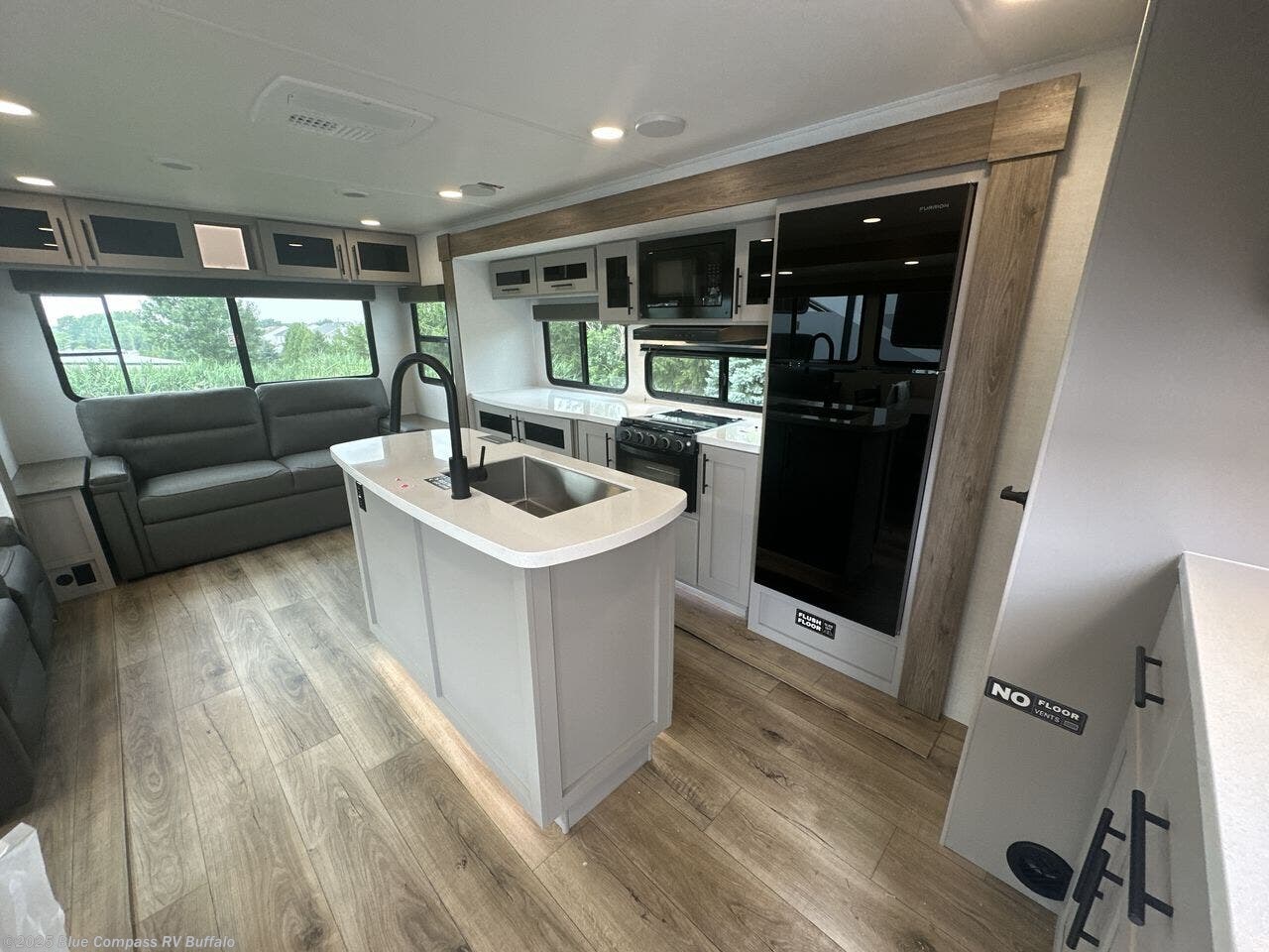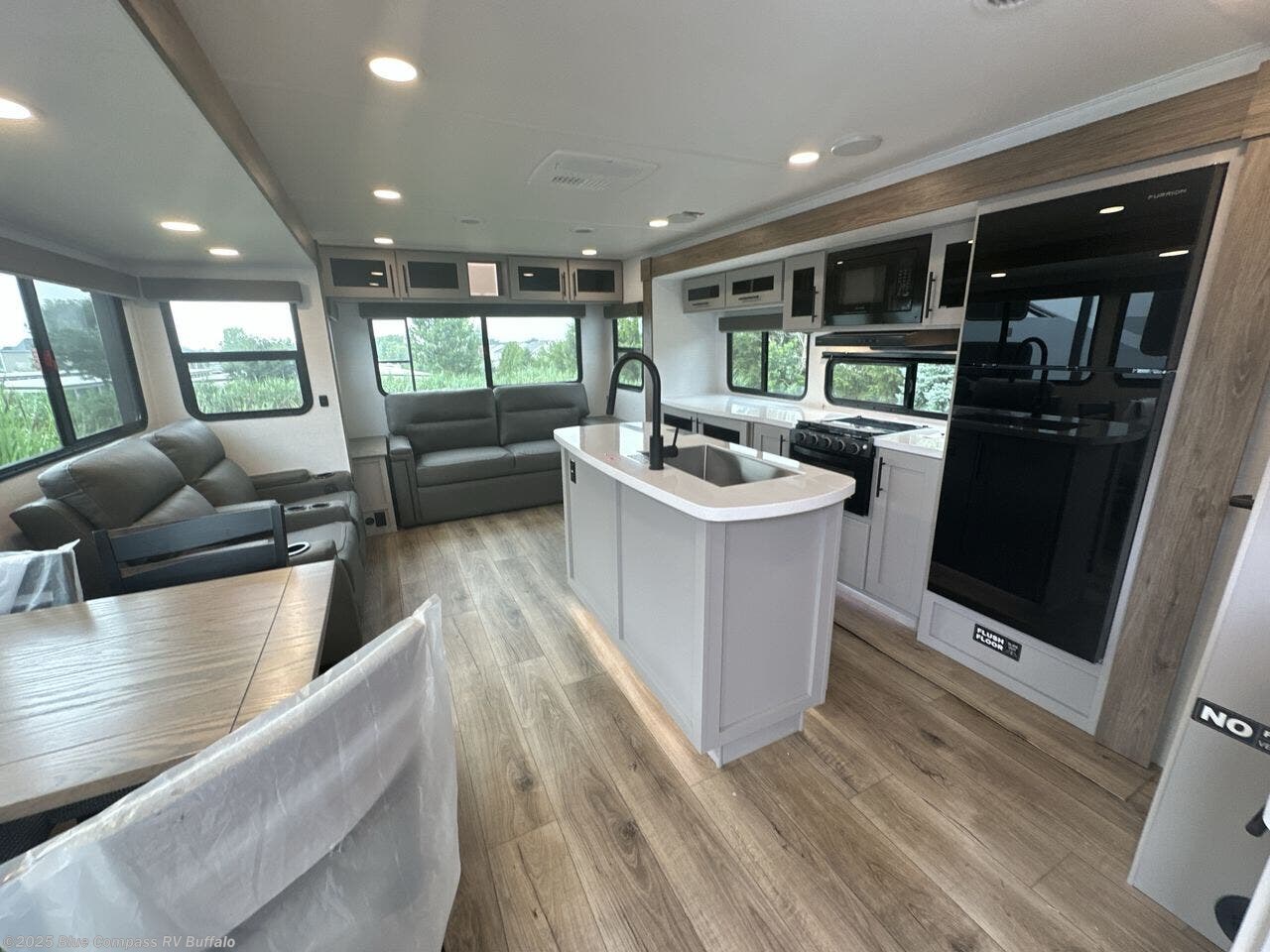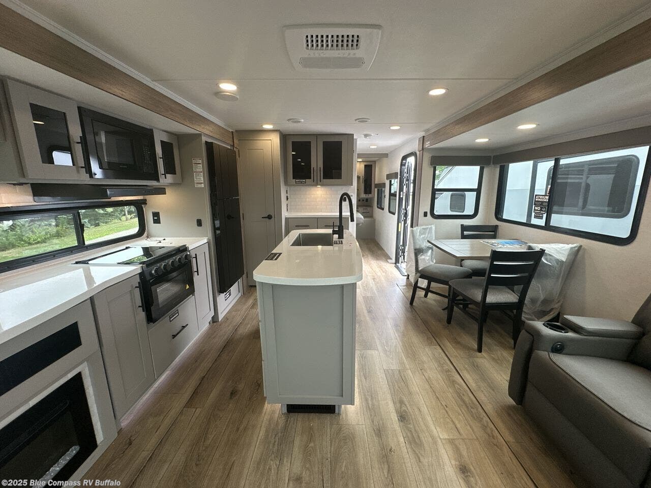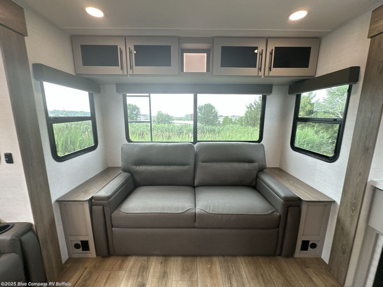 You will feel right at home camping in this travel trailer! The rear living area has a rear sofa and a set of theater seating conveniently across from the entertainment center with a 50" class HDTV above a pull-out fireplace storage for a cozy evening indoors. Prepare your best home cooked meals with the three burner cooktop, kitchen island which even has a tip-out trash can, and 10 cu. ft. 12V refrigerator. Enjoy your meals at the free standing dinette then either freshen up in the full bathroom with the 30" x 36" shower or head outside to relax under one of the two awnings. The front private bedroom has a queen bed for you to lay your head on at night and has wardrobe nightstands for your items!