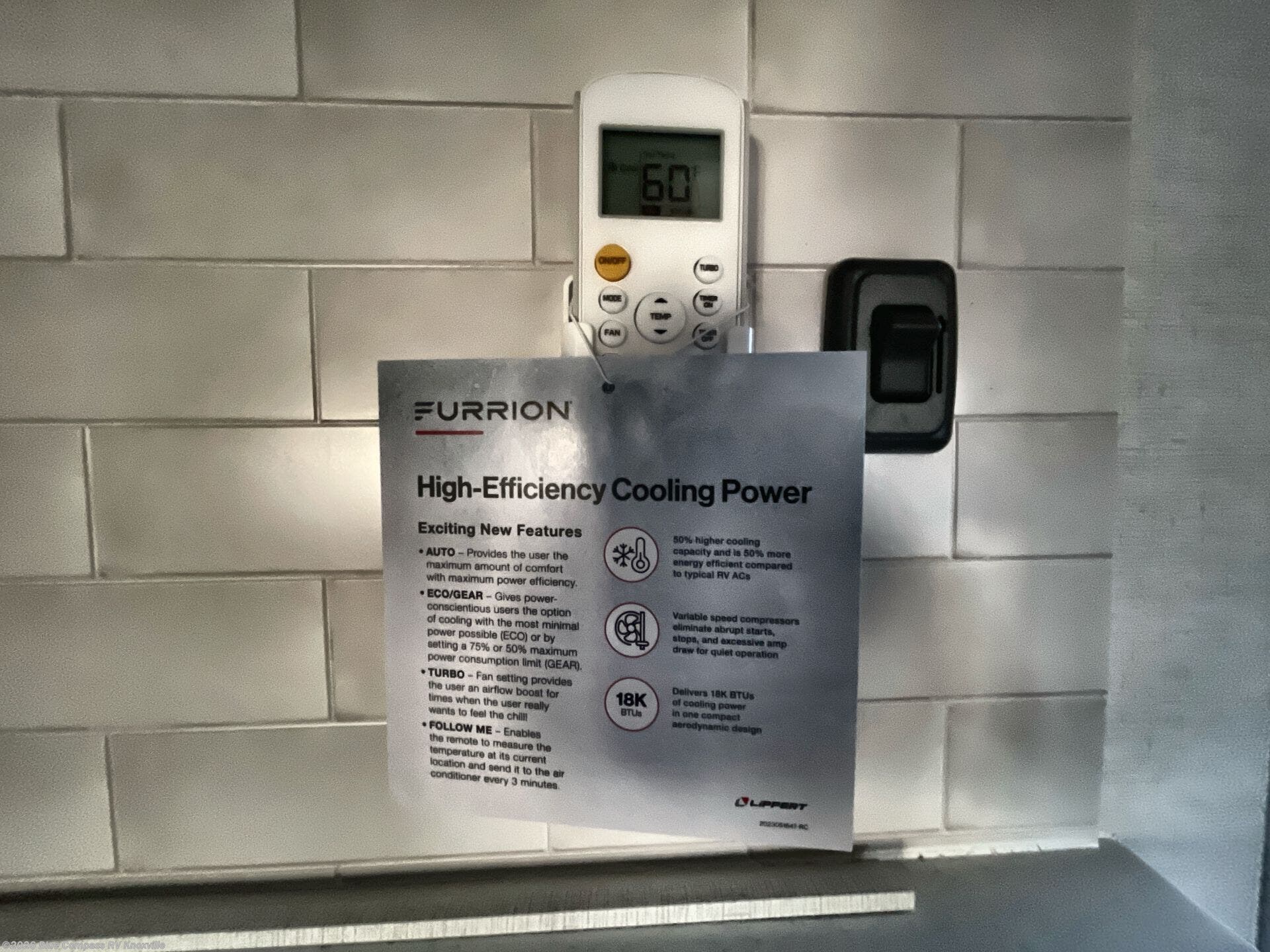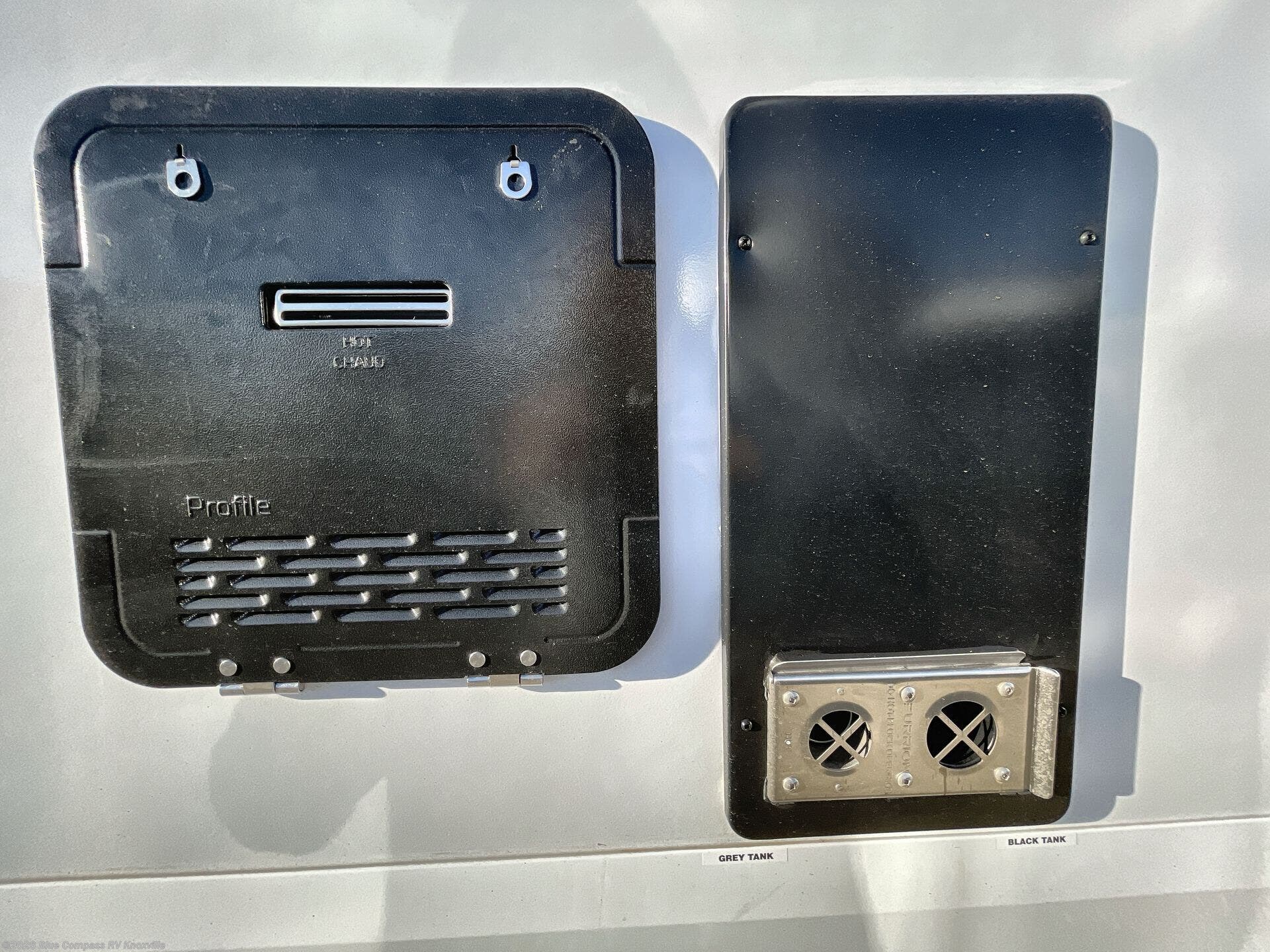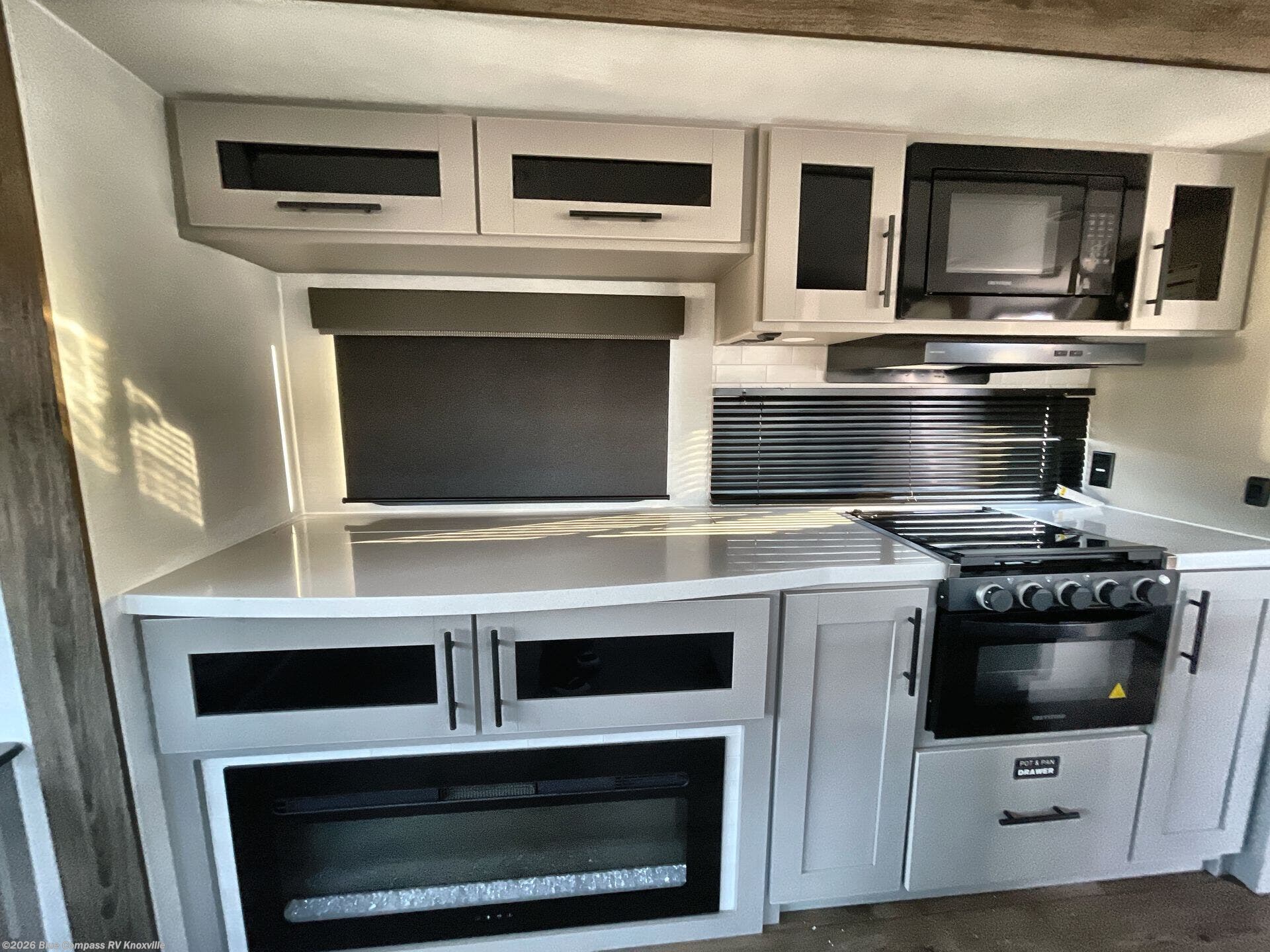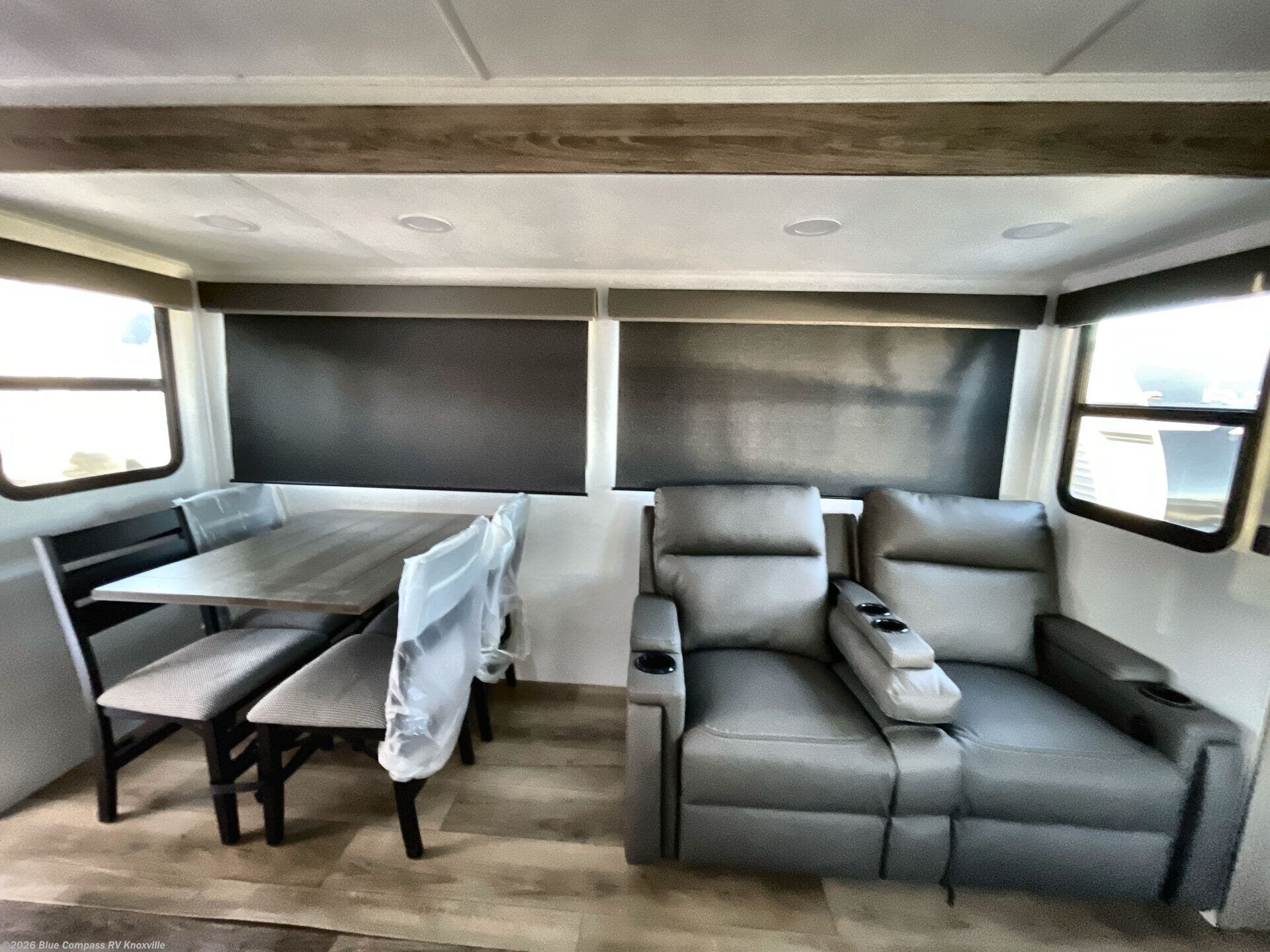 You will feel right at home camping in this travel trailer! The rear living area has a rear sofa and a set of theater seating conveniently across from the entertainment center with a 50" TV above a fireplace for a cozy evening indoors. Prepare your best home cooked meals with the three burner cooktop, kitchen island which even has a tip-out trash can, and 10 cu. ft. 12V refrigerator. Enjoy your meals at the dinette booth that can also be changed to a free standing dinette as an option then either freshen up in the full bathroom with the 30" x 36" shower or head outside to relax under one of the two awnings. The front private bedroom has a queen bed for you to lay your head on at night and has wardrobe nightstands for your items!