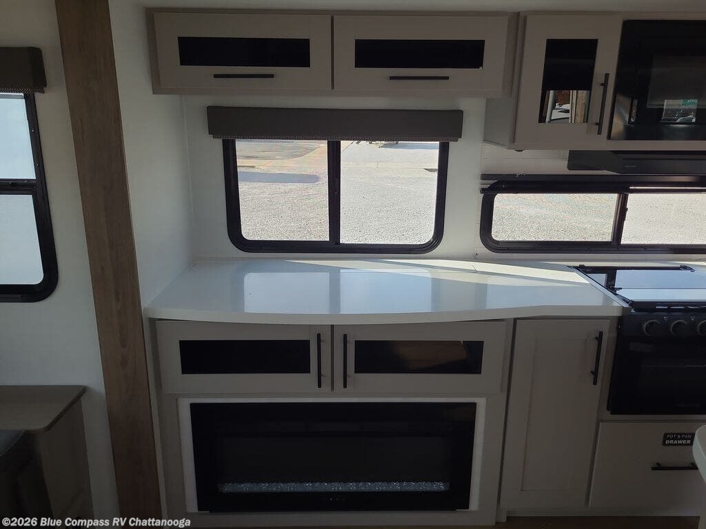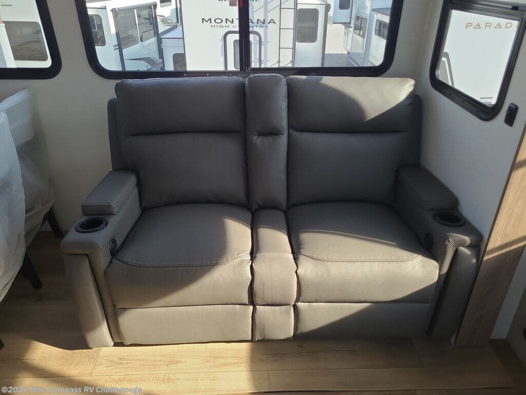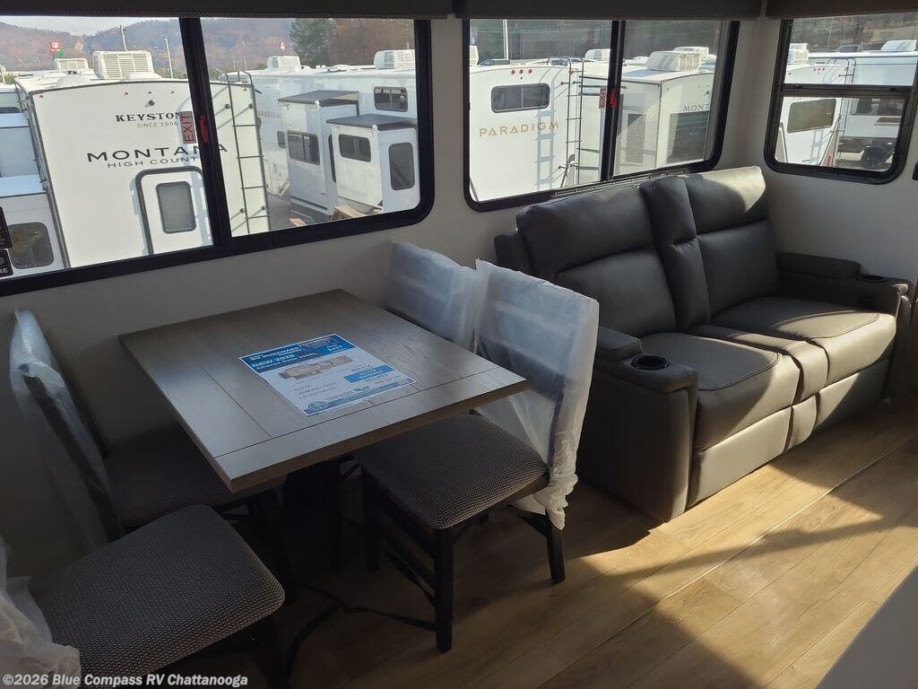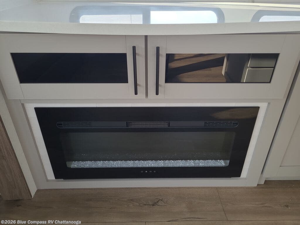 You will feel right at home camping in this travel trailer! The rear living area has a rear sofa and a set of theater seating conveniently across from the entertainment center with a 50" TV above a fireplace for a cozy evening indoors. Prepare your best home cooked meals with the three burner cooktop, kitchen island which even has a tip-out trash can, and 10 cu. ft. 12V refrigerator. Enjoy your meals at the dinette booth that can also be changed to a free standing dinette as an option then either freshen up in the full bathroom with the 30" x 36" shower or head outside to relax under one of the two awnings. The front private bedroom has a queen bed for you to lay your head on at night and has wardrobe nightstands for your items!