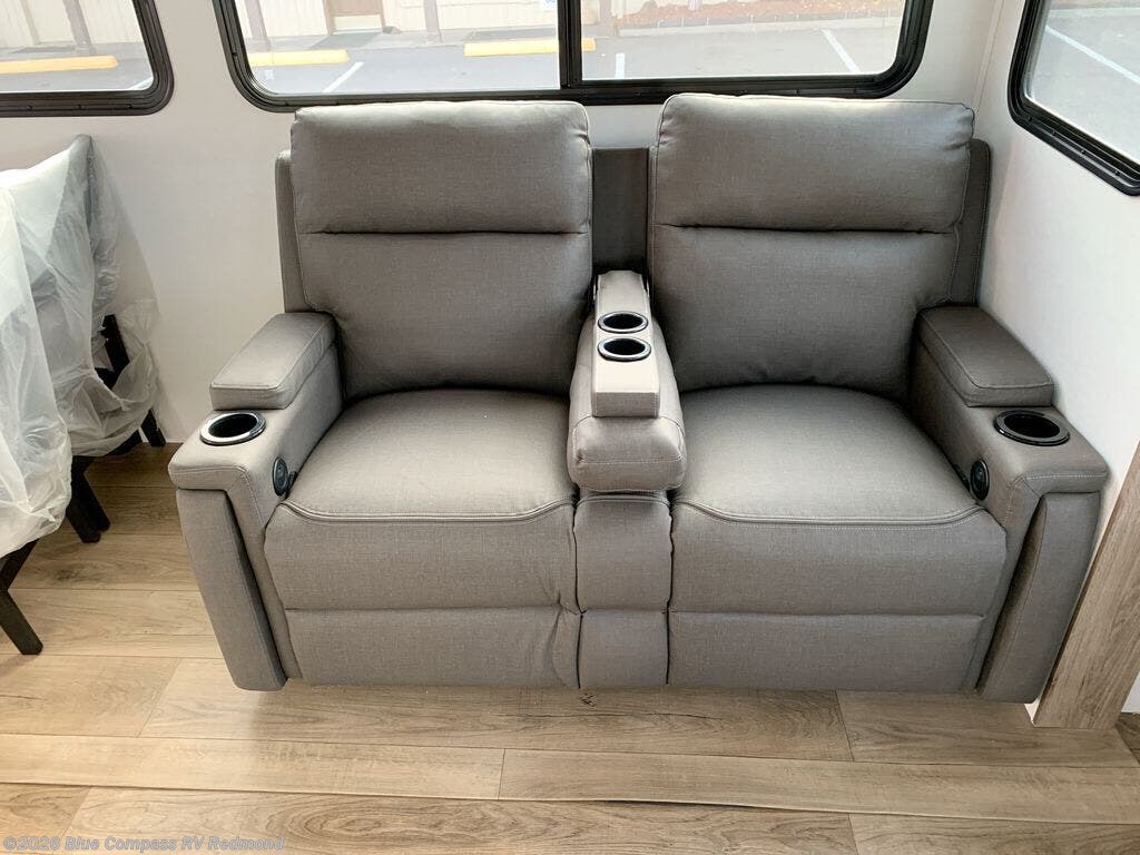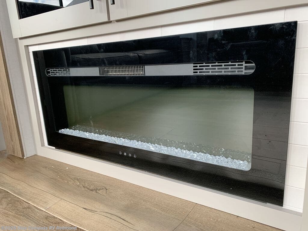 You will feel right at home camping in this travel trailer! The rear living area has a rear sofa and a set of theater seating conveniently across from the entertainment center with a 50" TV above a fireplace for a cozy evening indoors. Prepare your best home cooked meals with the three burner cooktop, kitchen island which even has a tip-out trash can, and 10 cu. ft. 12V refrigerator. Enjoy your meals at the dinette booth that can also be changed to a free standing dinette as an option then either freshen up in the full bathroom with the 30" x 36" shower or head outside to relax under one of the two awnings. The front private bedroom has a queen bed for you to lay your head on at night and has wardrobe nightstands for your items!