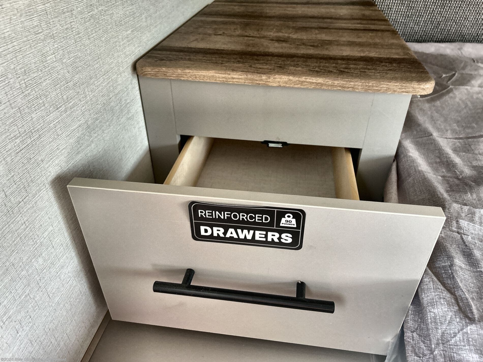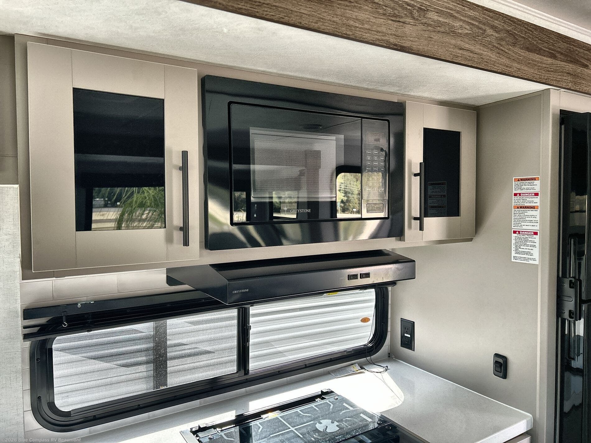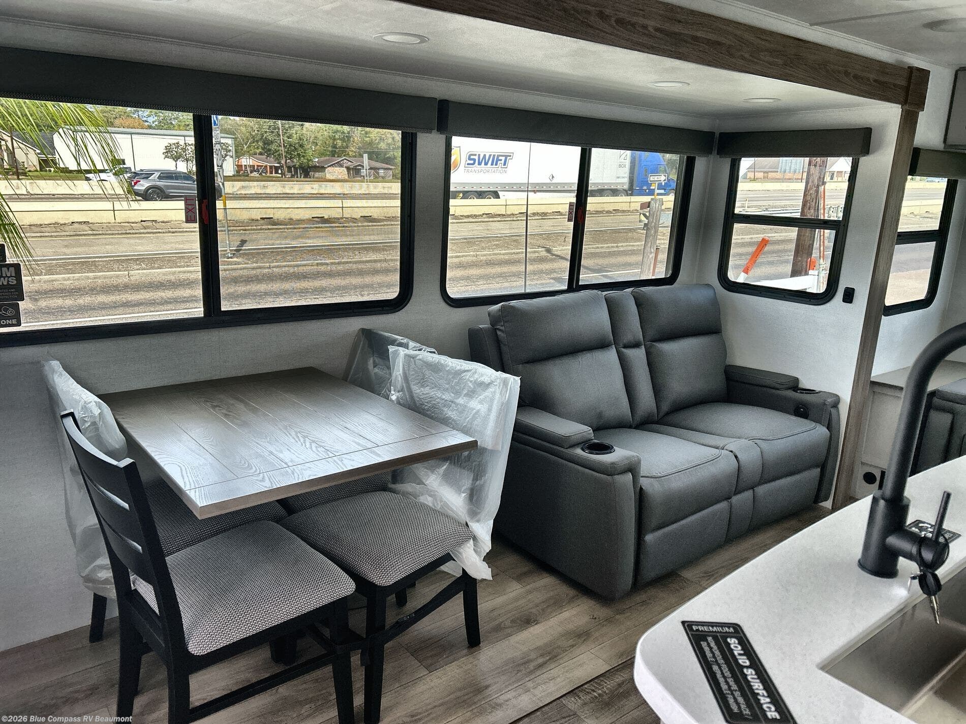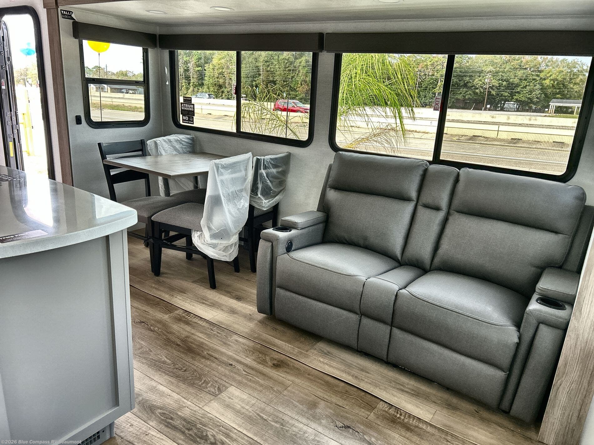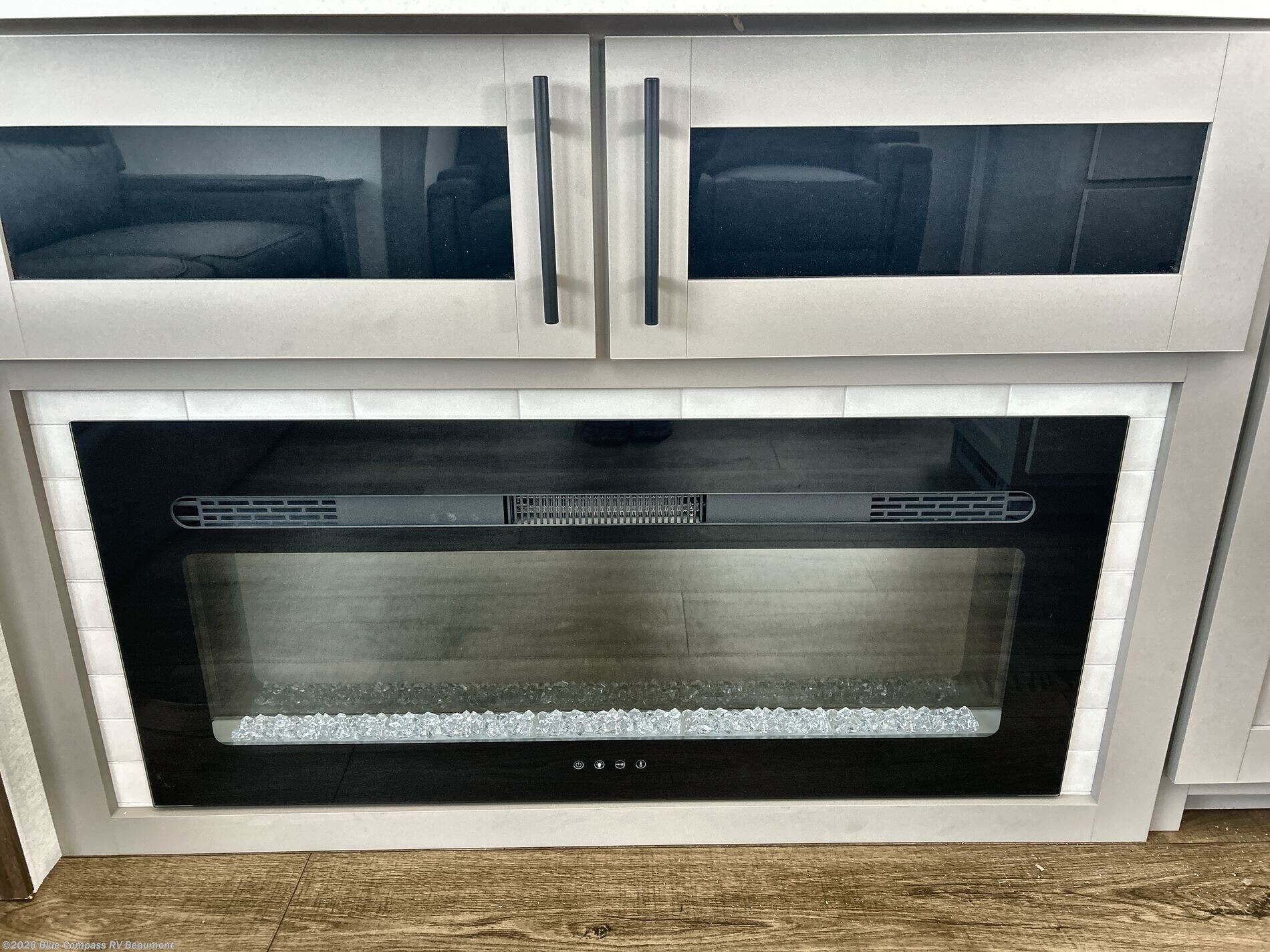 You will feel right at home camping in this travel trailer! The rear living area has a rear sofa and a set of theater seating conveniently across from the entertainment center with a 50" TV above a fireplace for a cozy evening indoors. Prepare your best home cooked meals with the three burner cooktop, kitchen island which even has a tip-out trash can, and 10 cu. ft. 12V refrigerator. Enjoy your meals at the dinette booth that can also be changed to a free standing dinette as an option then either freshen up in the full bathroom with the 30" x 36" shower or head outside to relax under one of the two awnings. The front private bedroom has a queen bed for you to lay your head on at night and has wardrobe nightstands for your items!