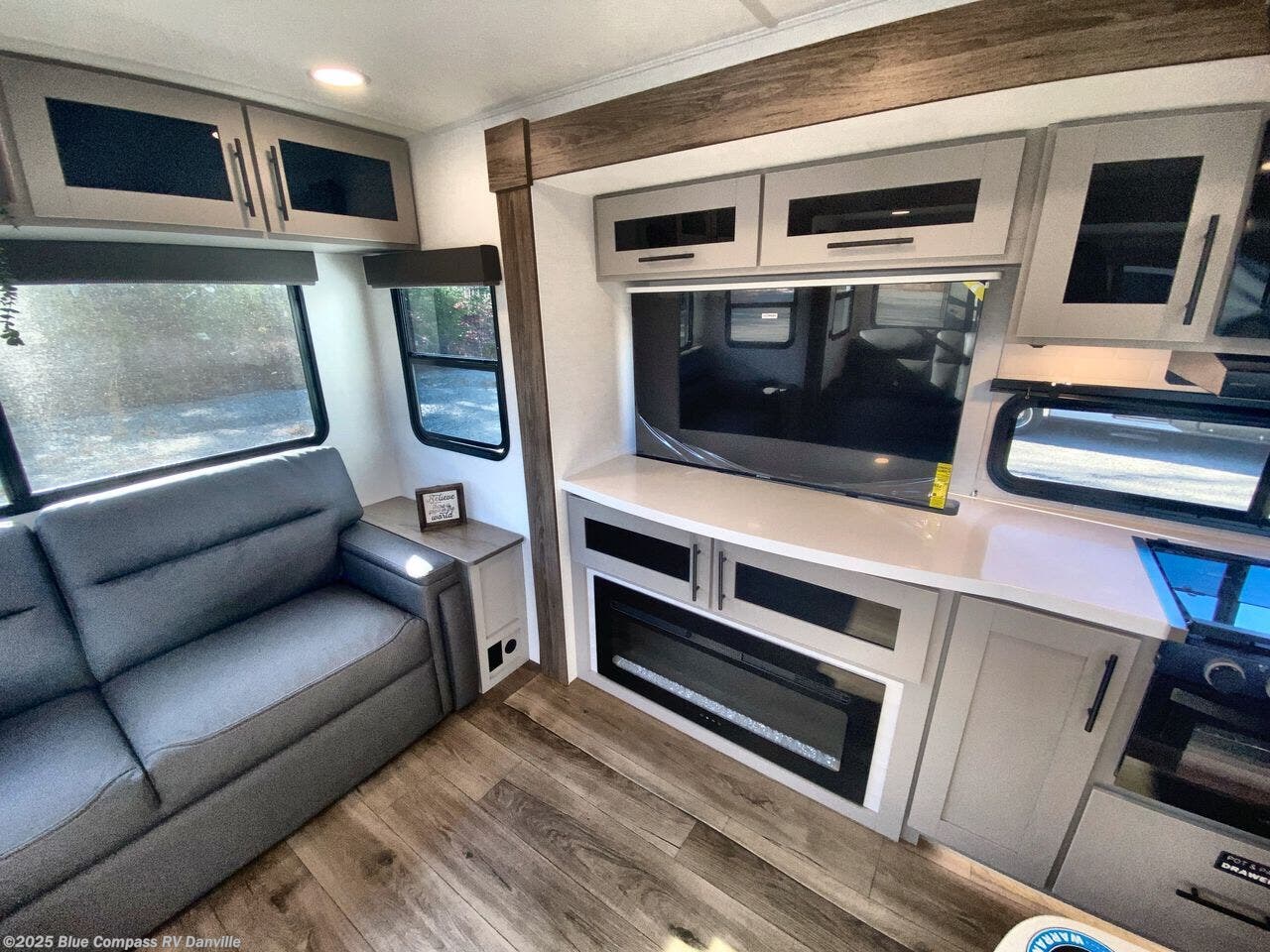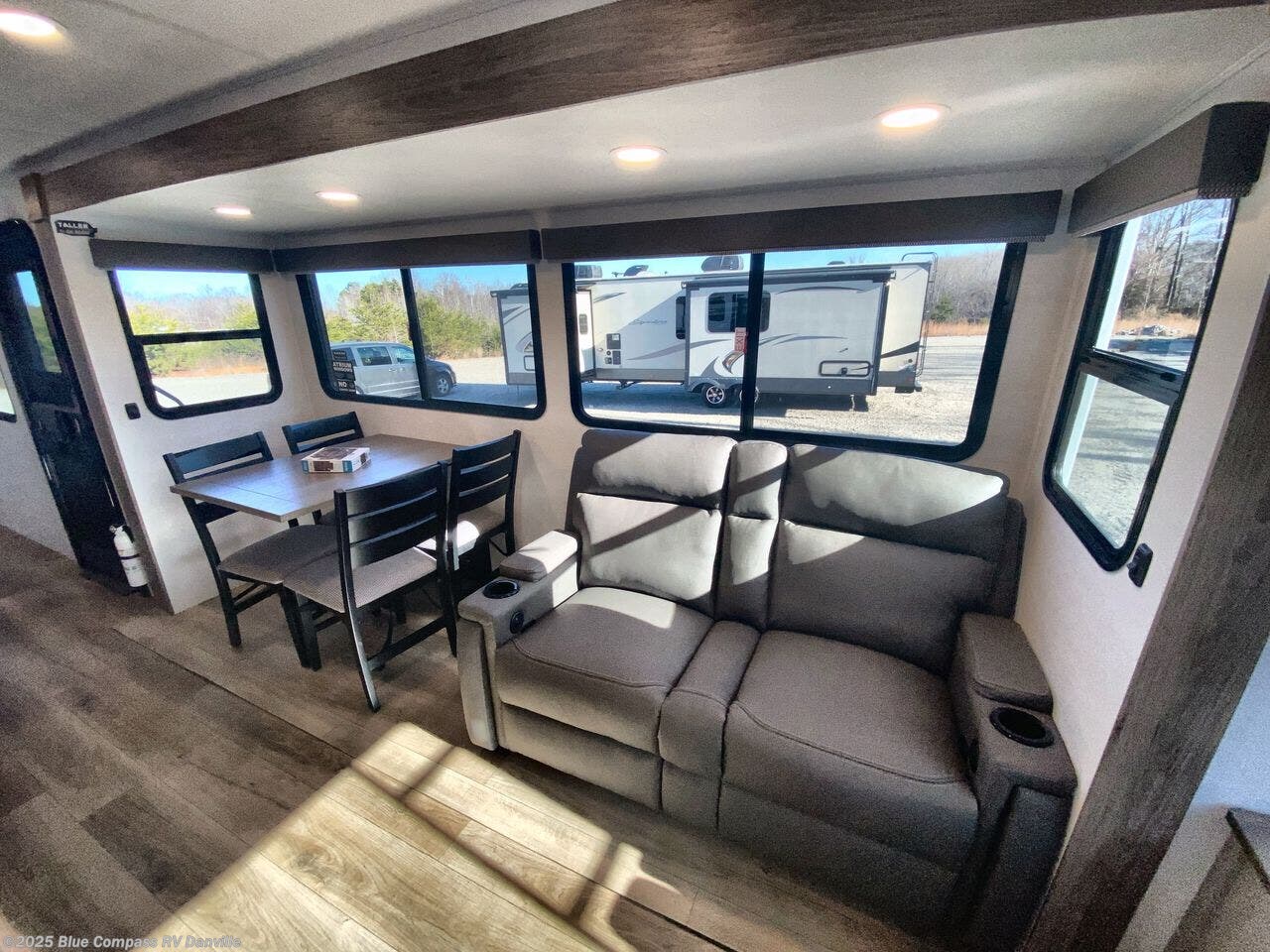 You will feel right at home camping in this travel trailer! The rear living area has a rear sofa and a set of theater seating conveniently across from the entertainment center with a 50" TV above a fireplace for a cozy evening indoors. Prepare your best home cooked meals with the three burner cooktop, kitchen island which even has a tip-out trash can, and 10 cu. ft. 12V refrigerator. Enjoy your meals at the dinette booth that can also be changed to a free standing dinette as an option then either freshen up in the full bathroom with the 30" x 36" shower or head outside to relax under one of the two awnings. The front private bedroom has a queen bed for you to lay your head on at night and has wardrobe nightstands for your items!