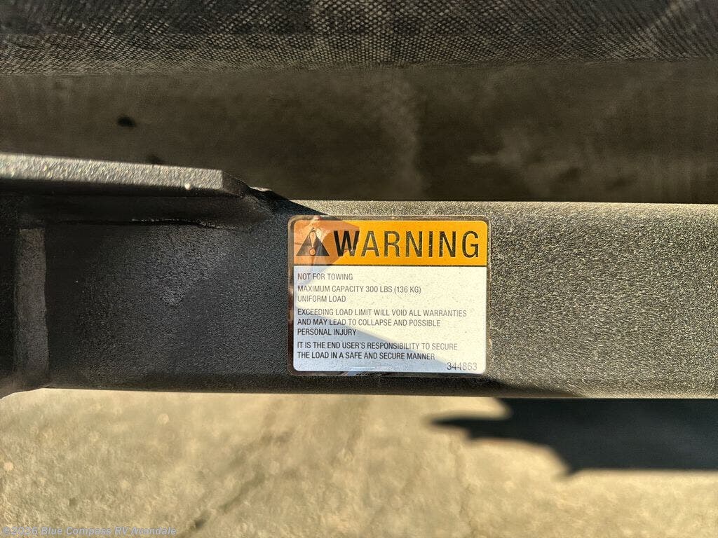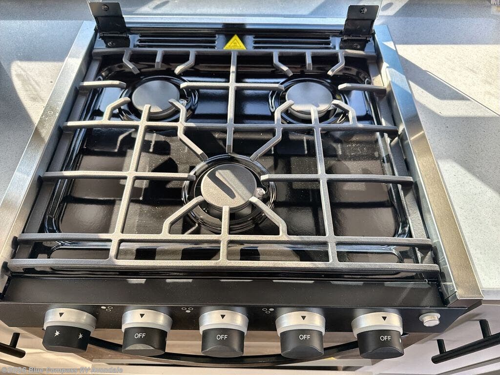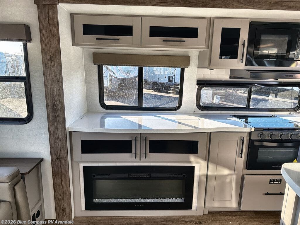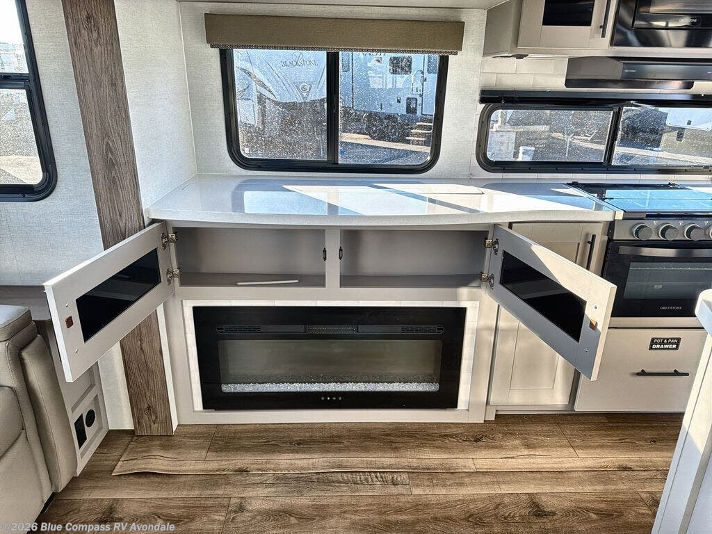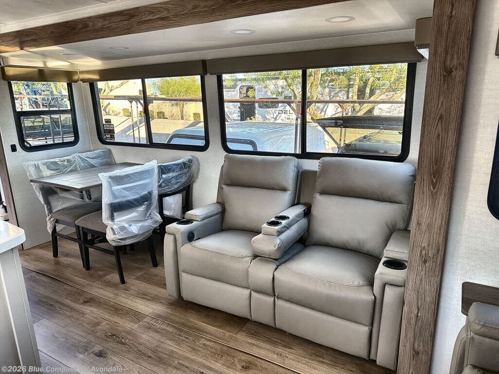 You will feel right at home camping in this travel trailer! The rear living area has a rear sofa and a set of theater seating conveniently across from the entertainment center with a 50" TV above a fireplace for a cozy evening indoors. Prepare your best home cooked meals with the three burner cooktop, kitchen island which even has a tip-out trash can, and 10 cu. ft. 12V refrigerator. Enjoy your meals at the dinette booth that can also be changed to a free standing dinette as an option then either freshen up in the full bathroom with the 30" x 36" shower or head outside to relax under one of the two awnings. The front private bedroom has a queen bed for you to lay your head on at night and has wardrobe nightstands for your items!