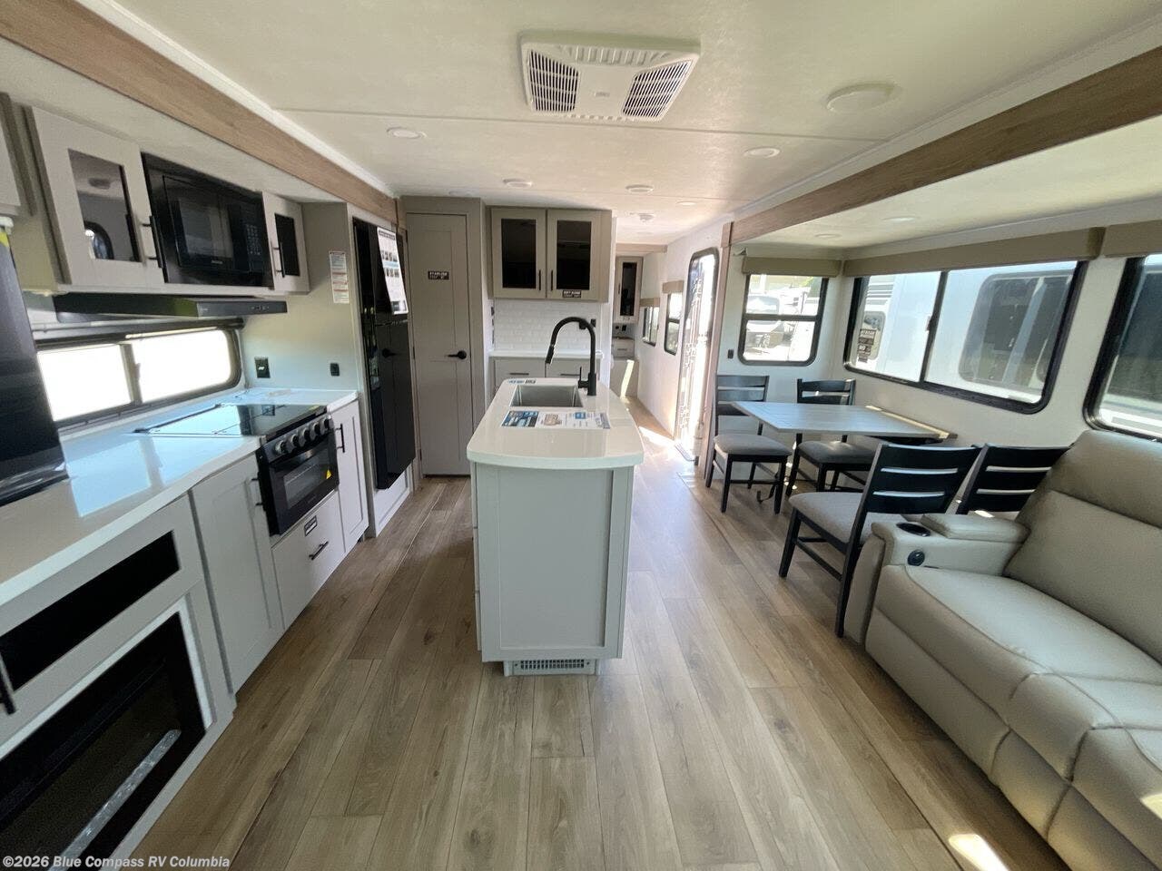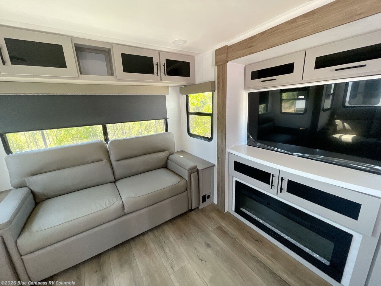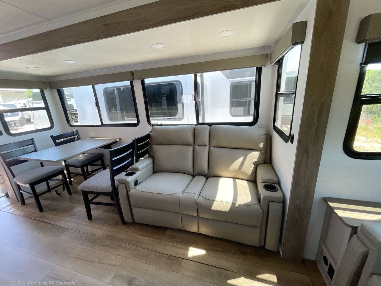 You will feel right at home camping in this travel trailer! The rear living area has a rear sofa and a set of theater seating conveniently across from the entertainment center with a 50" TV above a fireplace for a cozy evening indoors. Prepare your best home cooked meals with the three burner cooktop, kitchen island which even has a tip-out trash can, and 10 cu. ft. 12V refrigerator. Enjoy your meals at the dinette booth that can also be changed to a free standing dinette as an option then either freshen up in the full bathroom with the 30" x 36" shower or head outside to relax under one of the two awnings. The front private bedroom has a queen bed for you to lay your head on at night and has wardrobe nightstands for your items!