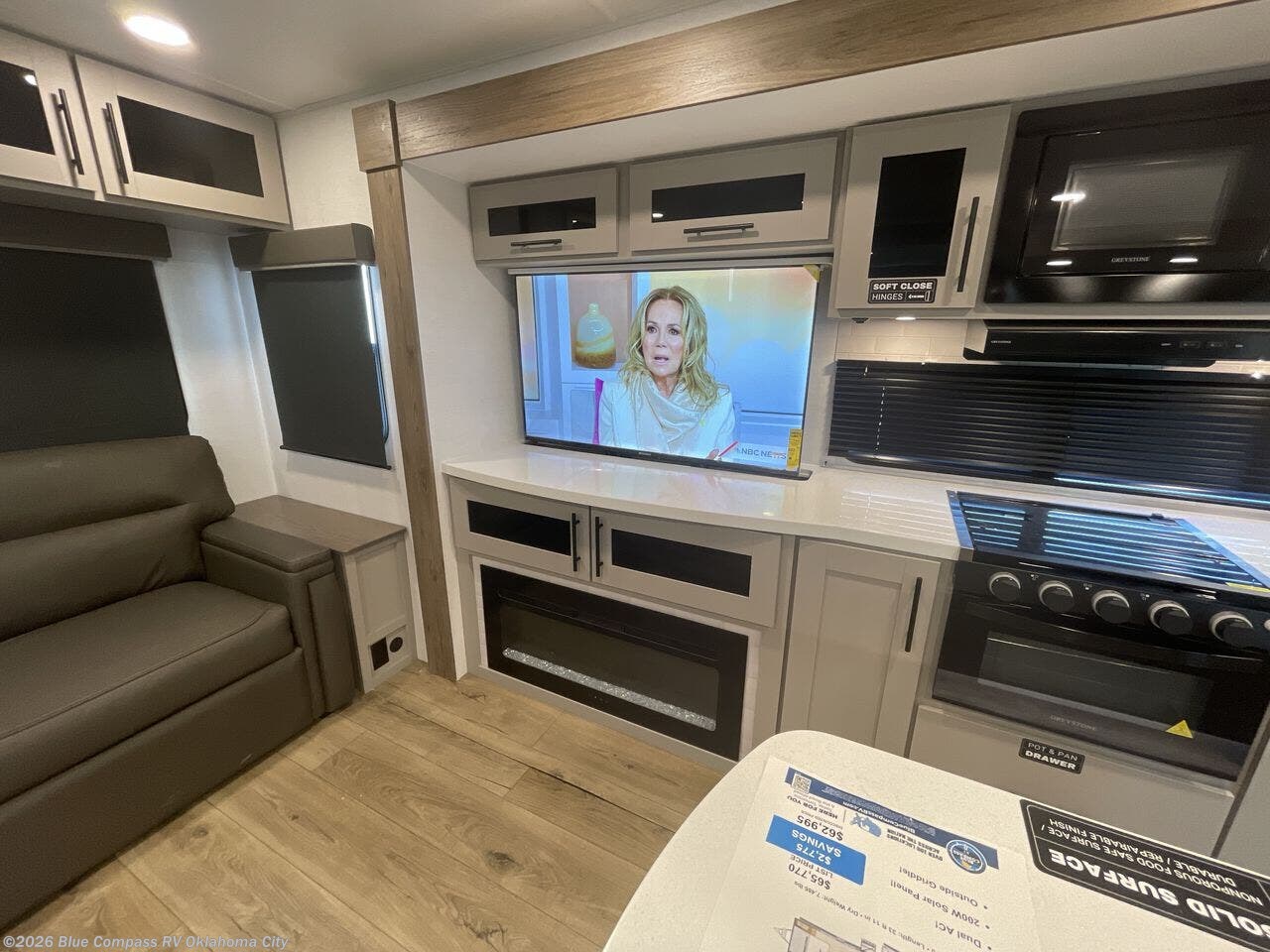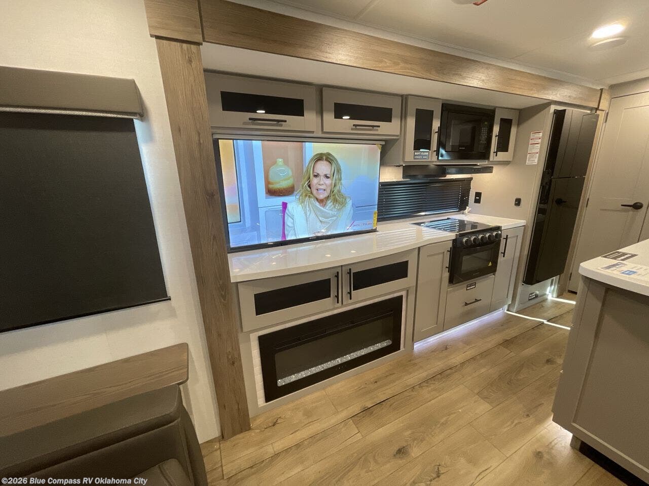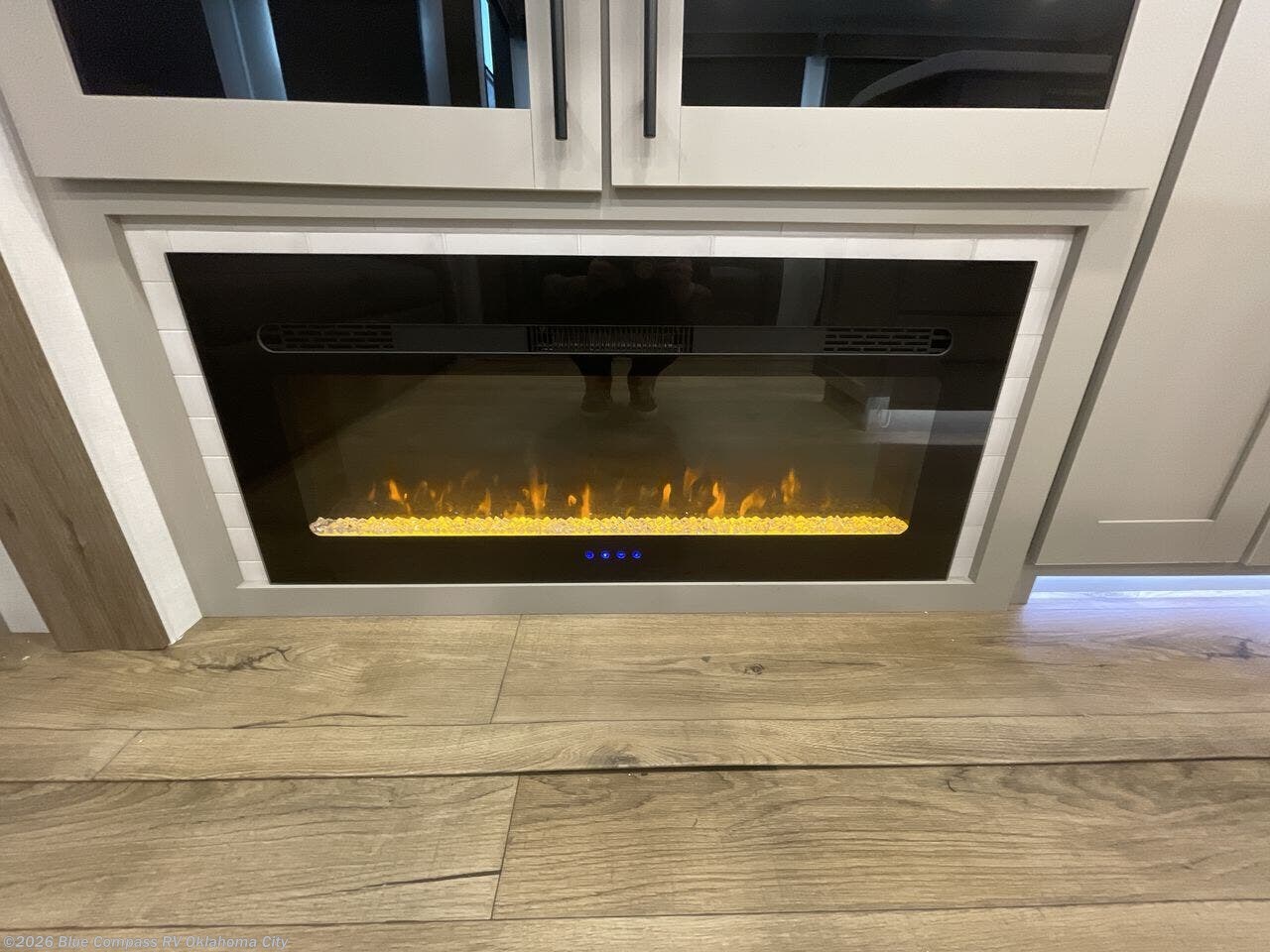 You will feel right at home camping in this travel trailer! The rear living area has a rear sofa and a set of theater seating conveniently across from the entertainment center with a 50" class HDTV above a pull-out fireplace storage for a cozy evening indoors. Prepare your best home cooked meals with the three burner cooktop, kitchen island which even has a tip-out trash can, and 10 cu. ft. 12V refrigerator. Enjoy your meals at the free standing dinette then either freshen up in the full bathroom with the 30" x 36" shower or head outside to relax under one of the two awnings. The front private bedroom has a queen bed for you to lay your head on at night and has wardrobe nightstands for your items!