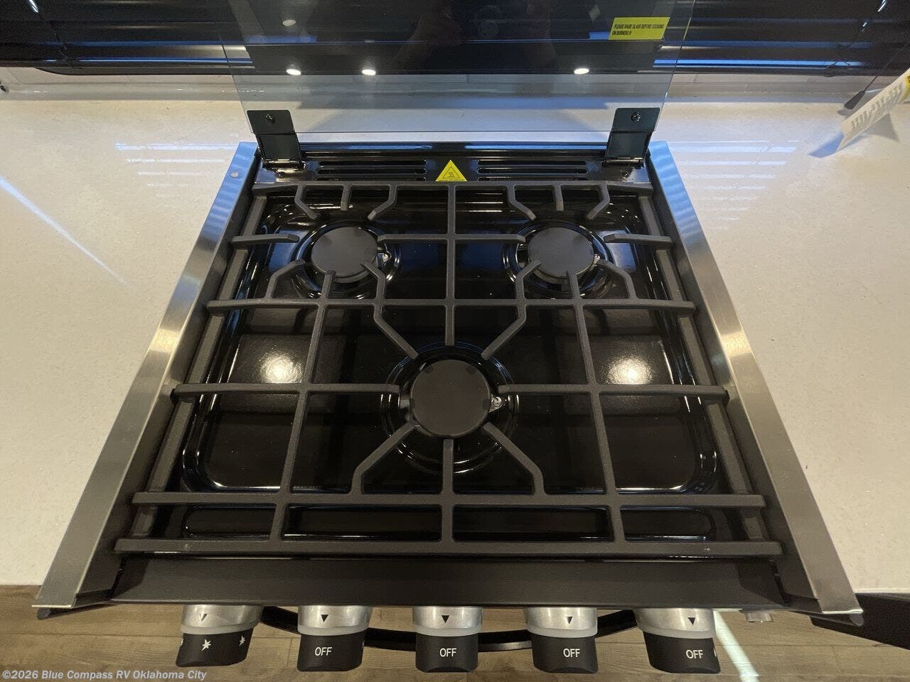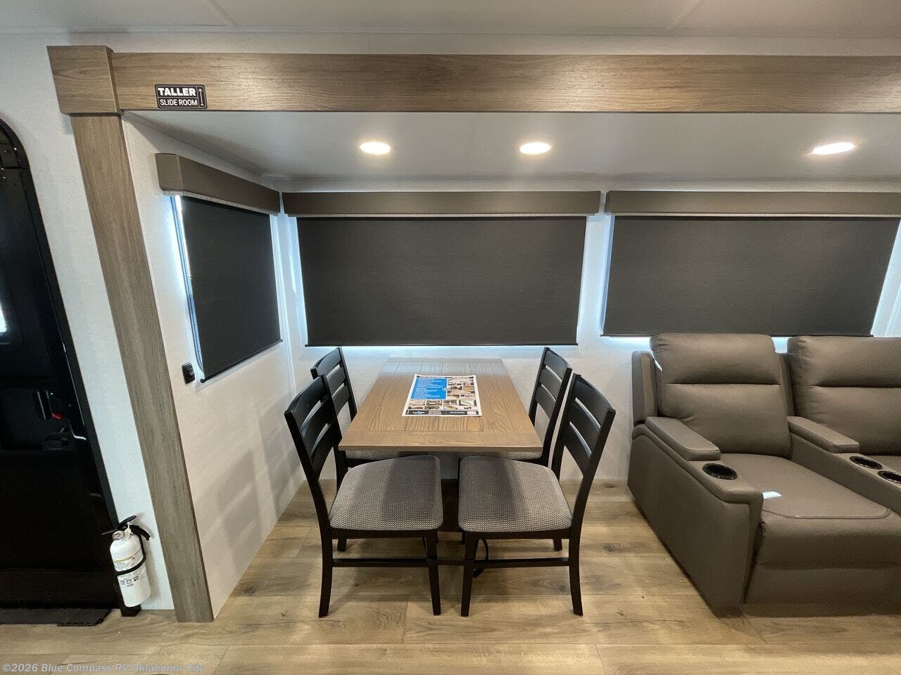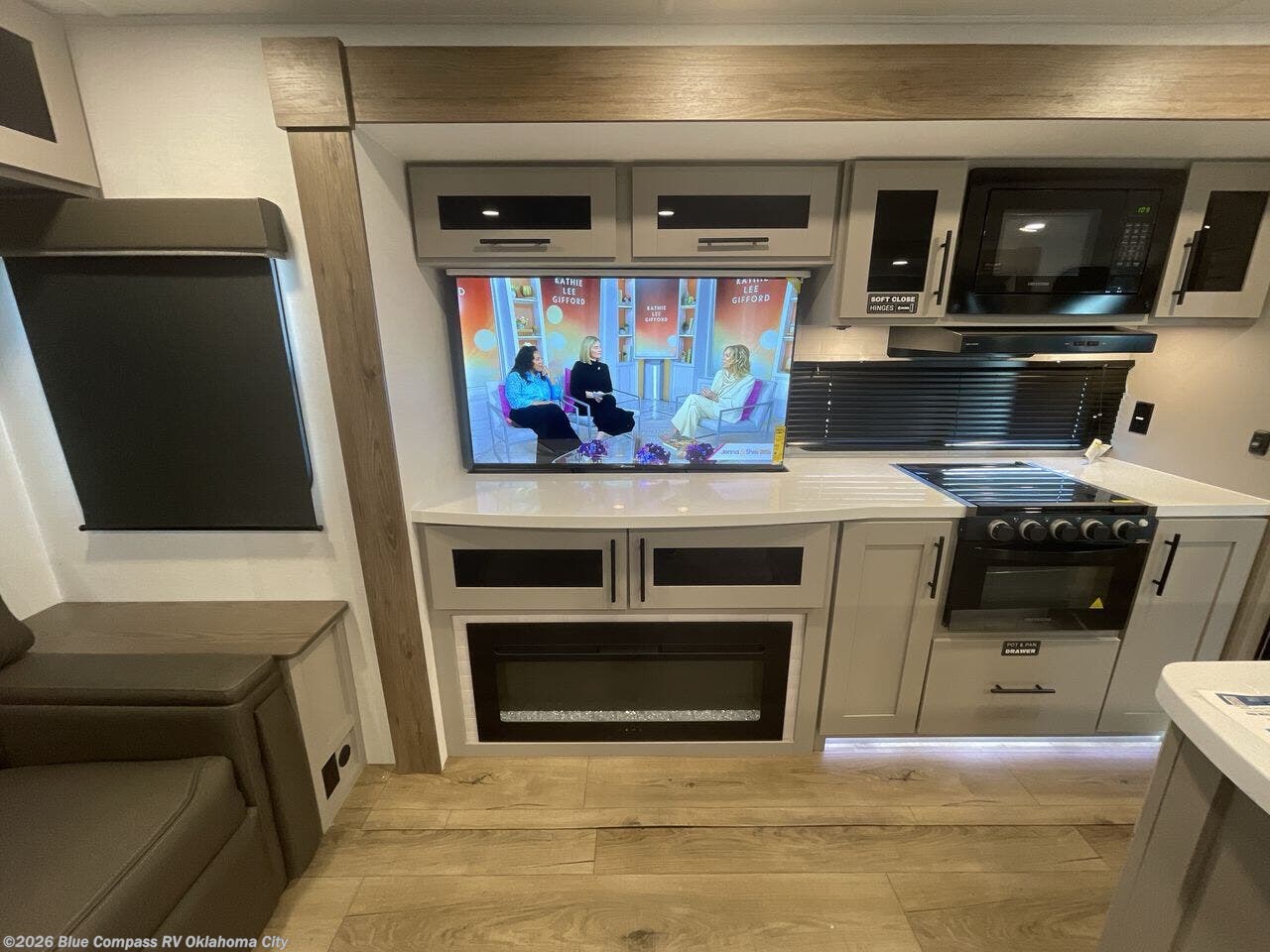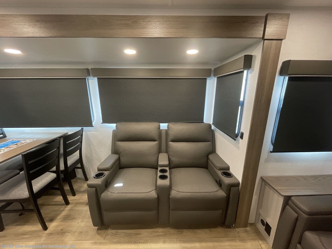 You will feel right at home camping in this travel trailer! The rear living area has a rear sofa and a set of theater seating conveniently across from the entertainment center with a 50" class HDTV above a pull-out fireplace storage for a cozy evening indoors. Prepare your best home cooked meals with the three burner cooktop, kitchen island which even has a tip-out trash can, and 10 cu. ft. 12V refrigerator. Enjoy your meals at the free standing dinette then either freshen up in the full bathroom with the 30" x 36" shower or head outside to relax under one of the two awnings. The front private bedroom has a queen bed for you to lay your head on at night and has wardrobe nightstands for your items!
