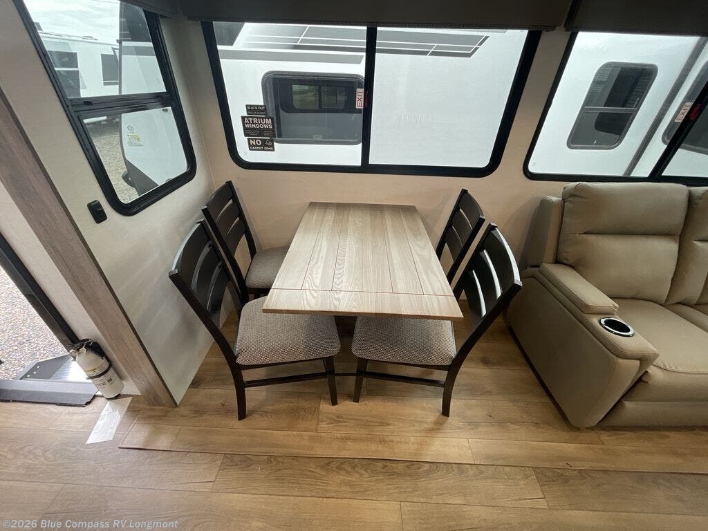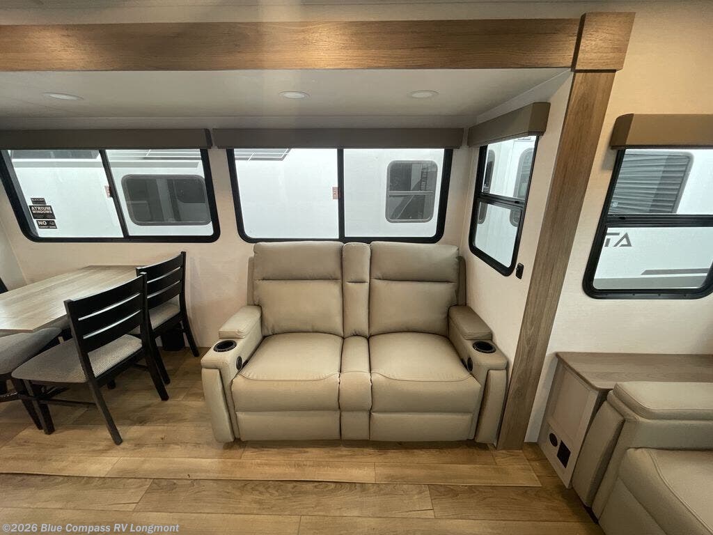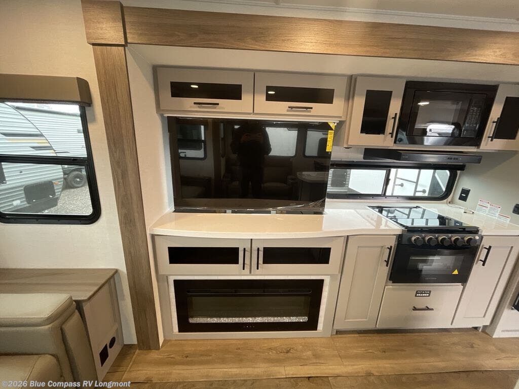 You will feel right at home camping in this travel trailer! The rear living area has a rear sofa and a set of theater seating conveniently across from the entertainment center with a 50" TV above a fireplace for a cozy evening indoors. Prepare your best home cooked meals with the three burner cooktop, kitchen island which even has a tip-out trash can, and 10 cu. ft. 12V refrigerator. Enjoy your meals at the dinette booth that can also be changed to a free standing dinette as an option then either freshen up in the full bathroom with the 30" x 36" shower or head outside to relax under one of the two awnings. The front private bedroom has a queen bed for you to lay your head on at night and has wardrobe nightstands for your items!
