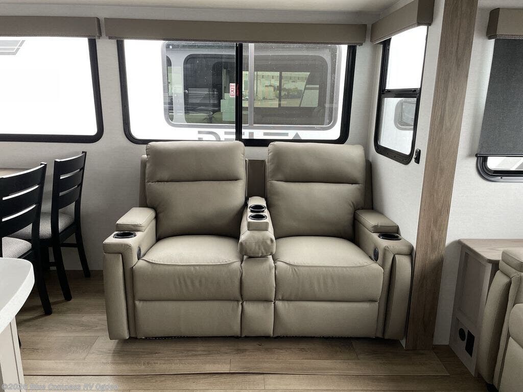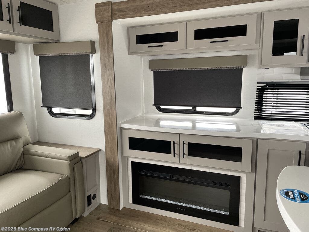 You will feel right at home camping in this travel trailer! The rear living area has a rear sofa and a set of theater seating conveniently across from the entertainment center with a 50" TV above a fireplace for a cozy evening indoors. Prepare your best home cooked meals with the three burner cooktop, kitchen island which even has a tip-out trash can, and 10 cu. ft. 12V refrigerator. Enjoy your meals at the dinette booth that can also be changed to a free standing dinette as an option then either freshen up in the full bathroom with the 30" x 36" shower or head outside to relax under one of the two awnings. The front private bedroom has a queen bed for you to lay your head on at night and has wardrobe nightstands for your items!