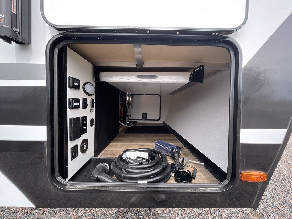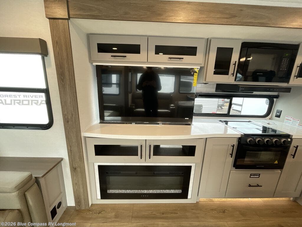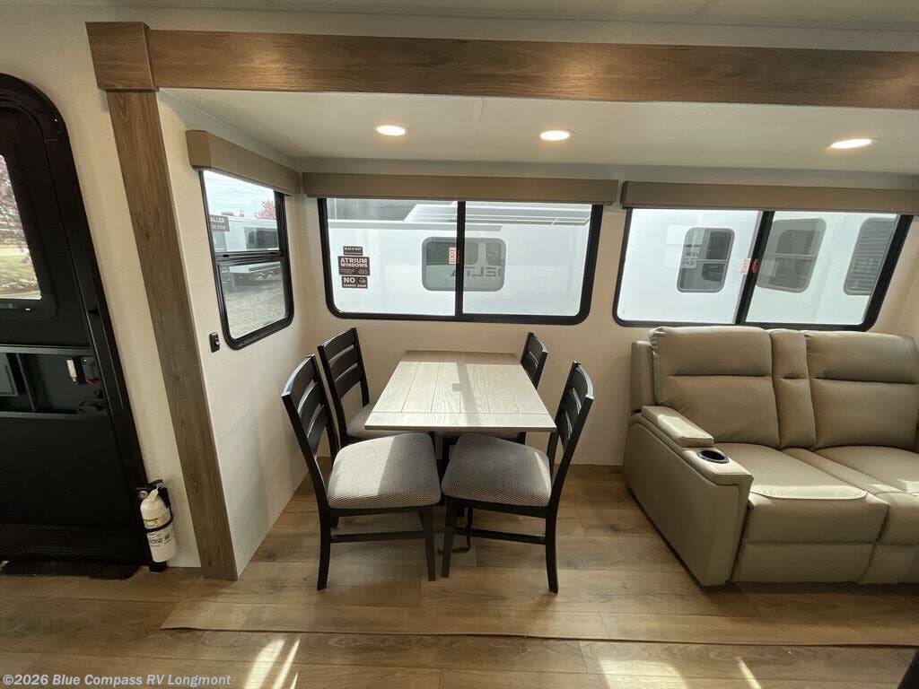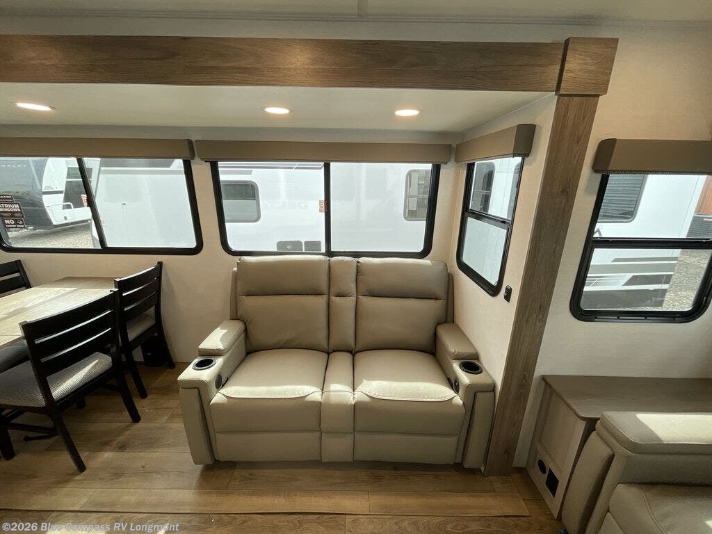 You will feel right at home camping in this travel trailer! The rear living area has a rear sofa and a set of theater seating conveniently across from the entertainment center with a 50" TV above a fireplace for a cozy evening indoors. Prepare your best home cooked meals with the three burner cooktop, kitchen island which even has a tip-out trash can, and 10 cu. ft. 12V refrigerator. Enjoy your meals at the dinette booth that can also be changed to a free standing dinette as an option then either freshen up in the full bathroom with the 30" x 36" shower or head outside to relax under one of the two awnings. The front private bedroom has a queen bed for you to lay your head on at night and has wardrobe nightstands for your items!