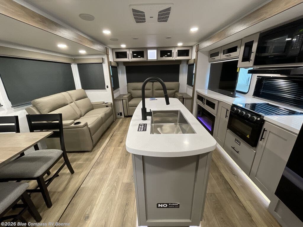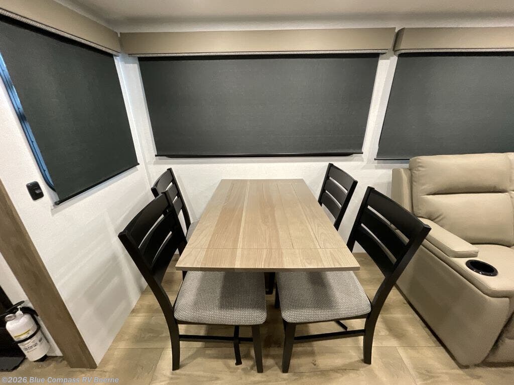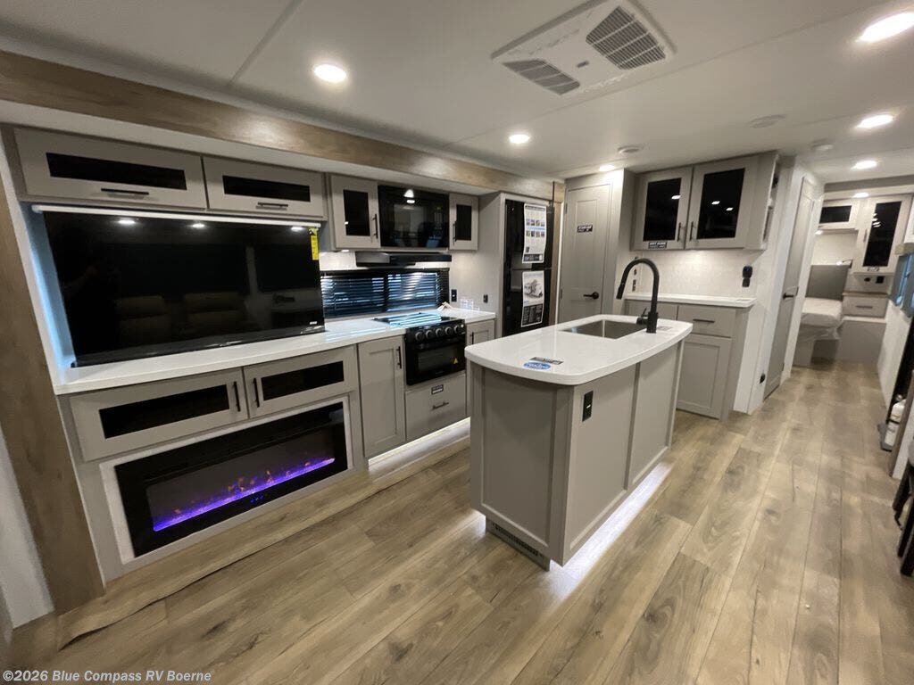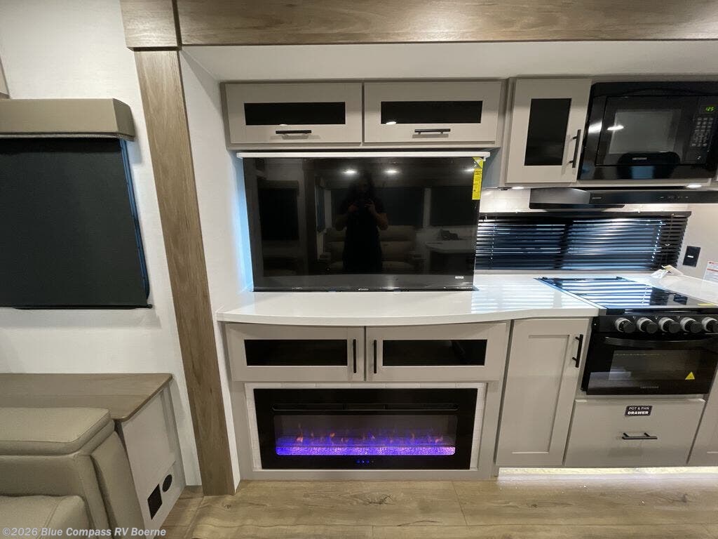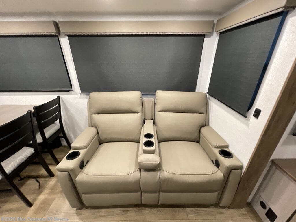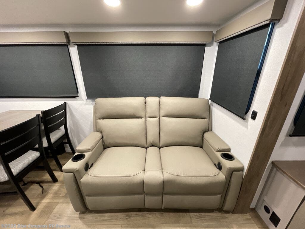You will feel right at home camping in this travel trailer! The rear living area has a rear sofa and a set of theater seating conveniently across from the entertainment center with a 50" TV above a fireplace for a cozy evening indoors. Prepare your best home cooked meals with the three burner cooktop, kitchen island which even has a tip-out trash can, and 10 cu. ft. 12V refrigerator. Enjoy your meals at the dinette booth that can also be changed to a free standing dinette as an option then either freshen up in the full bathroom with the 30" x 36" shower or head outside to relax under one of the two awnings. The front private bedroom has a queen bed for you to lay your head on at night and has wardrobe nightstands for your items!