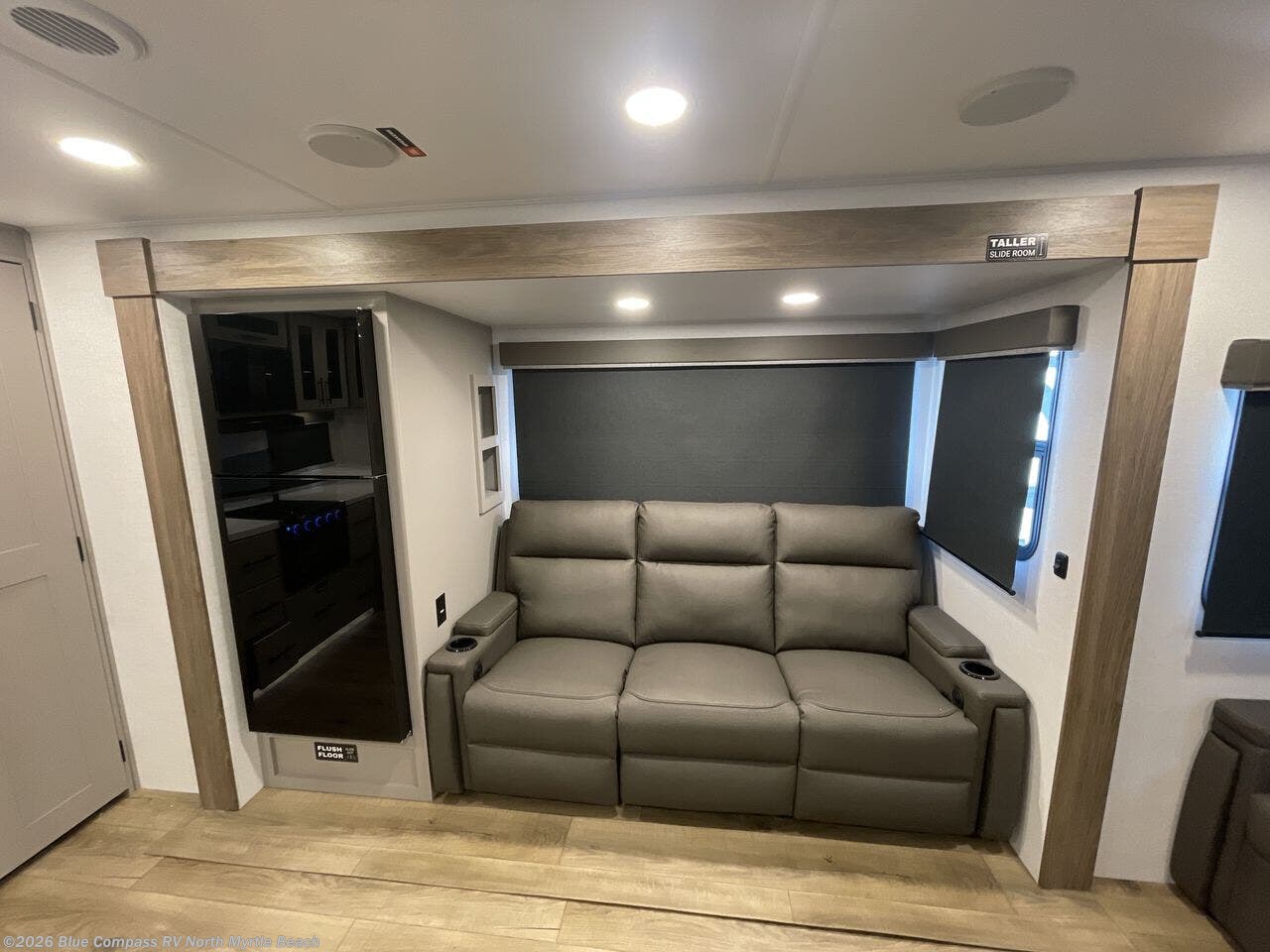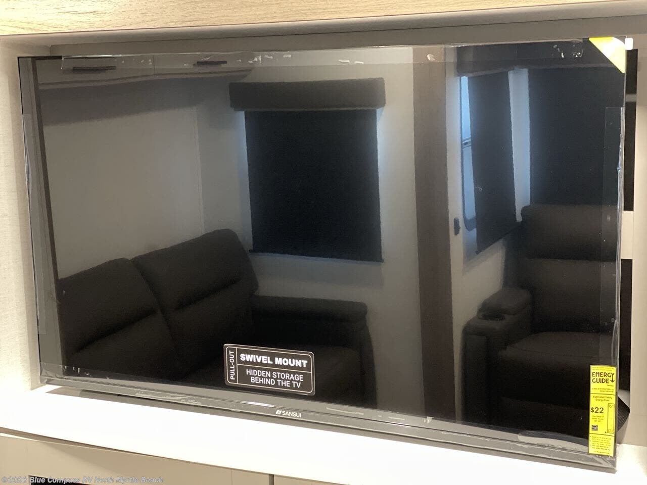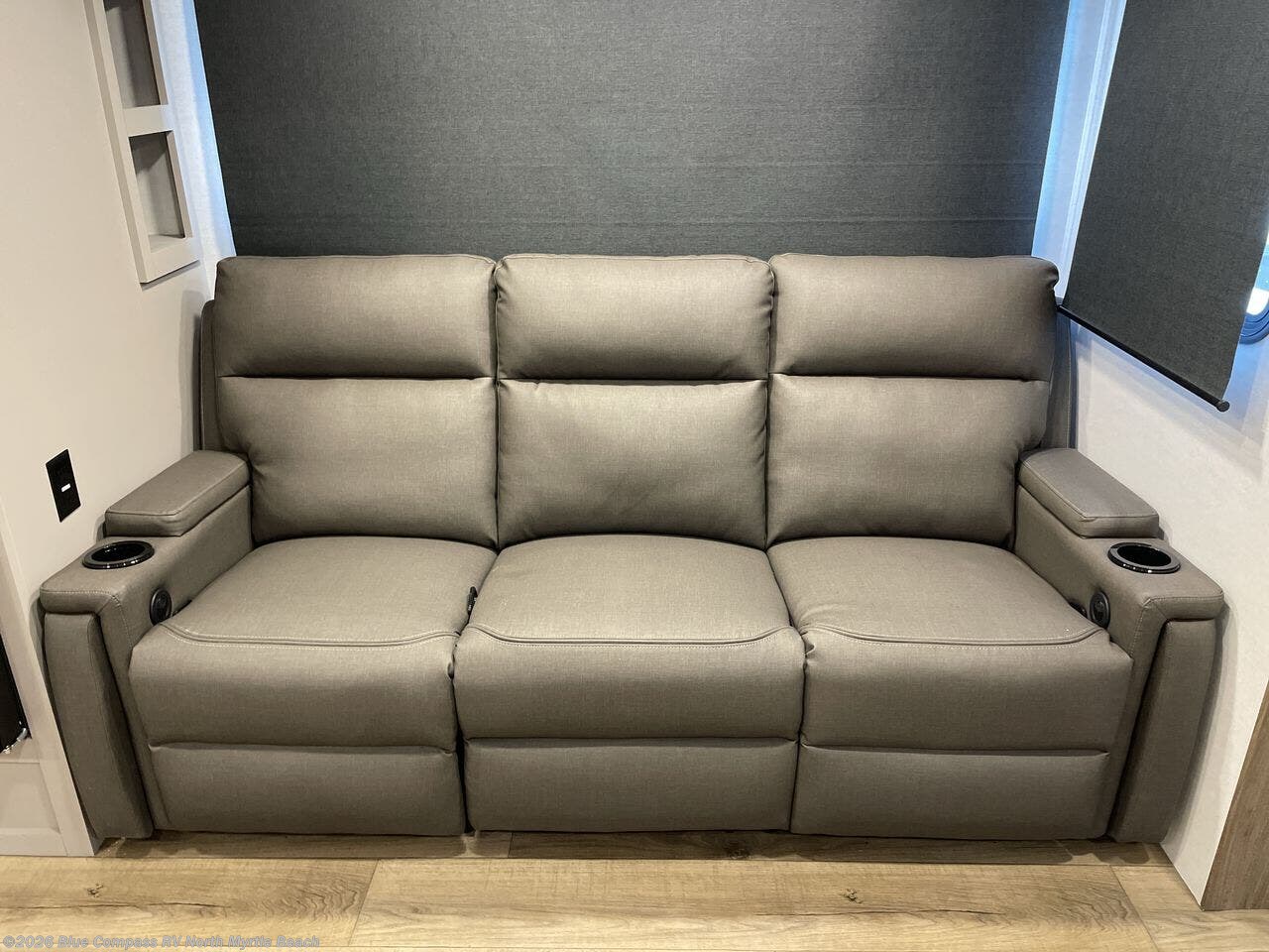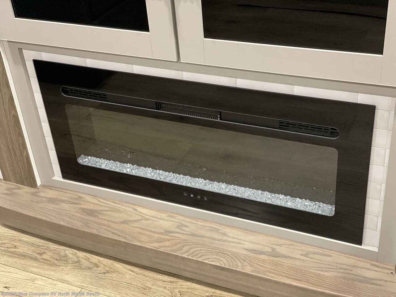Start camping in luxury with this travel trailer! Prepare your best home cooked meals in the rear kitchen with the three burner cooktop, 10 cu. ft. 12V refrigerator, tip-out trash can, and even two bar stools to enjoy your morning coffee while reading the newspaper. Freshen up in the full bathroom with the 30" x 36" shower or head outside to relax under one of the two awnings. There is even an outdoor griddle/grill underneath one of the awnings to protect you while you grill up some juicy burgers, plus an outside 32" TV. The front private bedroom has a queen bed for you to lay your head on at night and has wardrobe nightstands for your items. Relax in true comfort each night on one of the two furniture spots in front of the entertainment center with a 50" class HDTV with a fireplace below it!