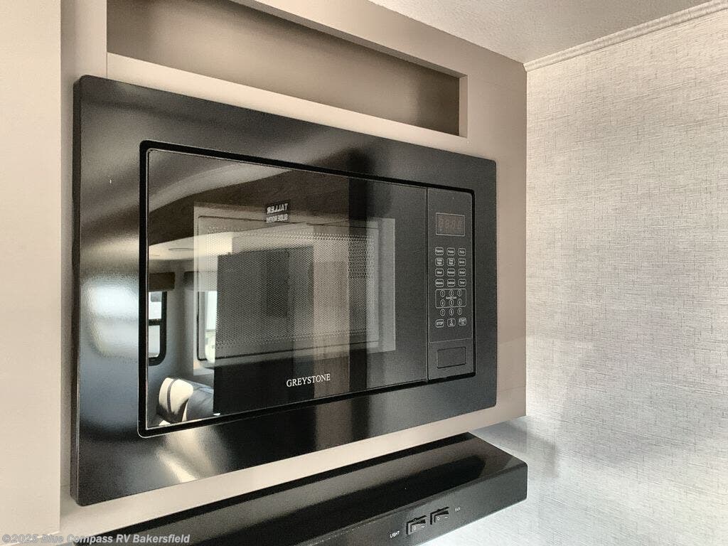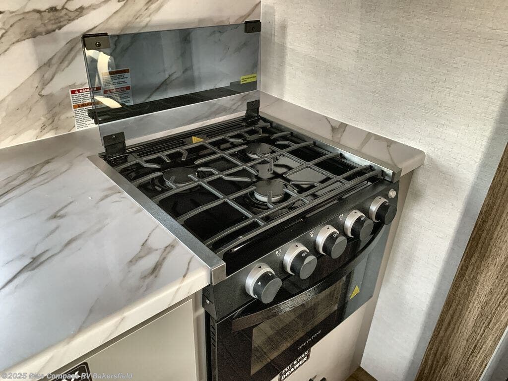 Start camping in luxury with this travel trailer! Prepare your best home cooked meals in the rear kitchen with the three burner cooktop, 10 cu. ft. 12V refrigerator, tip-out trash can, and even two bar stools to enjoy your morning coffee while reading the newspaper. Freshen up in the full bathroom with the 30" x 36" shower or head outside to relax under one of the two awnings. There is even an outdoor griddle/grill underneath one of the awnings to protect you while you grill up some juicy burgers, plus an outside 32" TV. The front private bedroom has a queen bed for you to lay your head on at night and has wardrobe nightstands for your items. Relax in true comfort each night on one of the two furniture spots in front of the entertainment center with a 50" class HDTV with a fireplace below it!