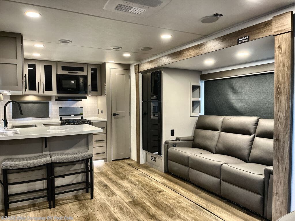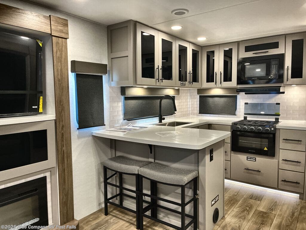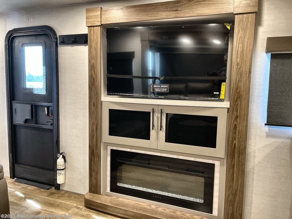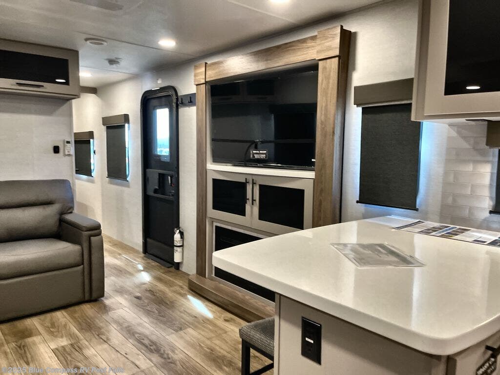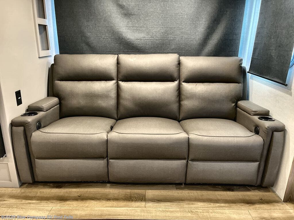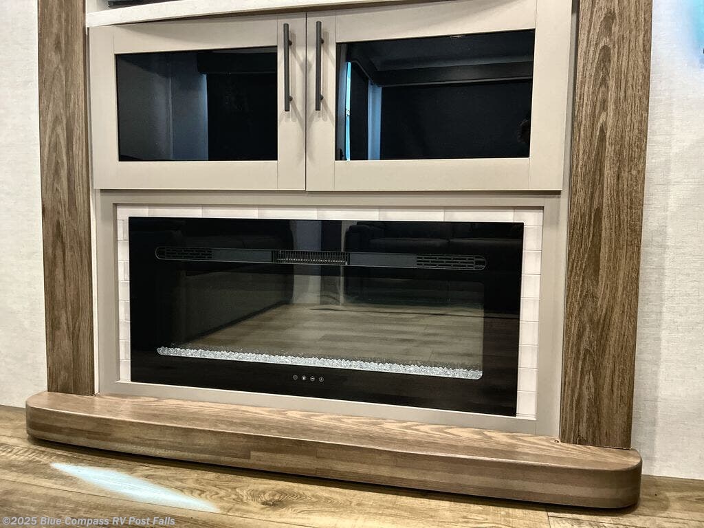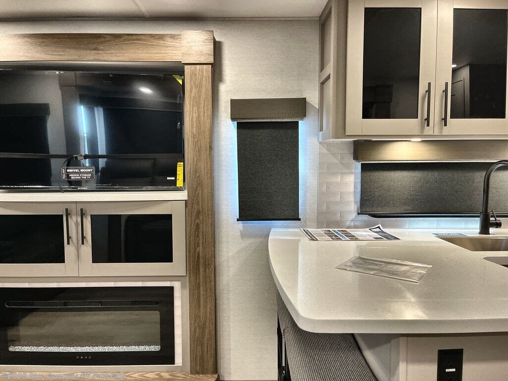 Start camping in luxury with this travel trailer! Prepare your best home cooked meals in the rear kitchen with the three burner cooktop, 10 cu. ft. 12V refrigerator, tip-out trash can, and even two bar stools to enjoy your morning coffee while reading the newspaper. Freshen up in the full bathroom with the 30" x 36" shower or head outside to relax under one of the two awnings. There is even an outdoor griddle/grill underneath one of the awnings to protect you while you grill up some juicy burgers, plus an outside 32" TV. The front private bedroom has a queen bed for you to lay your head on at night and has wardrobe nightstands for your items. Relax in true comfort each night on one of the two furniture spots in front of the entertainment center with a 50" class HDTV with a fireplace below it!