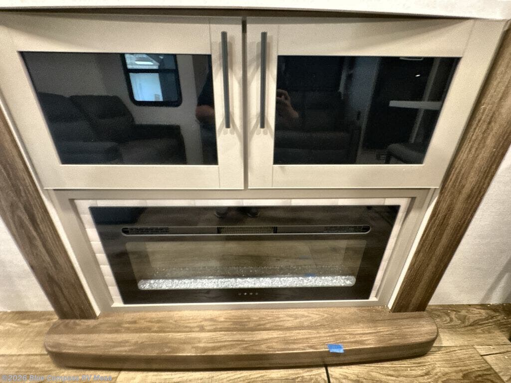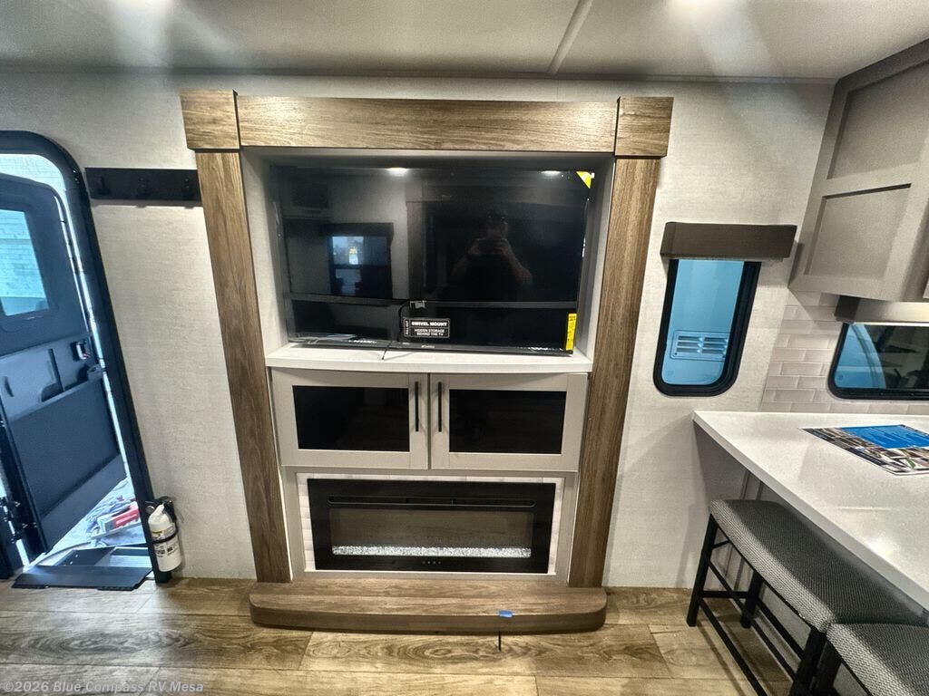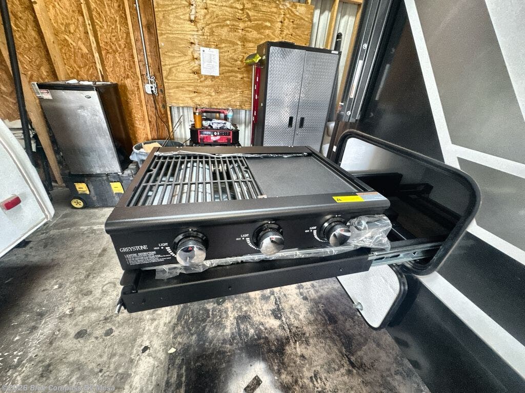 Start camping in luxury with this travel trailer! Prepare your best home cooked meals in the rear kitchen with the three burner cooktop, 10 cu. ft. 12V refrigerator, tip-out trash can, and even two bar stools to enjoy your morning coffee while reading the newspaper. Freshen up in the full bathroom with the 30" x 36" shower or head outside to relax under one of the two awnings. There is even an outdoor griddle/grill underneath one of the awnings to protect you while you grill up some juicy burgers, plus an outside 32" TV. The front private bedroom has a queen bed for you to lay your head on at night and has wardrobe nightstands for your items. Relax in true comfort each night on one of the two furniture spots in front of the entertainment center with a 50" class HDTV with a fireplace below it!