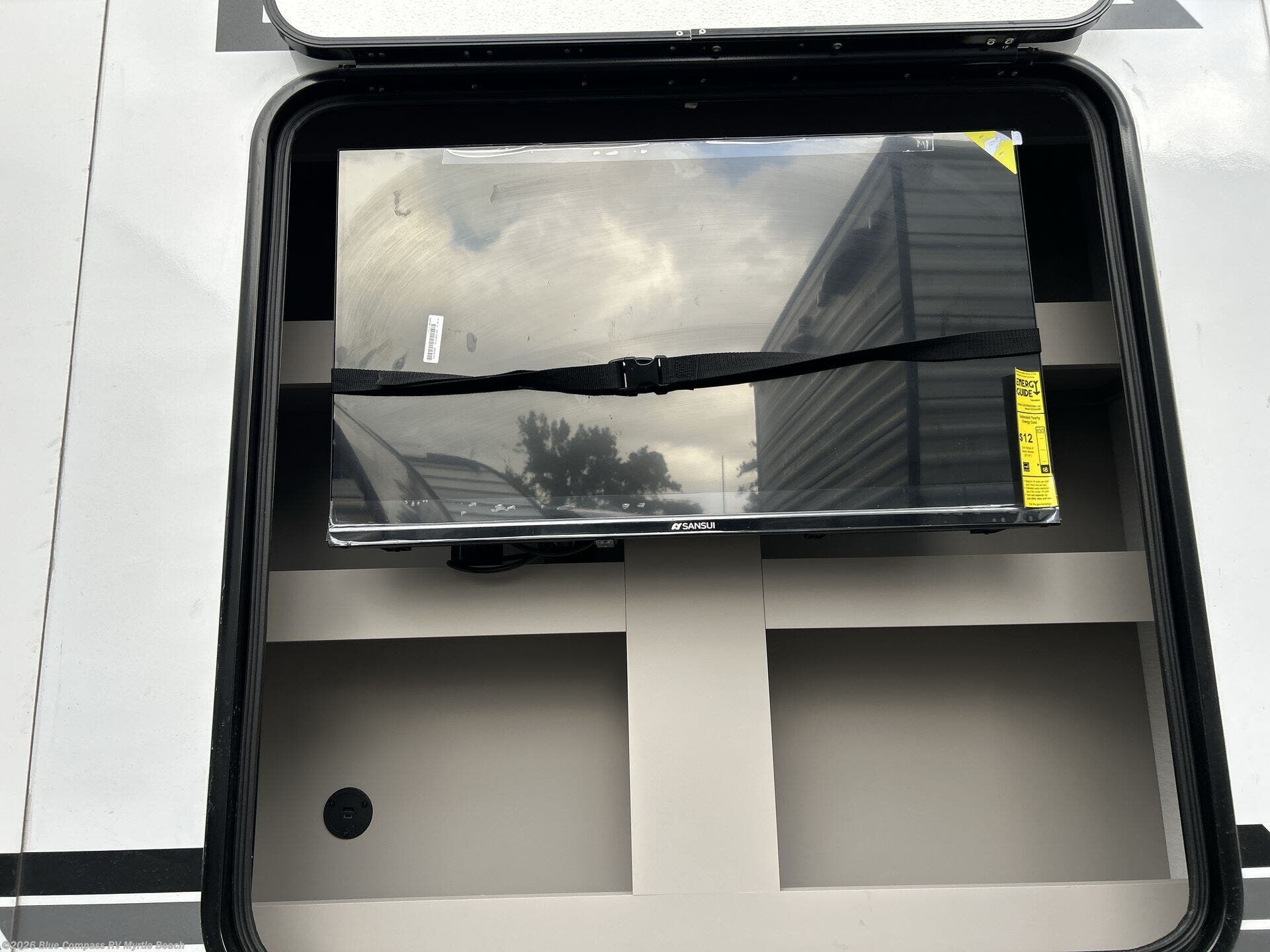Start camping in luxury with this travel trailer! Prepare your best home cooked meals in the rear kitchen with the three burner cooktop, 10 cu. ft. 12V refrigerator, tip-out trash can, and even two bar stools to enjoy your morning coffee while reading the newspaper. Freshen up in the full bathroom with the 30" x 36" shower or head outside to relax under one of the two awnings. There is even an outdoor griddle/grill underneath one of the awnings to protect you while you grill up some juicy burgers, plus an outside 32" TV. The front private bedroom has a queen bed for you to lay your head on at night and has wardrobe nightstands for your items. Relax in true comfort each night on one of the two furniture spots in front of the entertainment center with a 50" class HDTV with a fireplace below it!