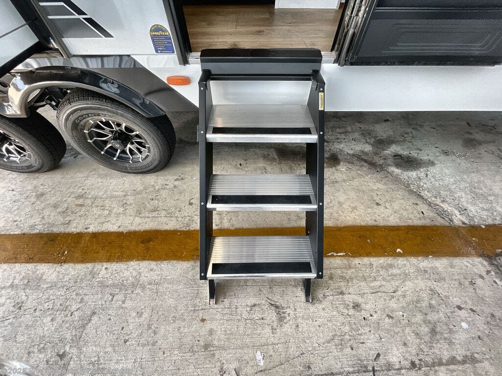 Start camping in luxury with this travel trailer! Prepare your best home cooked meals in the rear kitchen with the three burner cooktop, 10 cu. ft. 12V refrigerator, tip-out trash can, and even two bar stools to enjoy your morning coffee while reading the newspaper. Freshen up in the full bathroom with the 30" x 36" shower or head outside to relax under one of the two awnings. There is even an outdoor griddle/grill underneath one of the awnings to protect you while you grill up some juicy burgers, plus an outside 32" TV. The front private bedroom has a queen bed for you to lay your head on at night and has wardrobe nightstands for your items. Relax in true comfort each night on one of the two furniture spots in front of the entertainment center with a 50" class HDTV with a fireplace below it!