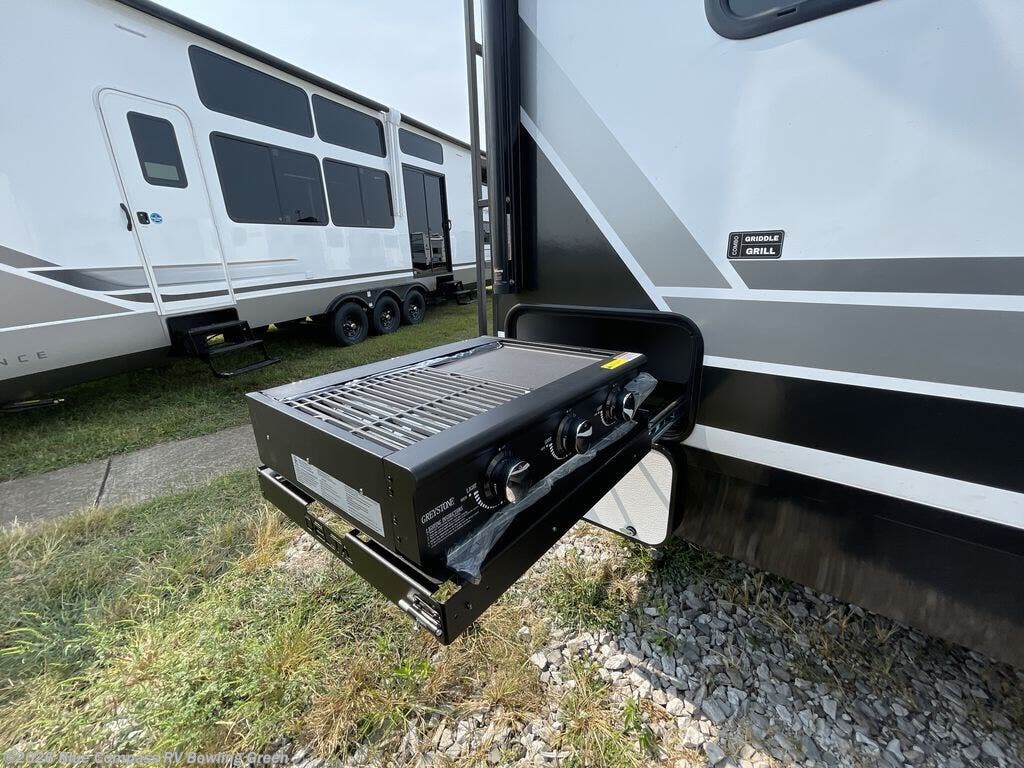 Start camping in luxury with this travel trailer! Prepare your best home cooked meals in the rear kitchen with the three burner cooktop, 10 cu. ft. 12V refrigerator, tip-out trash can, and even two bar stools to enjoy your morning coffee while reading the newspaper. Freshen up in the full bathroom with the 30" x 36" shower or head outside to relax under one of the two awnings. There is even an outdoor griddle/grill underneath one of the awnings to protect you while you grill up some juicy burgers, plus an outside 32" TV. The front private bedroom has a queen bed for you to lay your head on at night and has wardrobe nightstands for your items. Relax in true comfort each night on one of the two furniture spots in front of the entertainment center with a 50" class HDTV with a fireplace below it!