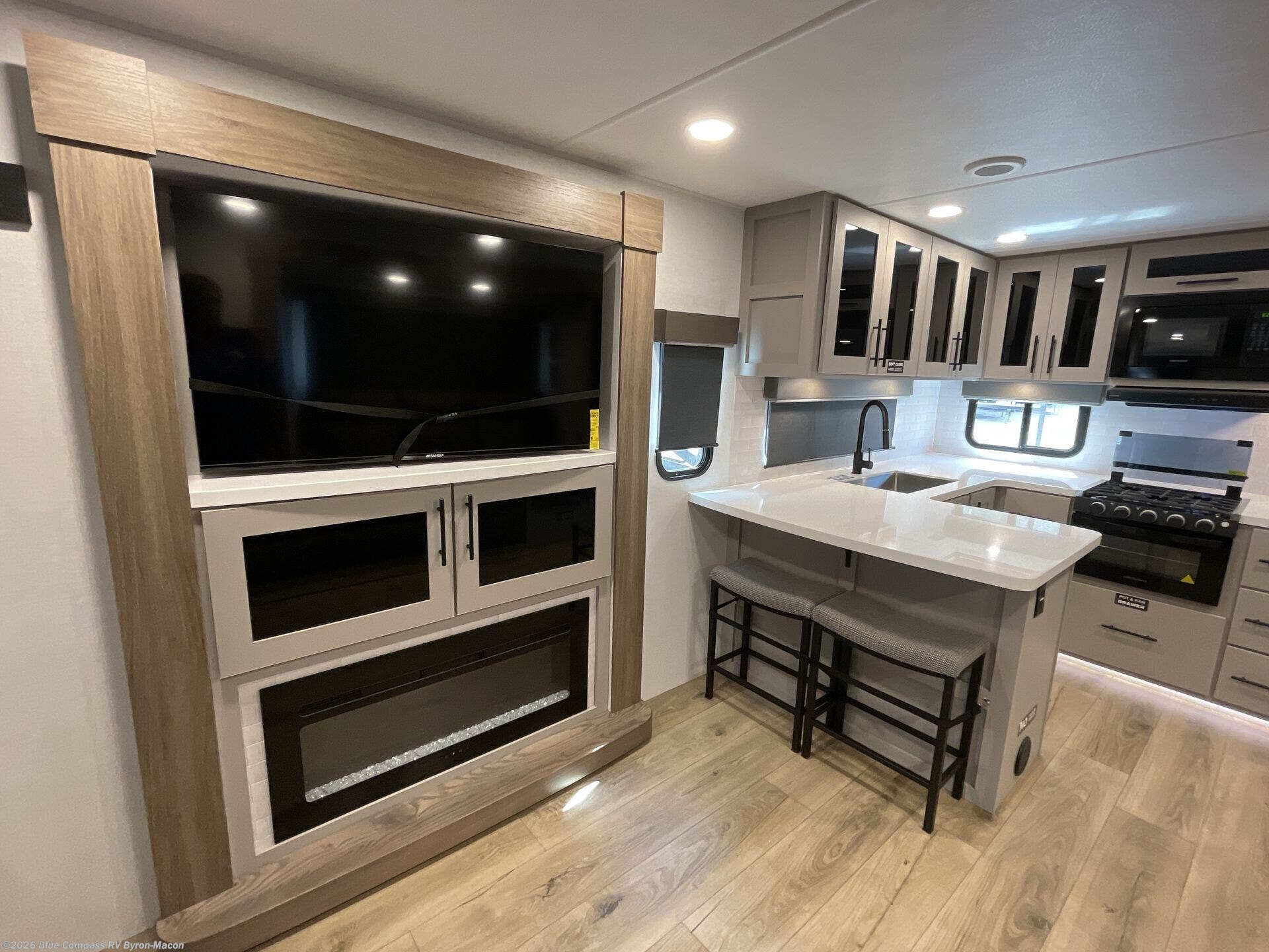 Start camping in luxury with this travel trailer! Prepare your best home cooked meals in the rear kitchen with the three burner cooktop, 10 cu. ft. 12V refrigerator, tip-out trash can, and even two bar stools to enjoy your morning coffee while reading the newspaper. Freshen up in the full bathroom with the 30" x 36" shower or head outside to relax under one of the two awnings. There is even an outdoor griddle/grill underneath one of the awnings to protect you while you grill up some juicy burgers, plus an outside 32" TV. The front private bedroom has a queen bed for you to lay your head on at night and has wardrobe nightstands for your items. Relax in true comfort each night on one of the two furniture spots in front of the entertainment center with a 50" TV with a fireplace below it!