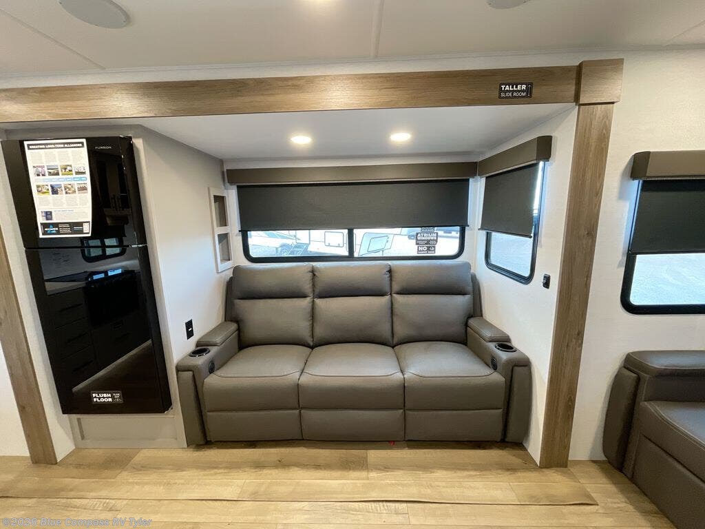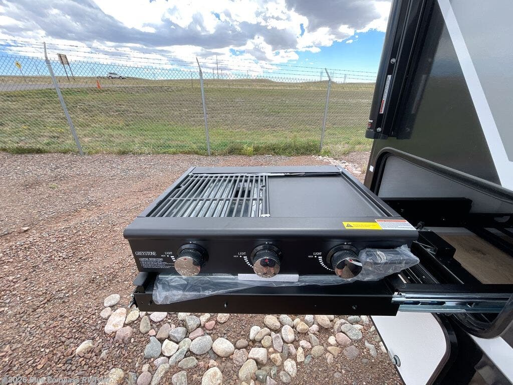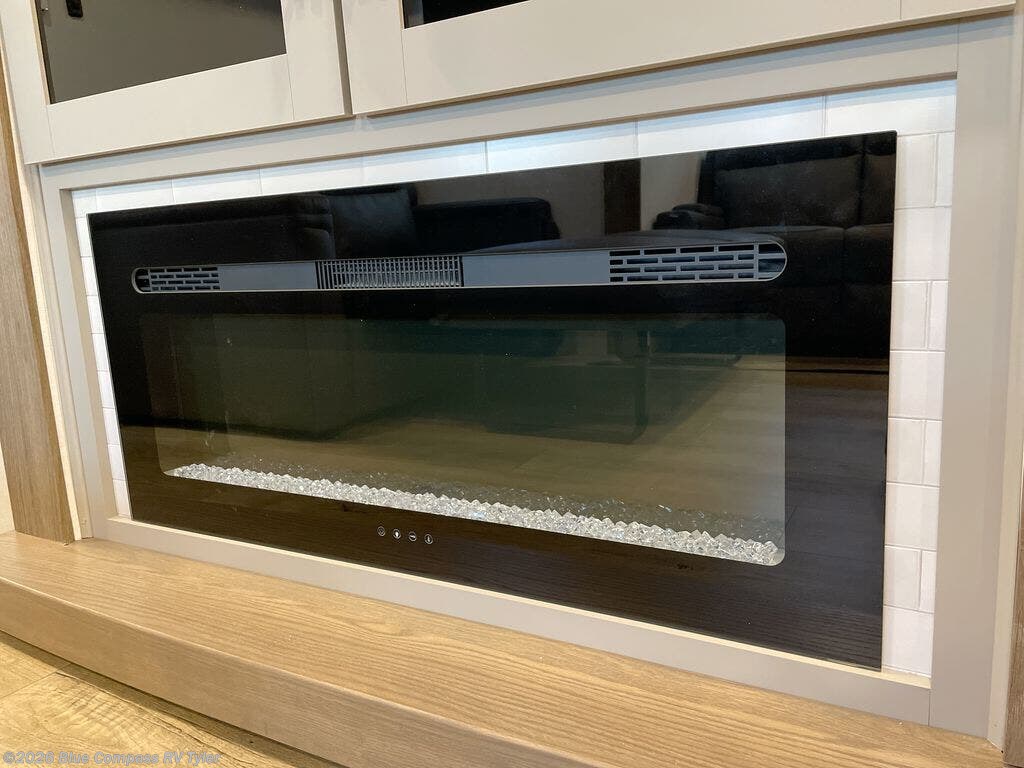 Start camping in luxury with this travel trailer! Prepare your best home cooked meals in the rear kitchen with the three burner cooktop, 10 cu. ft. 12V refrigerator, tip-out trash can, and even two bar stools to enjoy your morning coffee while reading the newspaper. Freshen up in the full bathroom with the 30" x 36" shower or head outside to relax under one of the two awnings. There is even an outdoor griddle/grill underneath one of the awnings to protect you while you grill up some juicy burgers, plus an outside 32" TV. The front private bedroom has a queen bed for you to lay your head on at night and has wardrobe nightstands for your items. Relax in true comfort each night on one of the two furniture spots in front of the entertainment center with a 50" class HDTV with a fireplace below it!