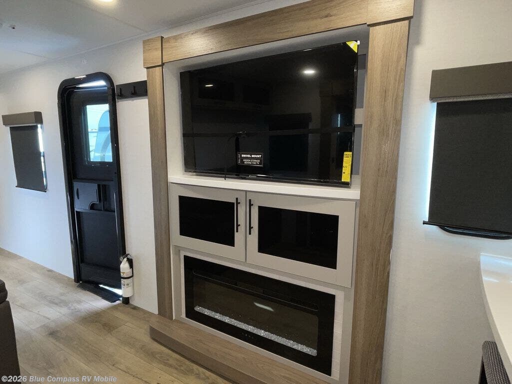 Start camping in luxury with this travel trailer! Prepare your best home cooked meals in the rear kitchen with the three burner cooktop, 10 cu. ft. 12V refrigerator, tip-out trash can, and even two bar stools to enjoy your morning coffee while reading the newspaper. Freshen up in the full bathroom with the 30" x 36" shower or head outside to relax under one of the two awnings. There is even an outdoor griddle/grill underneath one of the awnings to protect you while you grill up some juicy burgers, plus an outside 32" TV. The front private bedroom has a queen bed for you to lay your head on at night and has wardrobe nightstands for your items. Relax in true comfort each night on one of the two furniture spots in front of the entertainment center with a 50" class HDTV with a fireplace below it!