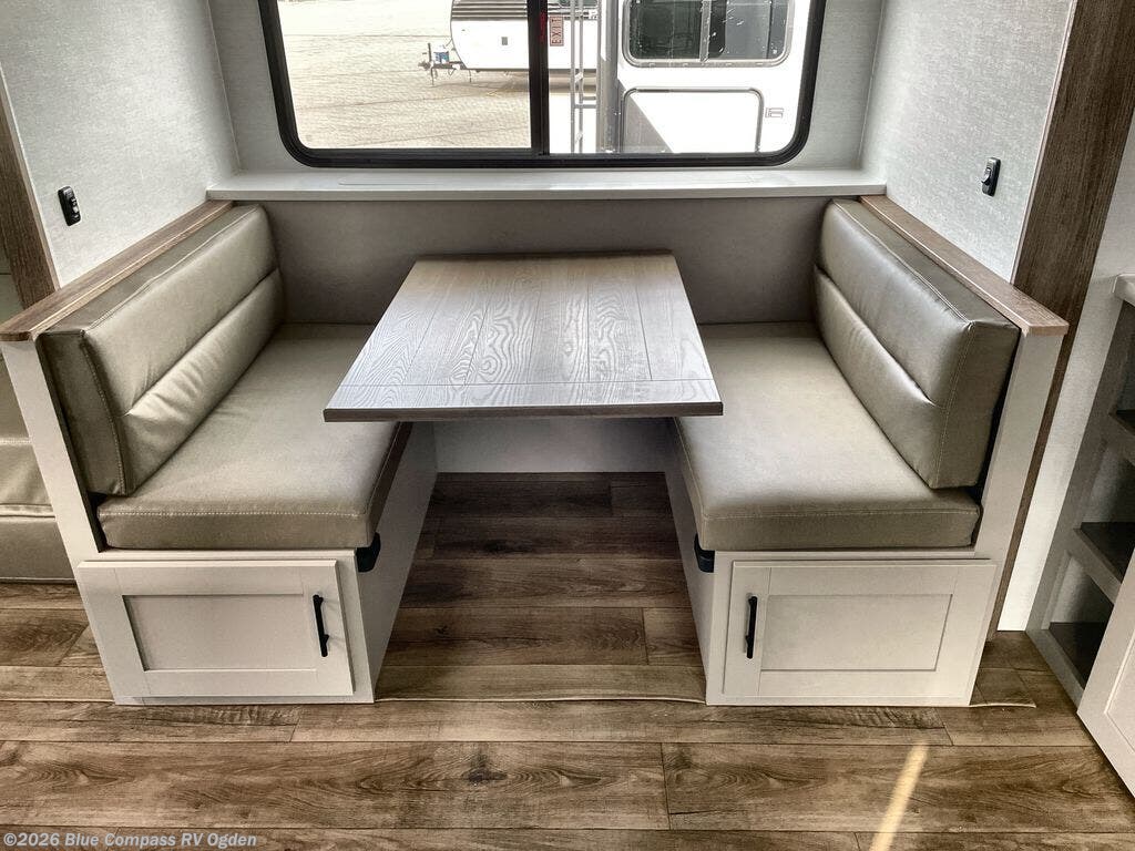 Enjoy glamping in this spacious travel trailer for eight! Your guests or the kids will love the rear bunkhouse with 40" x 72" bunk beds across from a third bunk with a cube sofa below, and the slide out will make this space more open. The slide out also includes the booth dinette in the main living area, which is across from the sofa slide out. The chef will love cooking in this Delta kitchen with generous counter space, a 10 cu. ft. 12V refrigerator, plus pull-out pantry trays for dry goods and snacks. The full bath with a 30" x 36" shower and a soft close porcelain foot flush toilet will allow you to fresh up each day without having to use the camp's facilities. And don't overlook the front private bedroom with a queen bed, wardrobe nightstands, a third wardrobe plus overhead storage; now nothing has to get left behind!