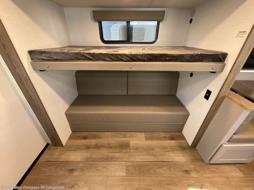 Enjoy glamping in this spacious travel trailer for eight! Your guests or the kids will love the rear bunkhouse with 40" x 72" bunk beds across from a third bunk with a cube sofa below, and the slide out will make this space more open. The slide out also includes the booth dinette in the main living area, which is across from the sofa slide out. The chef will love cooking in this Delta kitchen with generous counter space, a 10 cu. ft. 12V refrigerator, plus pull-out pantry trays for dry goods and snacks. The full bath with a 30" x 36" shower and a soft close porcelain foot flush toilet will allow you to fresh up each day without having to use the camp's facilities. And don't overlook the front private bedroom with a queen bed, wardrobe nightstands, a third wardrobe plus overhead storage; now nothing has to get left behind!