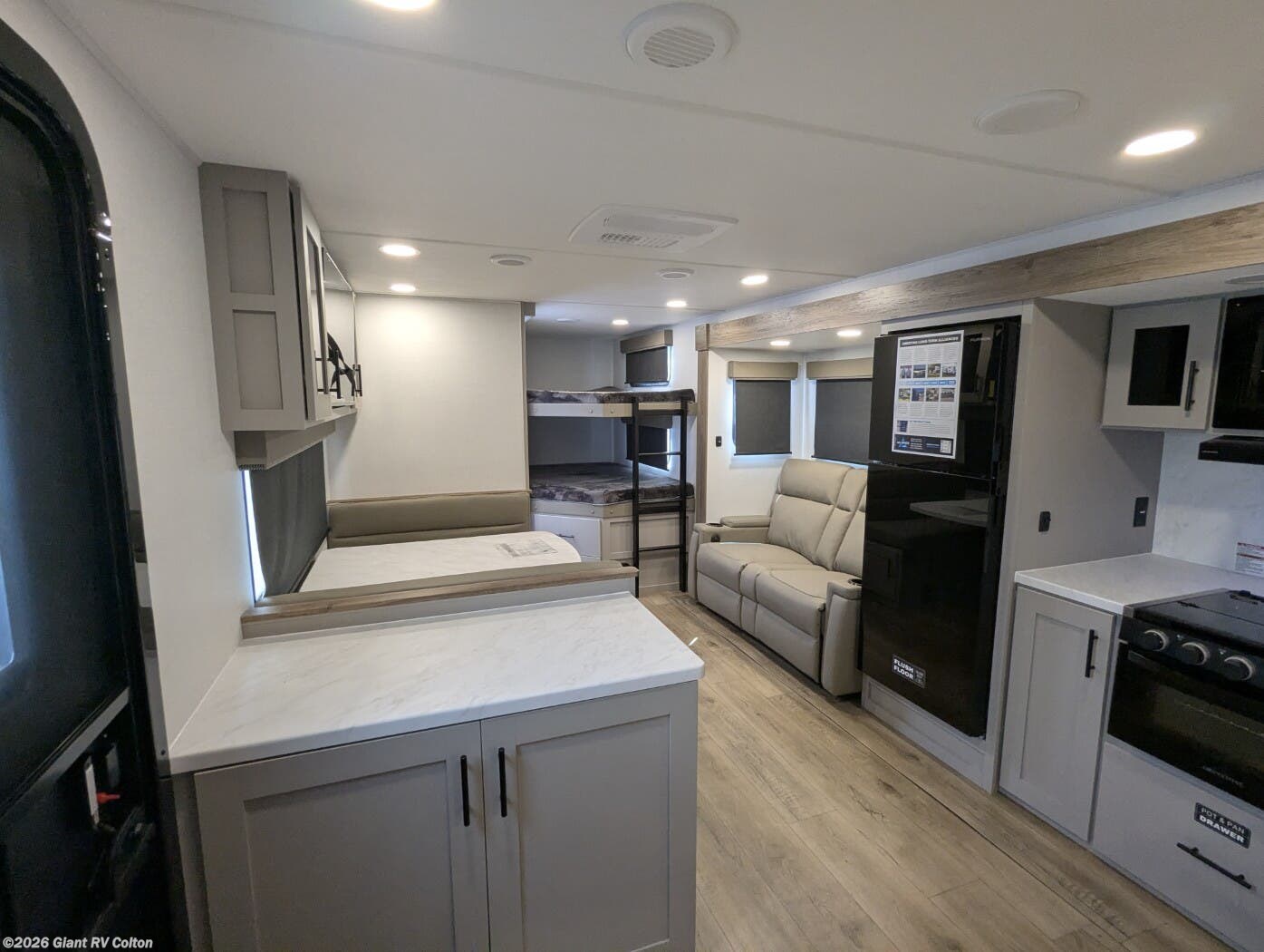 • Family Bunkhouse Layout with rear bunks, a front queen bed, and convertible dinette/sofa — providing flexible sleeping for families or guests.