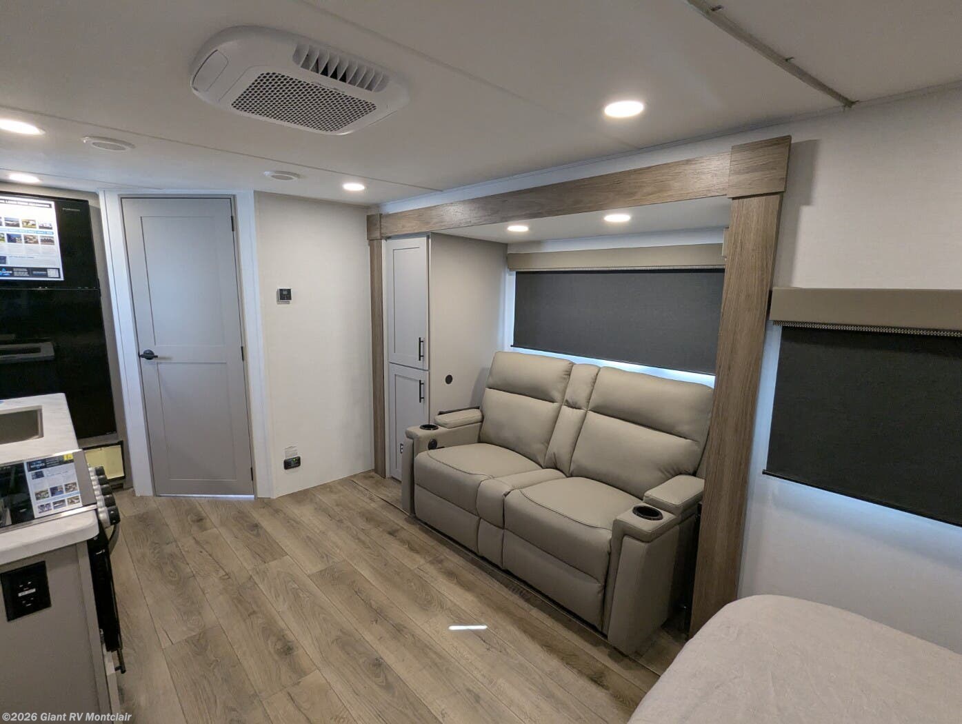 • Slide-Out Living Area with Theater Seating & Fireplace creating an open interior with oversized atrium windows and a comfortable lounge space for relaxing