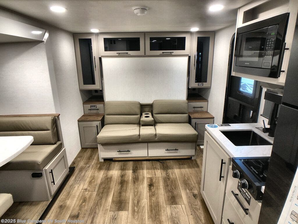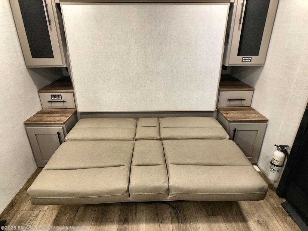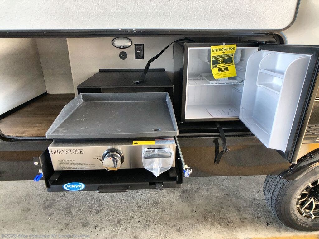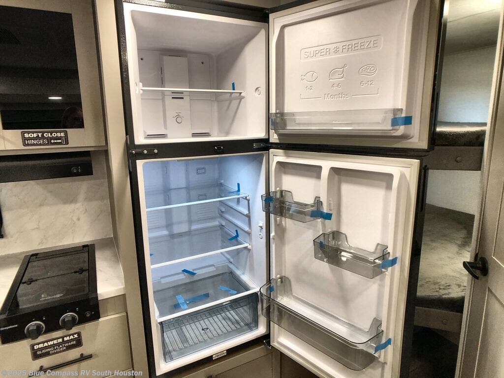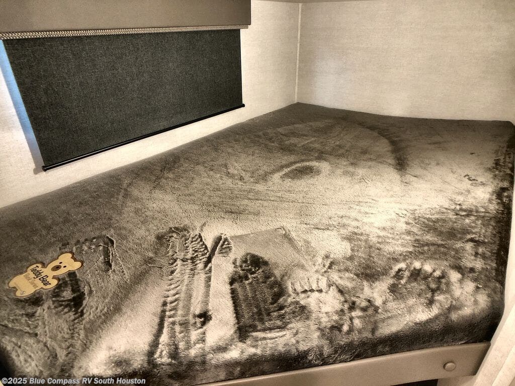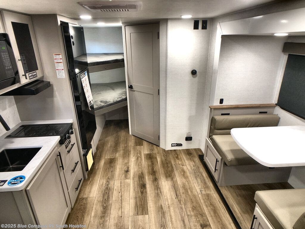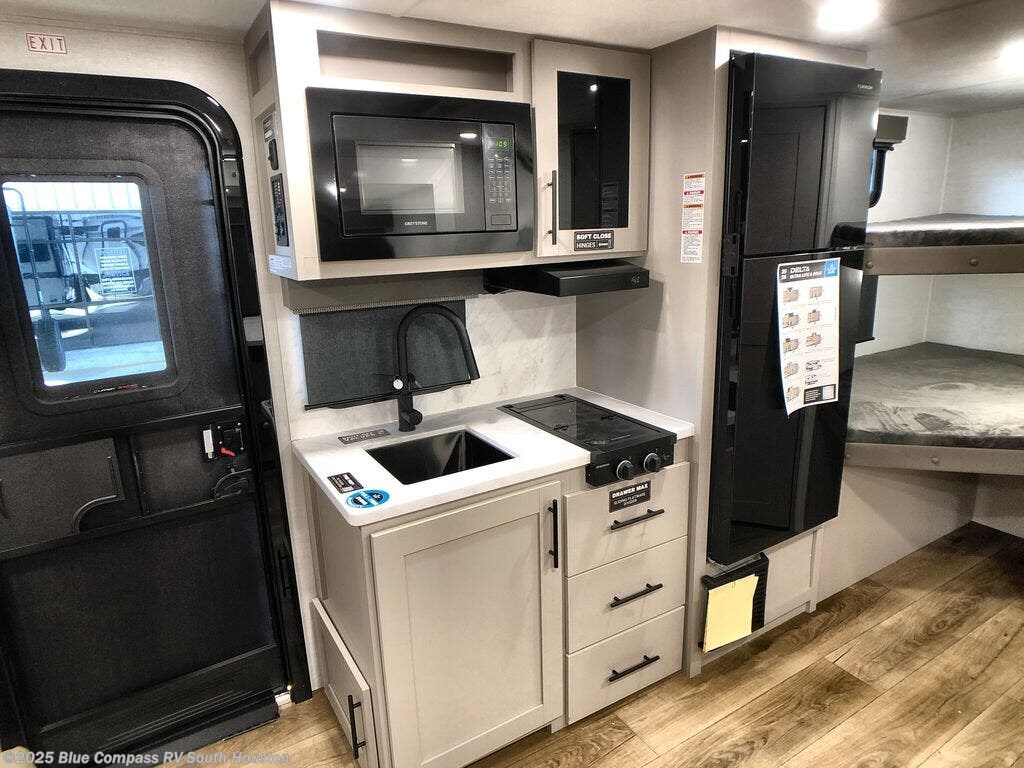 Step inside through the solid step entry and you'll be greeted by a cozy queen bed, perfect for a restful night’s sleep. In between wardrobe nightstands and topped with overhead storage, there’s plenty of room for your clothes and essentials. For added versatility, the bed converts into a 60" jack knife sofa, providing extra seating when needed. The slide out features a dinette that offers additional space, a comfy sleeping area, and a spot to enjoy meals. Across from the dinette, the kitchen is fully equipped with a 10-cu. ft. refrigerator, two-burner cooktop, sink, and microwave, everything you need to prepare your favorite dishes. At the rear corner, you’ll find even more sleeping space with dual 46" x 74" bunks, right next to a full bathroom complete with a 30" x 36" shower for added comfort and convenience.