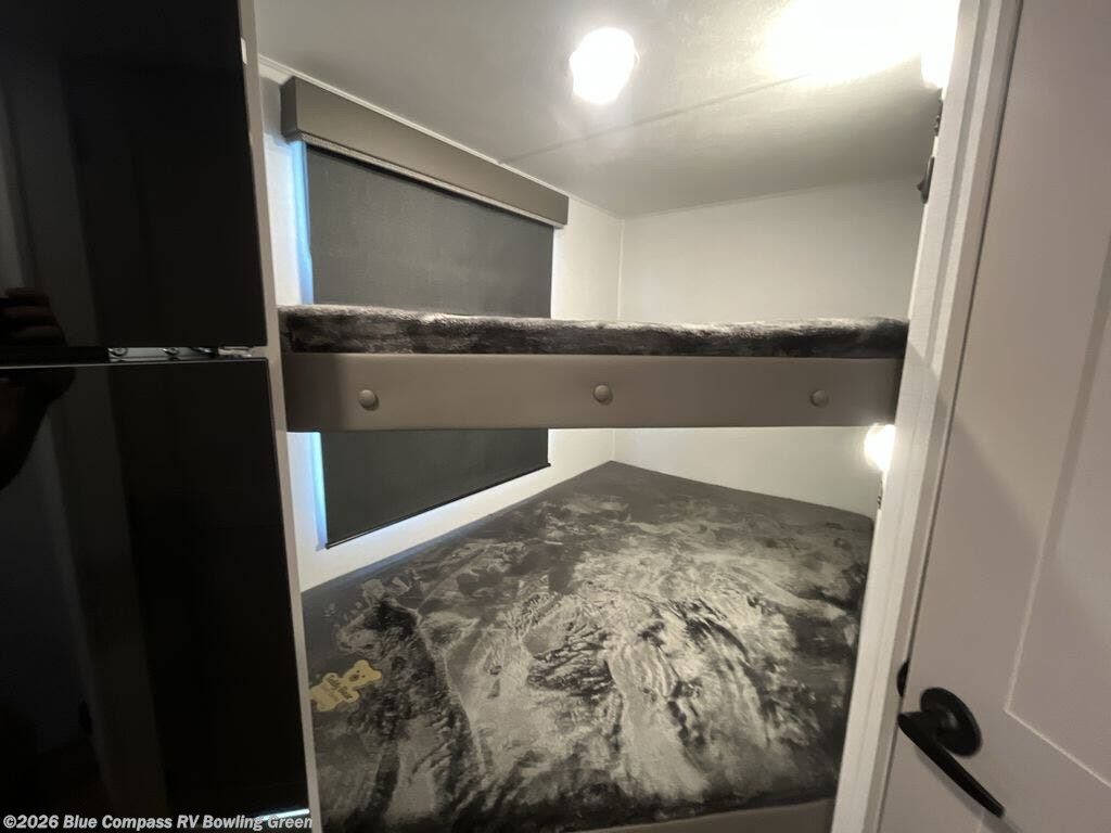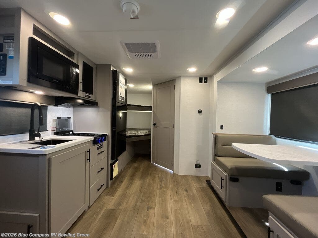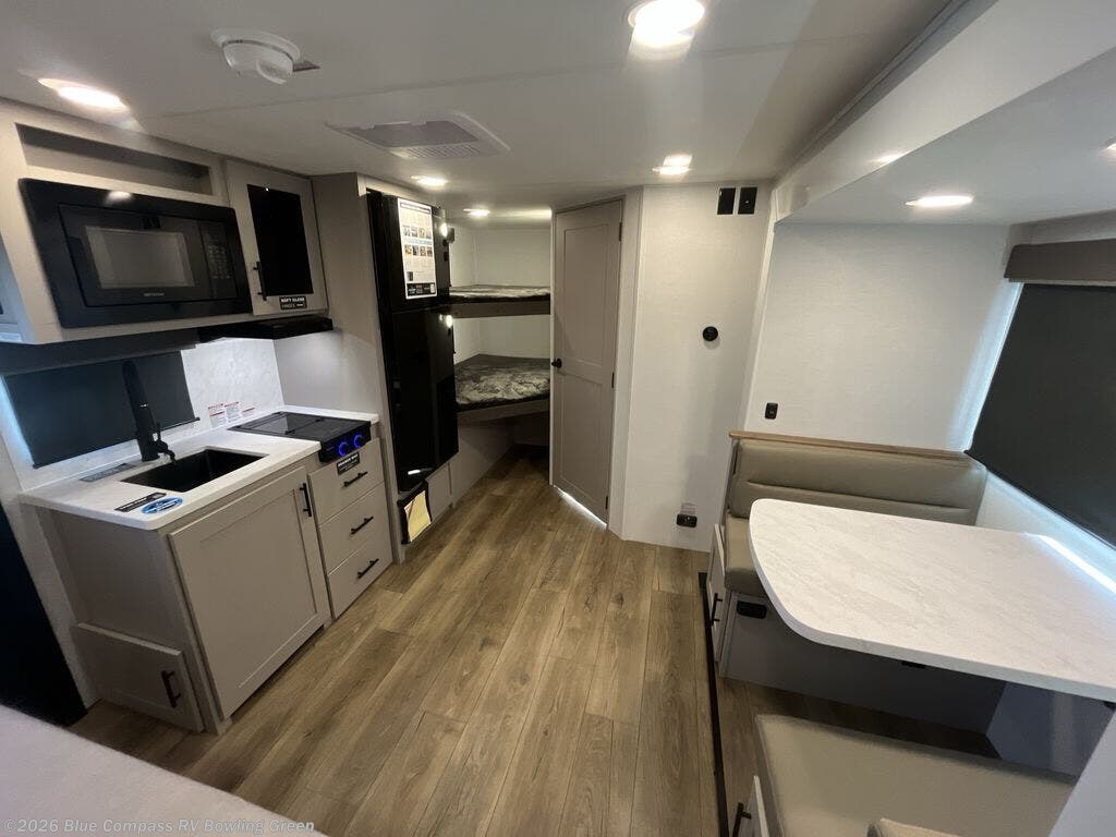 Step inside through the solid step entry and you'll be greeted by a cozy queen bed, perfect for a restful night’s sleep. In between wardrobe nightstands and topped with overhead storage, there’s plenty of room for your clothes and essentials. For added versatility, the bed converts into a 60" jack knife sofa, providing extra seating when needed. The slide out features a dinette that offers additional space, a comfy sleeping area, and a spot to enjoy meals. Across from the dinette, the kitchen is fully equipped with a 10-cu. ft. refrigerator, two-burner cooktop, sink, and microwave, everything you need to prepare your favorite dishes. At the rear corner, you’ll find even more sleeping space with dual 46" x 74" bunks, right next to a full bathroom complete with a 30" x 36" shower for added comfort and convenience.