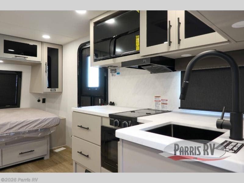 Enter this thoughtfully designed trailer through the 28" entry and step into a space that blends comfort and functionality. At the front, a 60" x 80" queen bed offers restful sleep, complete with a wardrobe at the foot and overhead storage. The center features an L-shaped kitchen equipped with a sink, 2-burner cooktop, overhead cabinets, and a 32-inch TV, while directly across, a 10-cu. ft. refrigerator and a slide out with a 60" jackknife sofa maximize space and convenience. At the rear, enjoy a full bathroom with a 30" x 36" shower, toilet, sink, linen shelves, and additional overhead storage making this compact trailer feel like home wherever you go.