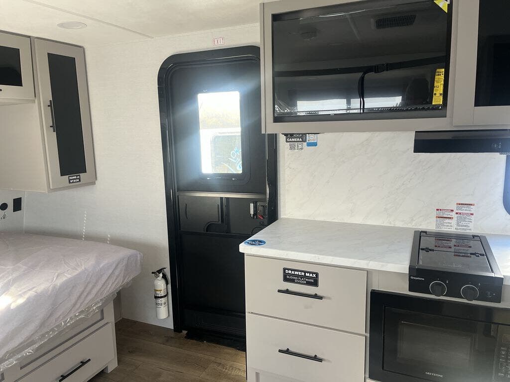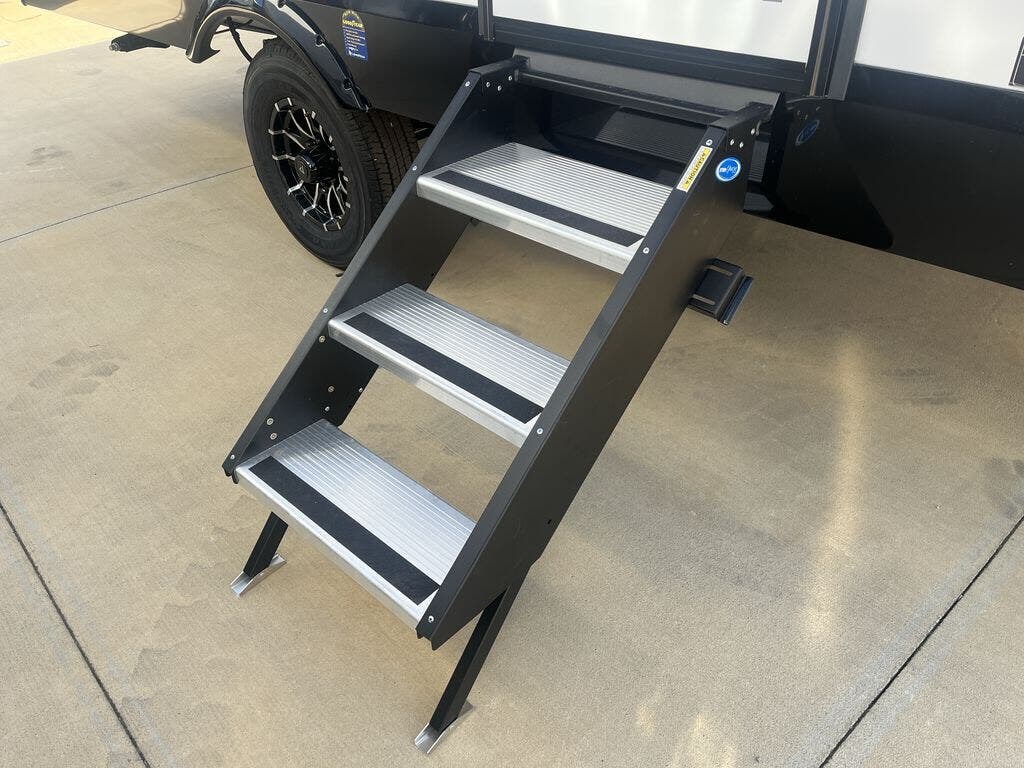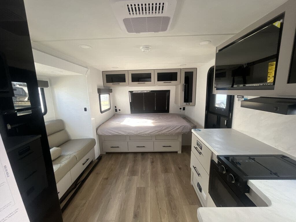 Each Delta Solo model is designed to deliver both comfort and convenience in a compact footprint. Inside, you'll find residential-style touches like can-style LED ceiling lights, durable cabinet doors with magnetic catches, and commercial-grade vinyl flooring built to last. On the exterior, practical travel features include easy-access switches for the slide-out and awning, sturdy Step Above fold-out entry steps, and color-coded, numbered wiring for simplified maintenance and troubleshooting.