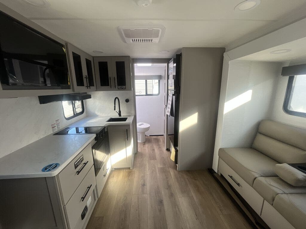 Enter this thoughtfully designed trailer through the 28" entry and step into a space that blends comfort and functionality. At the front, a 60" x 80" queen bed offers restful sleep, complete with a wardrobe at the foot and overhead storage. The center features an L-shaped kitchen equipped with a sink, 2-burner cooktop, overhead cabinets, and a 32-inch TV, while directly across, a 10-cu. ft. refrigerator and a slide out with a 60" jackknife sofa maximize space and convenience. At the rear, enjoy a full bathroom with a 30" x 36" shower, toilet, sink, linen shelves, and additional overhead storage making this compact trailer feel like home wherever you go.
