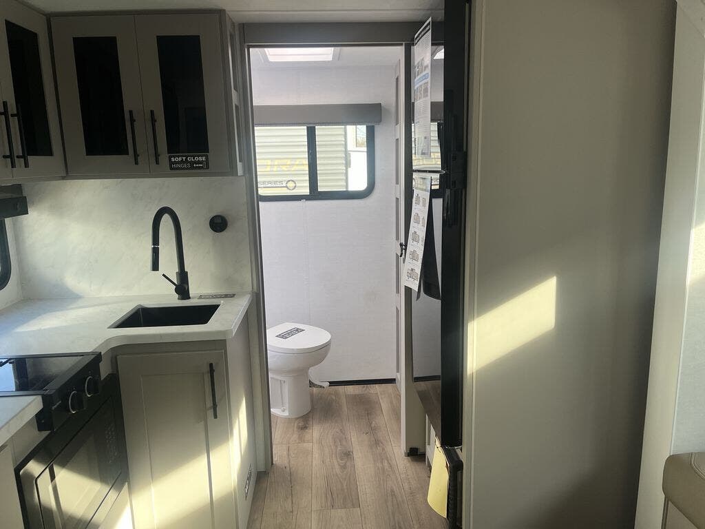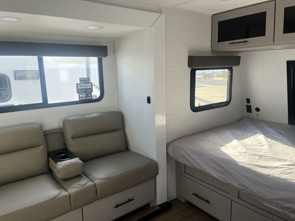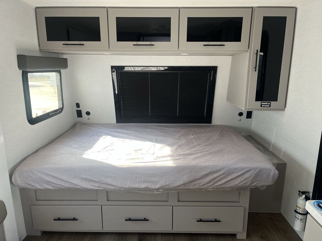 Enter this thoughtfully designed trailer through the 28" entry and step into a space that blends comfort and functionality. At the front, a 60" x 80" queen bed offers restful sleep, complete with a wardrobe at the foot and overhead storage. The center features an L-shaped kitchen equipped with a sink, 2-burner cooktop, overhead cabinets, and a 32-inch TV, while directly across, a 10-cu. ft. refrigerator and a slide out with a 60" jackknife sofa maximize space and convenience. At the rear, enjoy a full bathroom with a 30" x 36" shower, toilet, sink, linen shelves, and additional overhead storage making this compact trailer feel like home wherever you go.